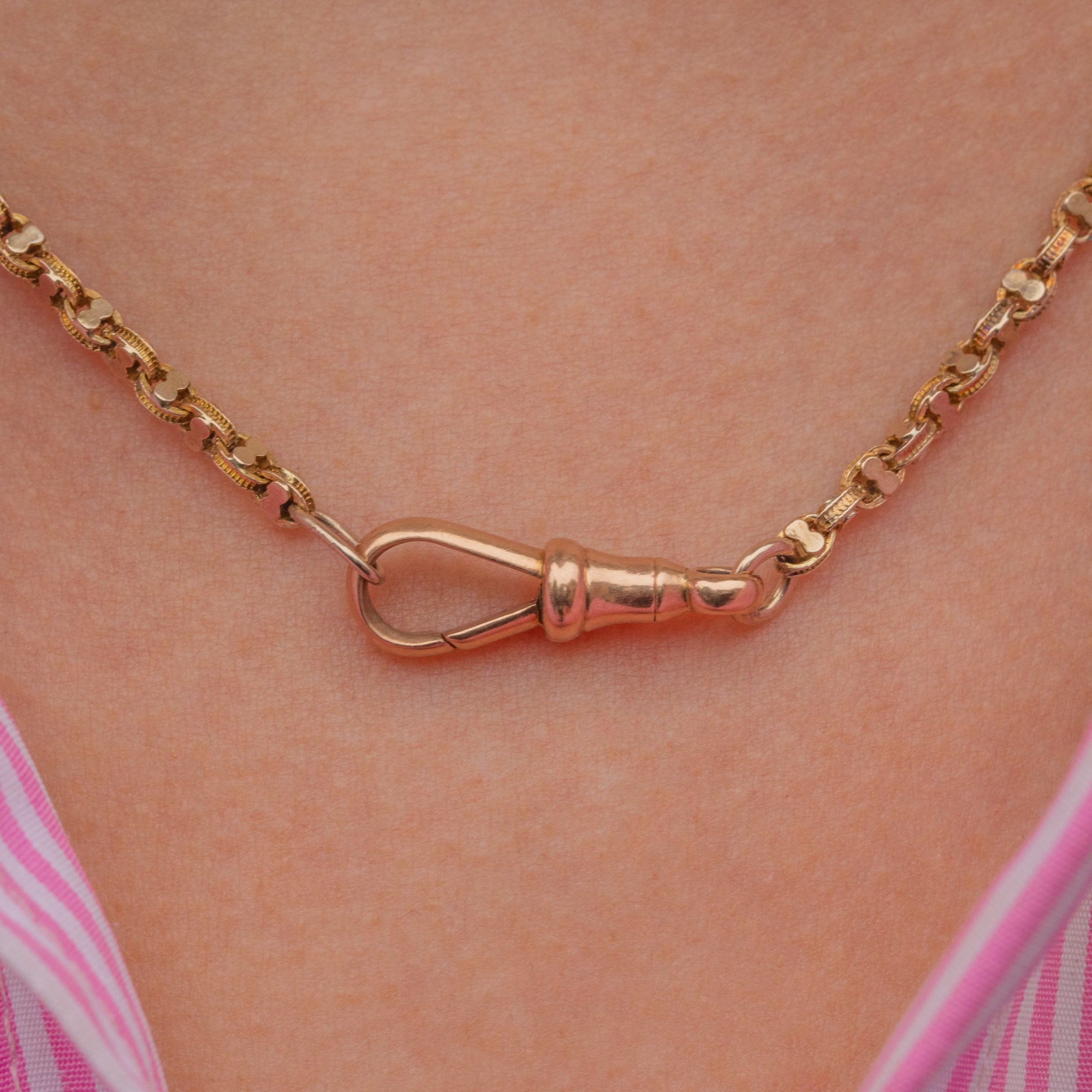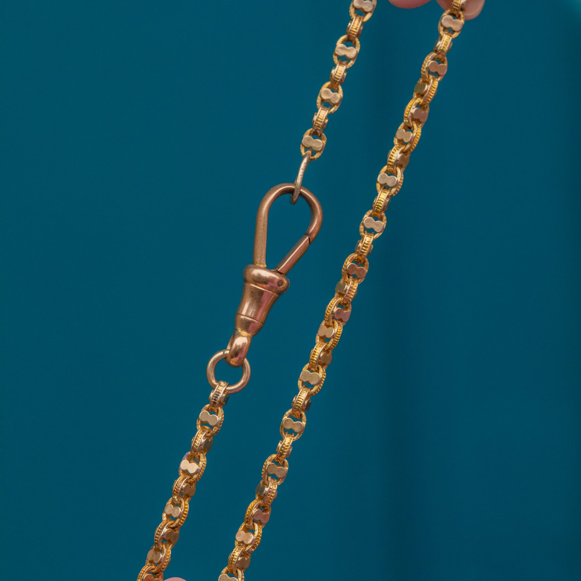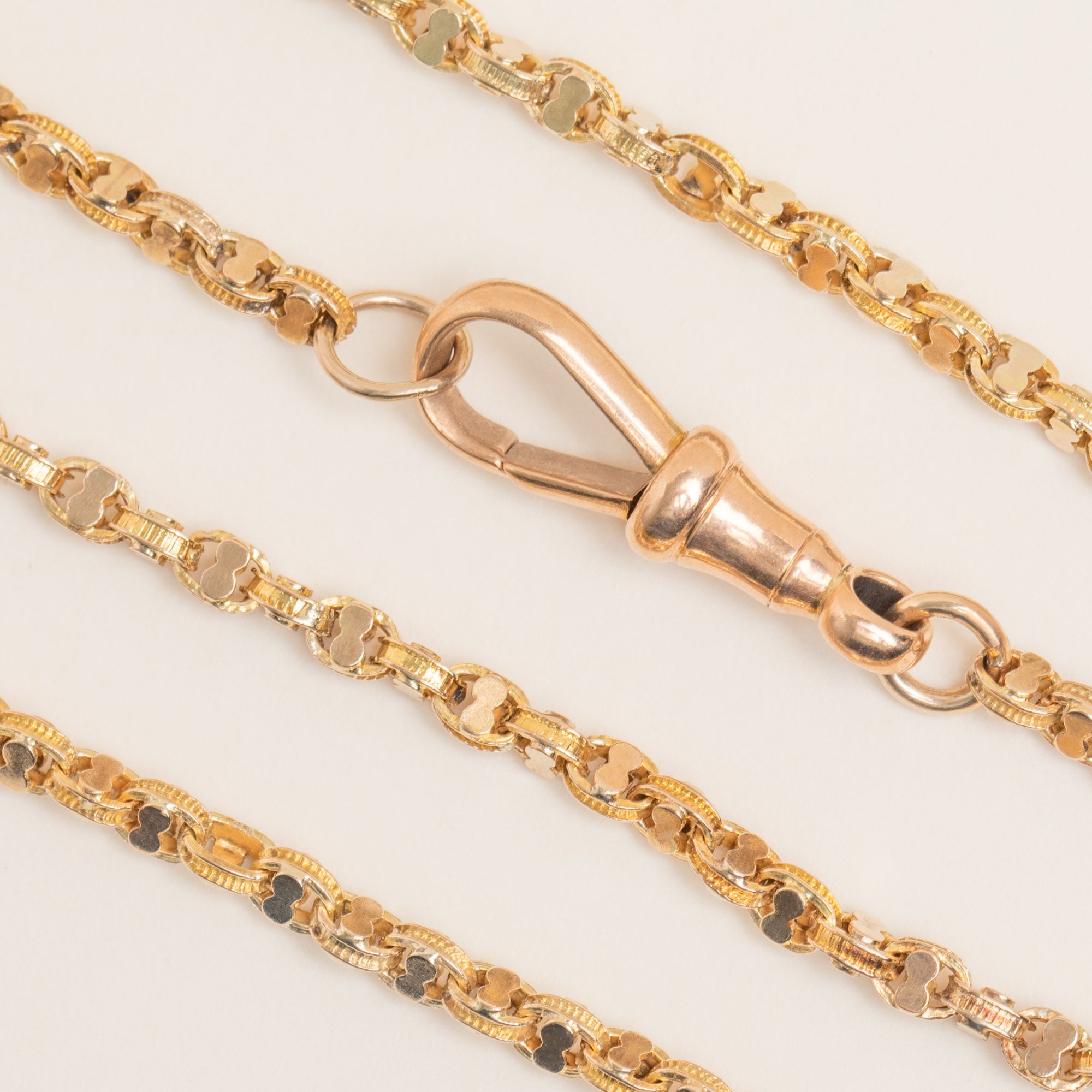 EXCELLENT. We are pleased to present this 18" antique 9ct Gold fancy link chain in superb condition. The warm, saturated Gold links are uniform and secure, flowing effortlessly and gleaming in the light. She is secured with a coveted dog-clip which fastens easily and securely, allowing for comfortable and confident wear. In such great condition, this Victorian fancy link chain is a must-have!