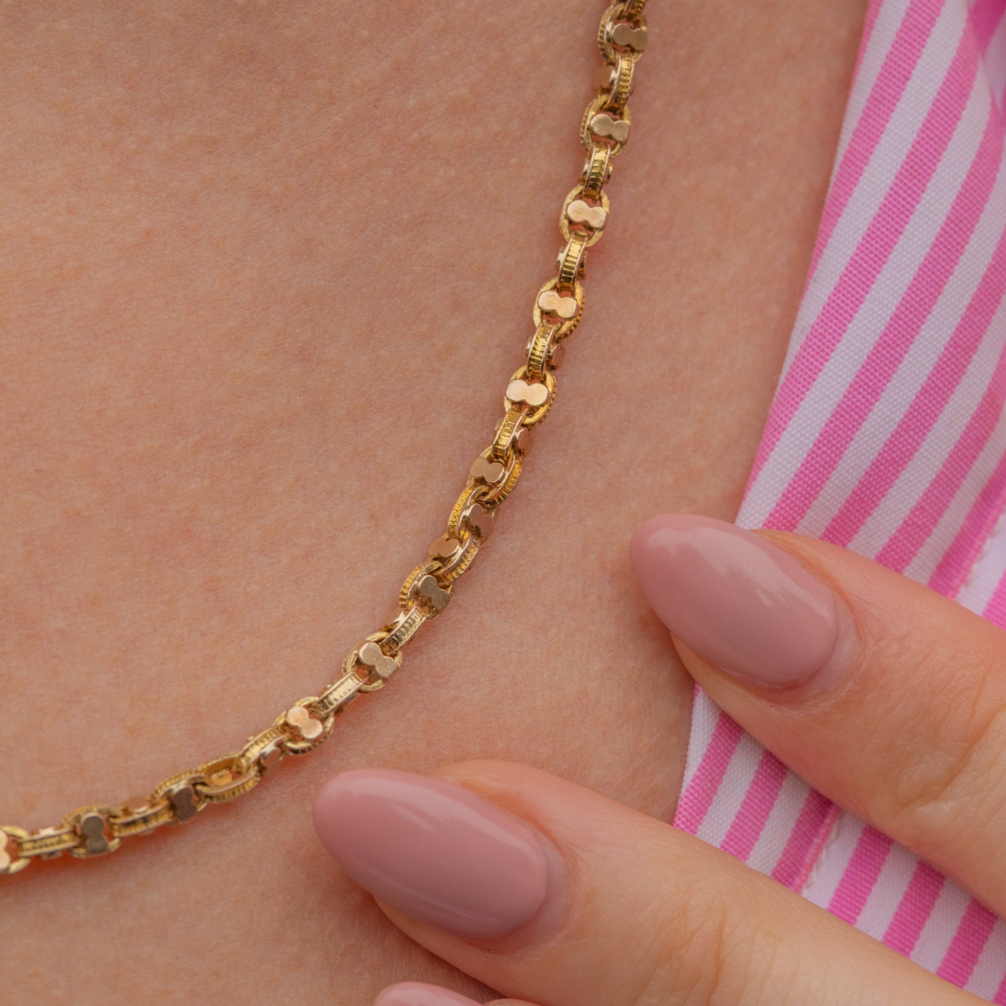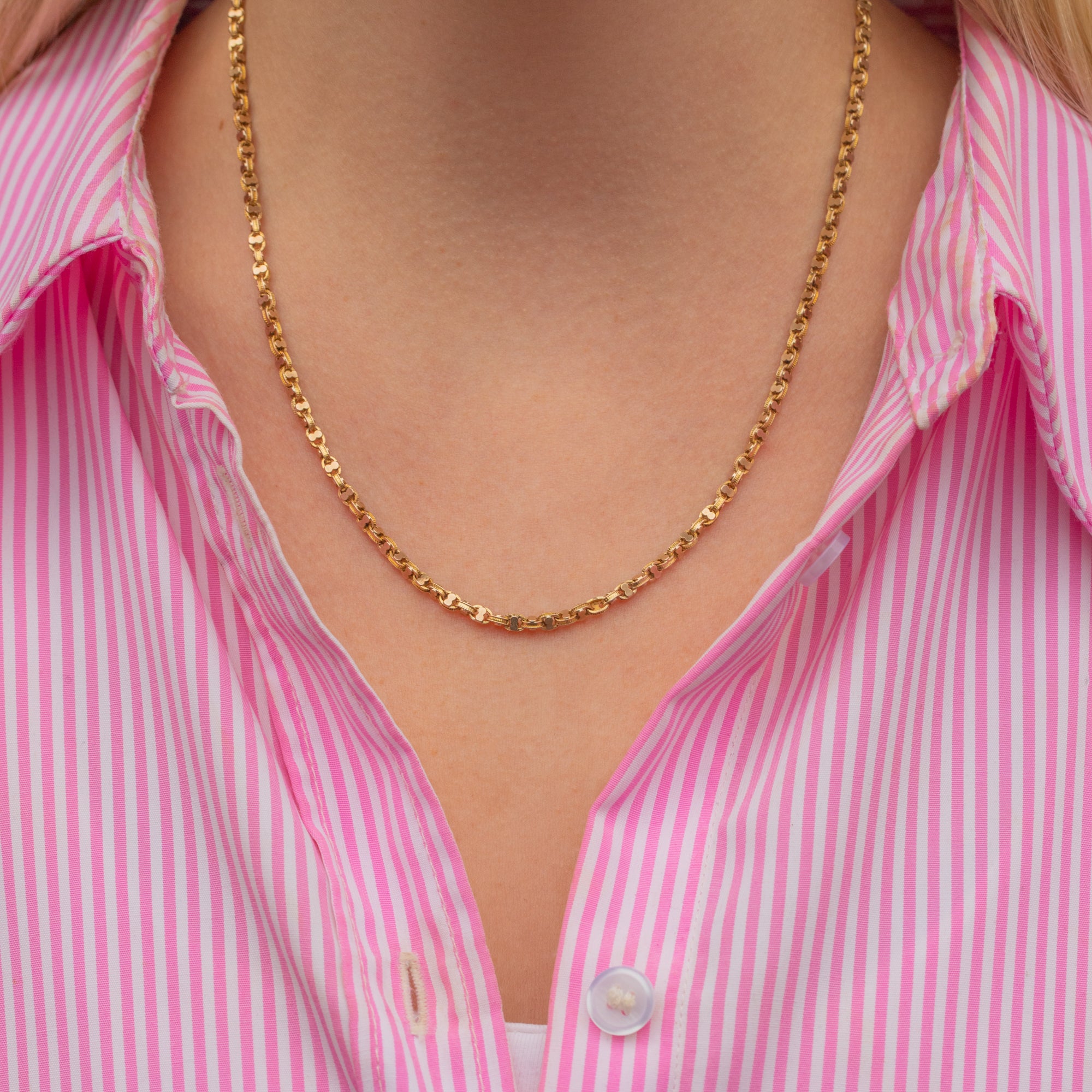 Each link is wonderfully detailed and will send golden glimmers cascading across your décolletage when they catch the light. At a desirable length of 18", she is the ideal go-to piece for suspending charms and pendants, or simply to be worn alone to add a flash of Gold to your outfit!