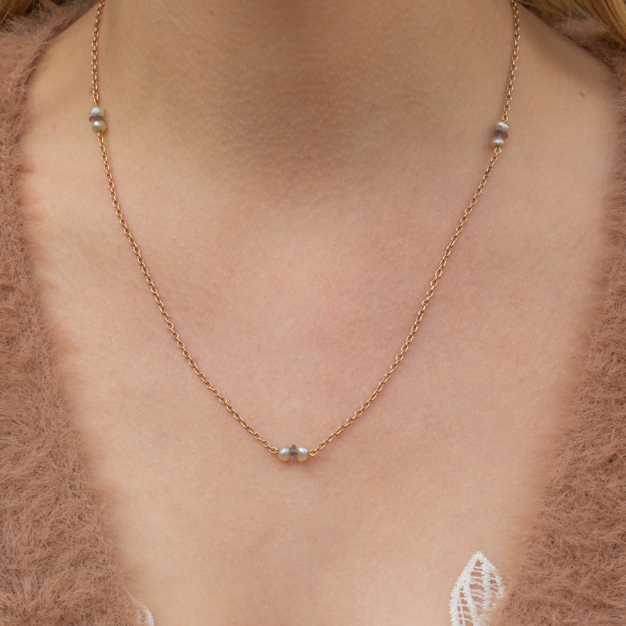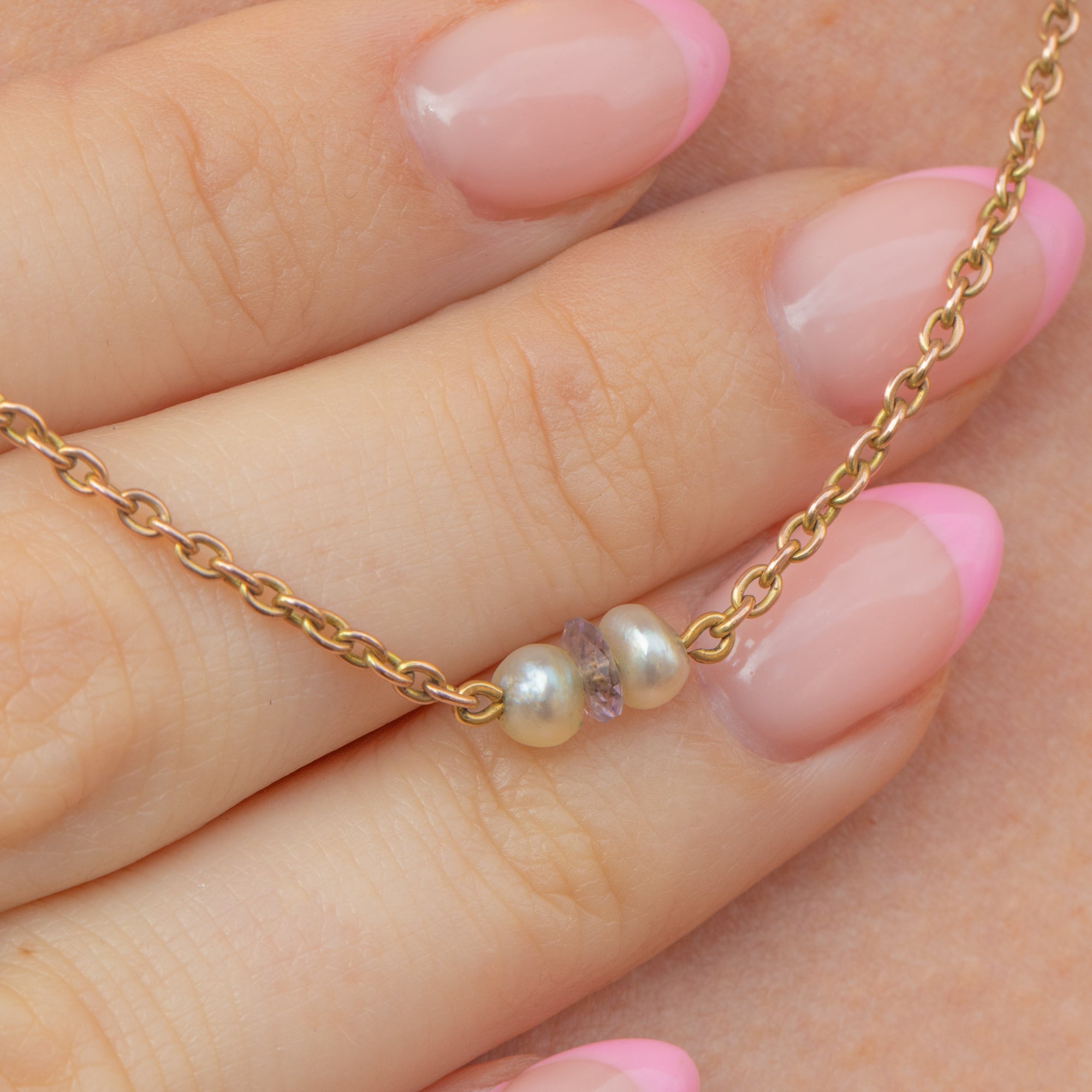 Bring simplicity and splendour to your neck stack with this antique 9ct Gold Pearl and Amethyst necklace! Her 18 inch length is formed of slender belcher links homing a faceted Amethyst nestled between two shimmering Pearls.
