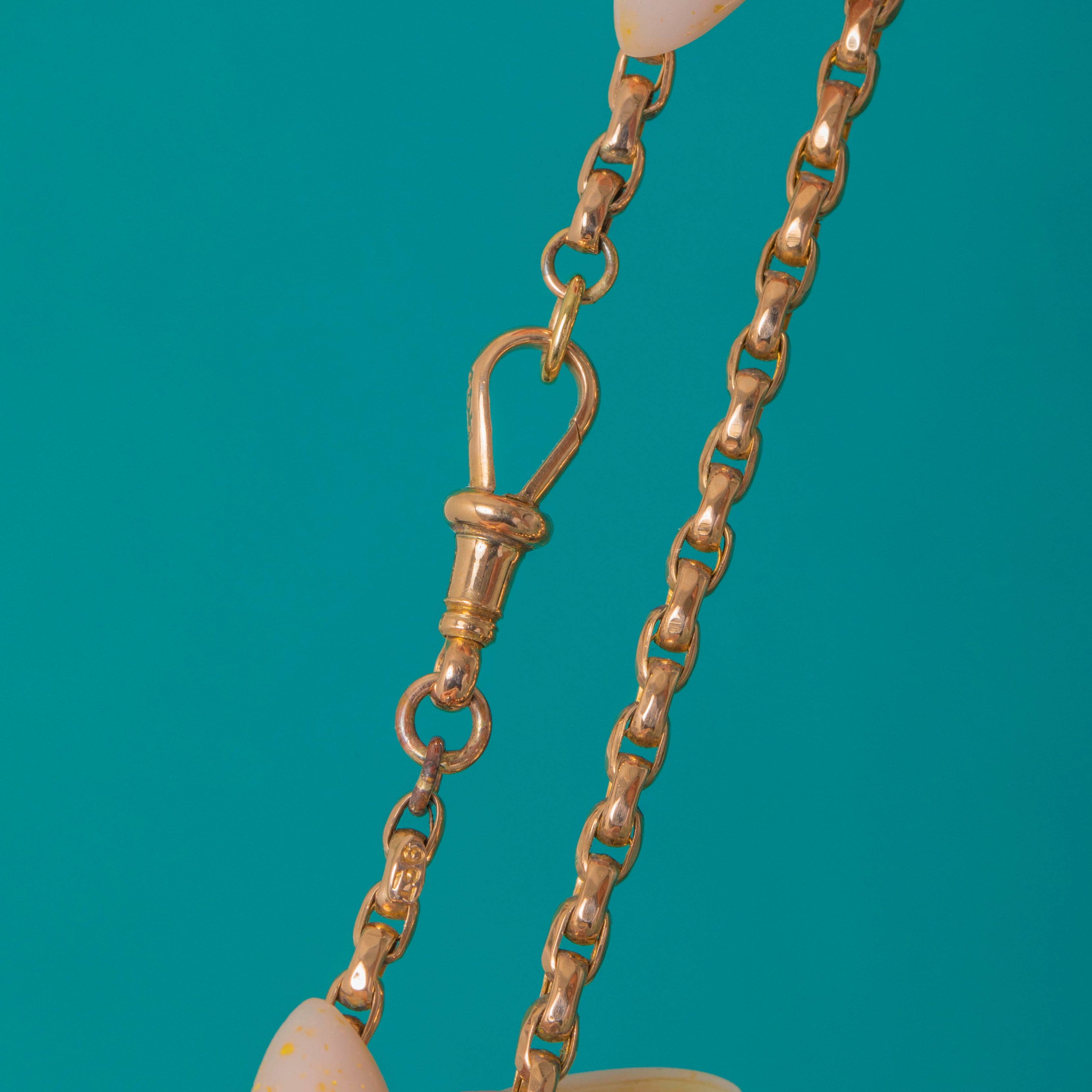EXCELLENT: Links are well-formed and secure with light surface wear and fine scratches commensurate with age. The Gold has a rich tone with minor patina and subtle darkening in crevices. The swivel dog clip fastens securely with no visible breaks or repairs.