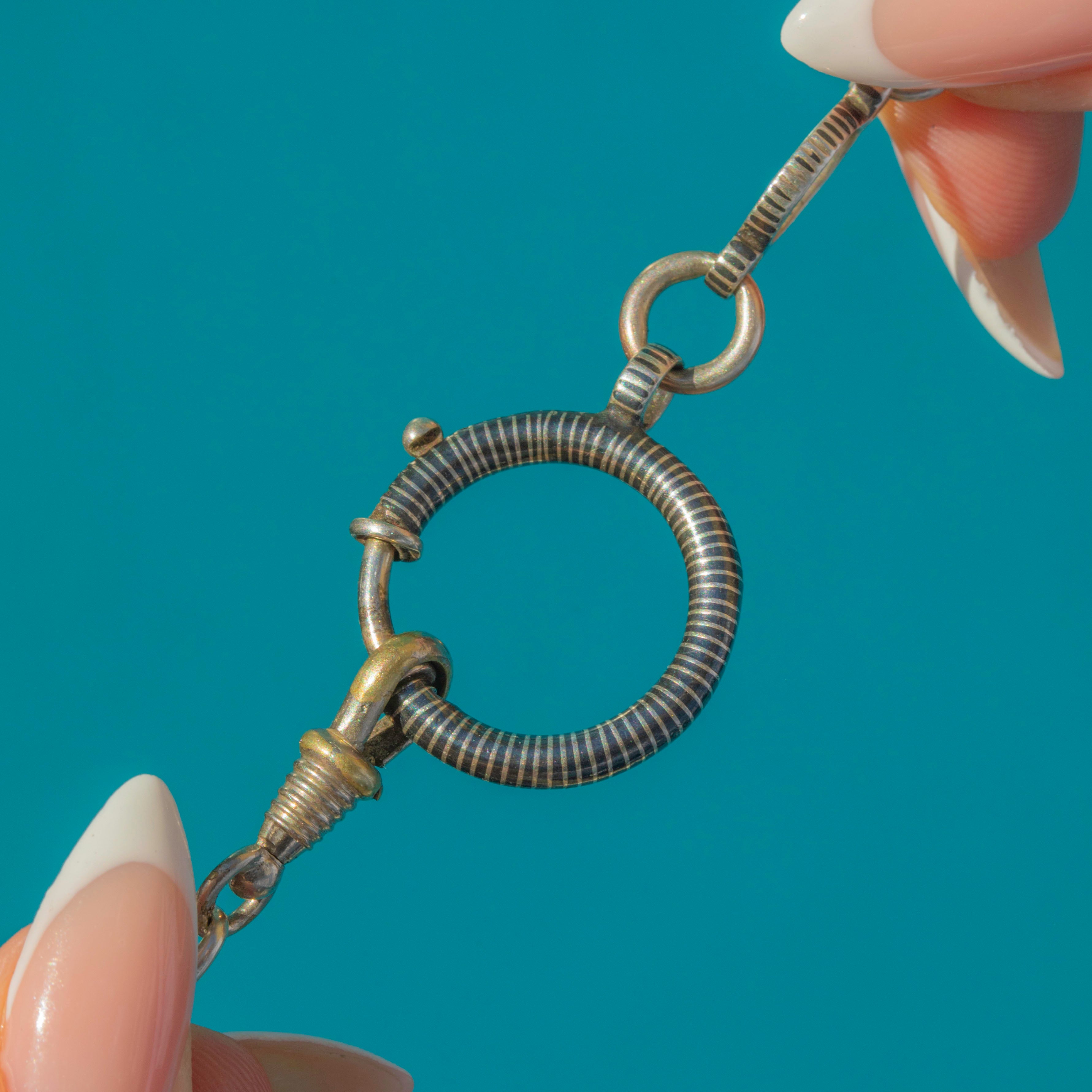 A handsome Victorian Niello chain in Sterling Silver, composed of elongated ribbed oval links alternating with short curb sections and finished with a bold Niello bolt ring. The inlay shows that distinctive graphite sheen against warm silver, giving effortless texture and a subtly industrial edge. An easy everyday necklace with authentic 19th-century character.
