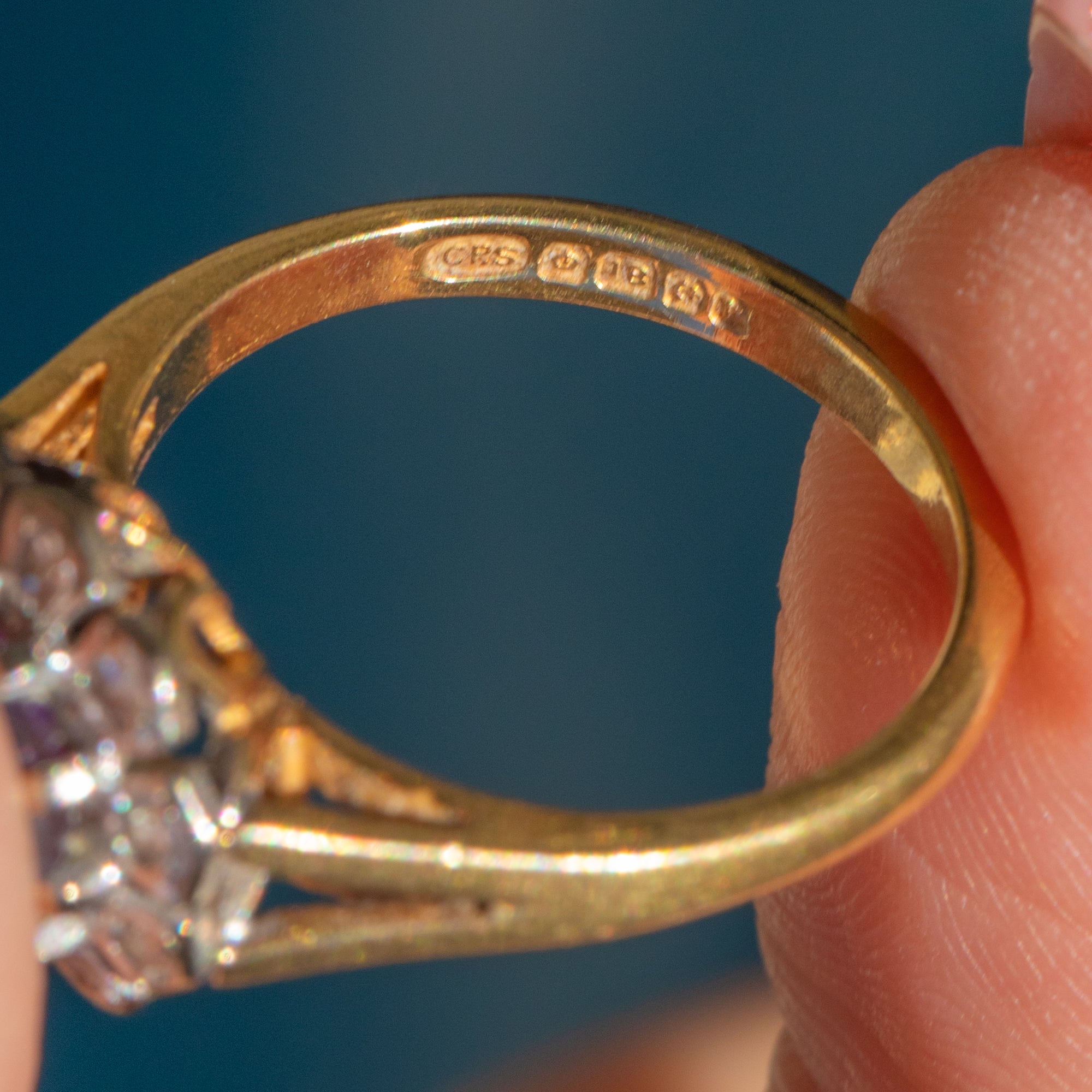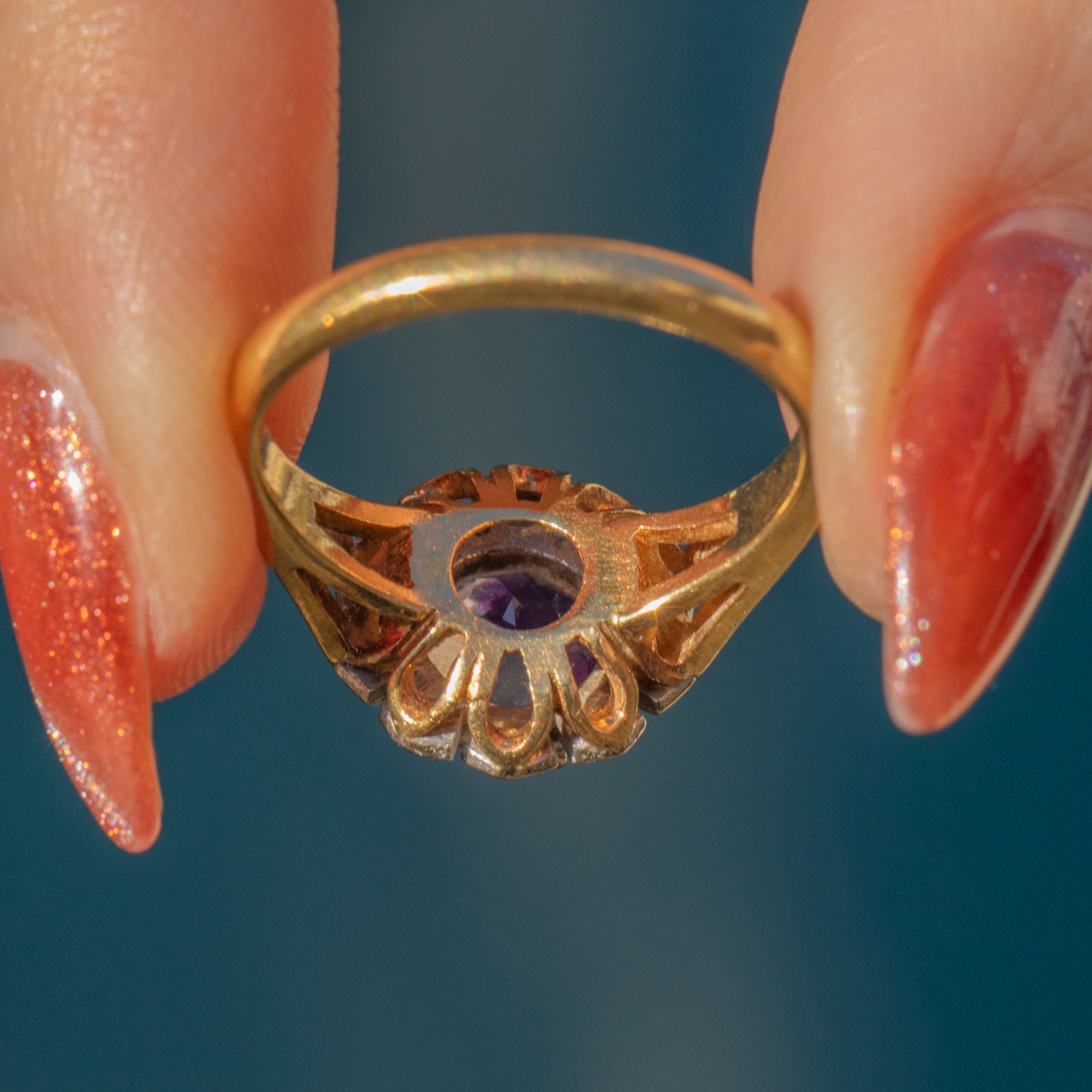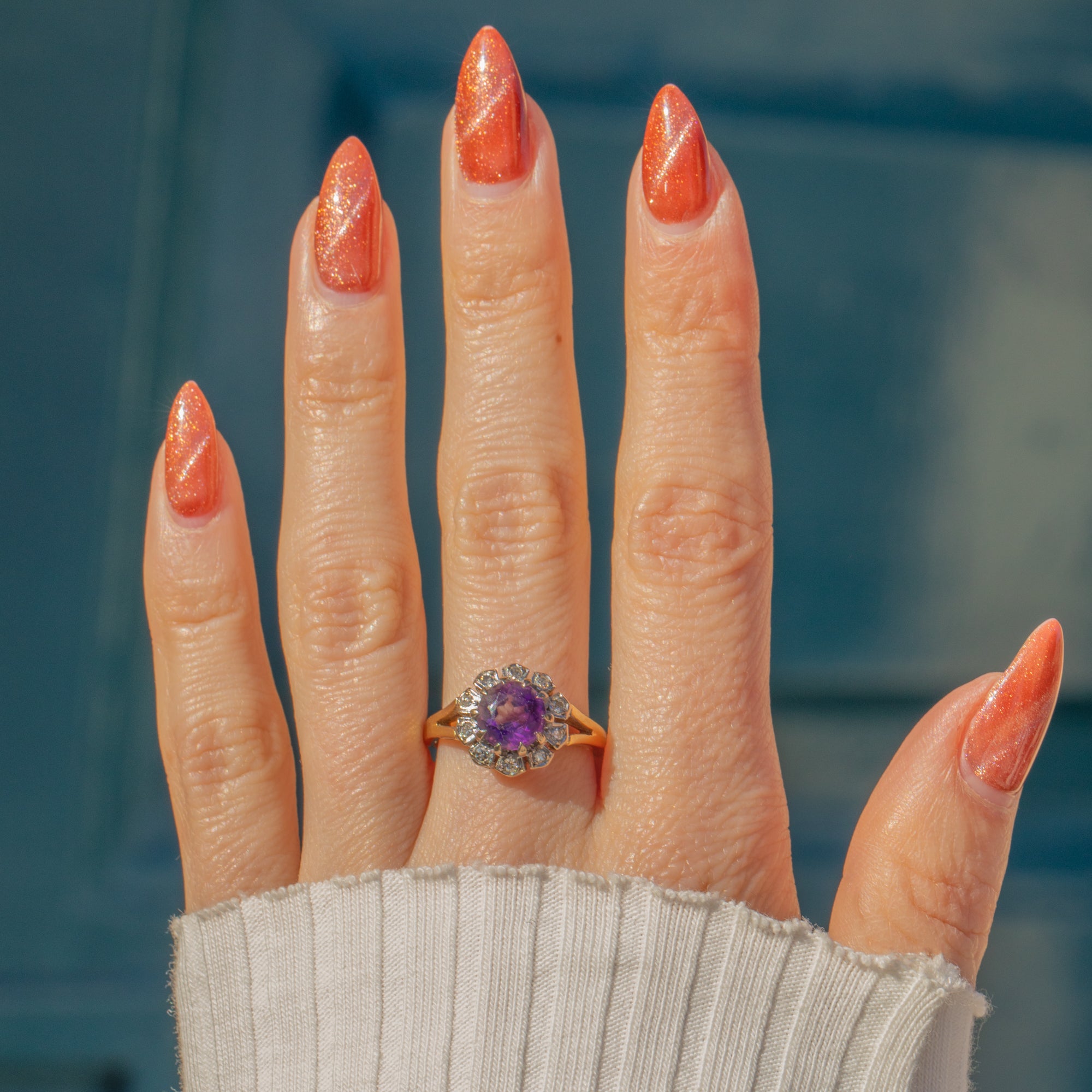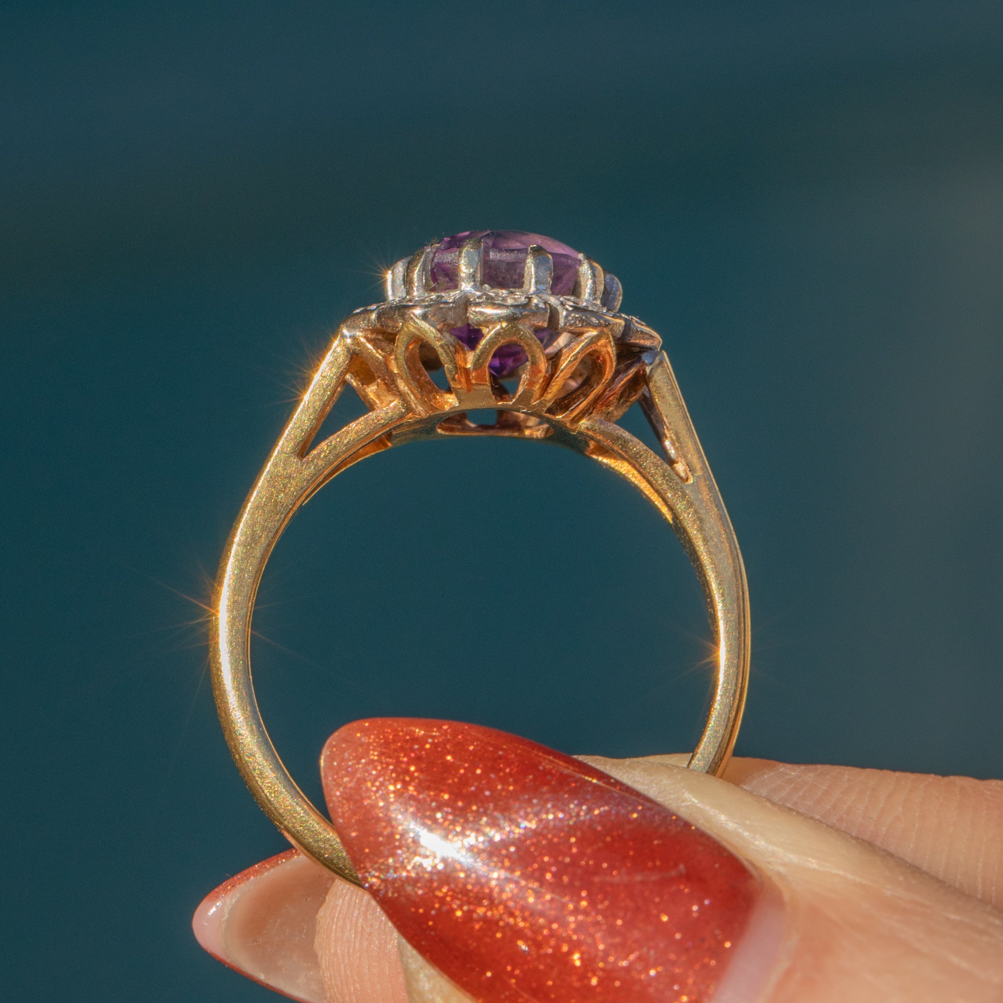 VERY GOOD: This 18ct Gold Amethyst Diamond flower cluster ring is in lovely vintage condition. The gemstones are all present and securely set within 18ct white Gold, with only some abrasions to note on the Amethyst. The yellow Gold band is brightly saturated and feels robust and comfortable to wear. The hallmarks are clear and fully legible, allowing us to accurately date this vintage Amethyst Diamond ring to 1970!
