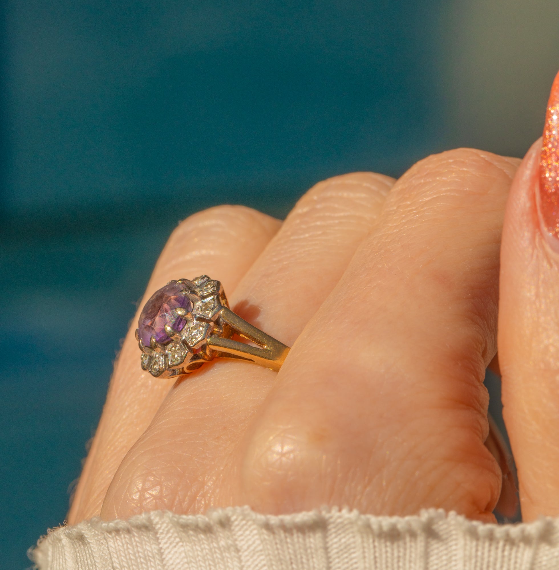 This striking 18ct Gold Amethyst Diamond flower cluster ring is a gorgeous vintage treasure! The 0.98ct Amethyst boasts a deep royal purple hue, haloed by 0.20cts of scintillating Diamonds inlaid into the petals of the feminine floral cluster.