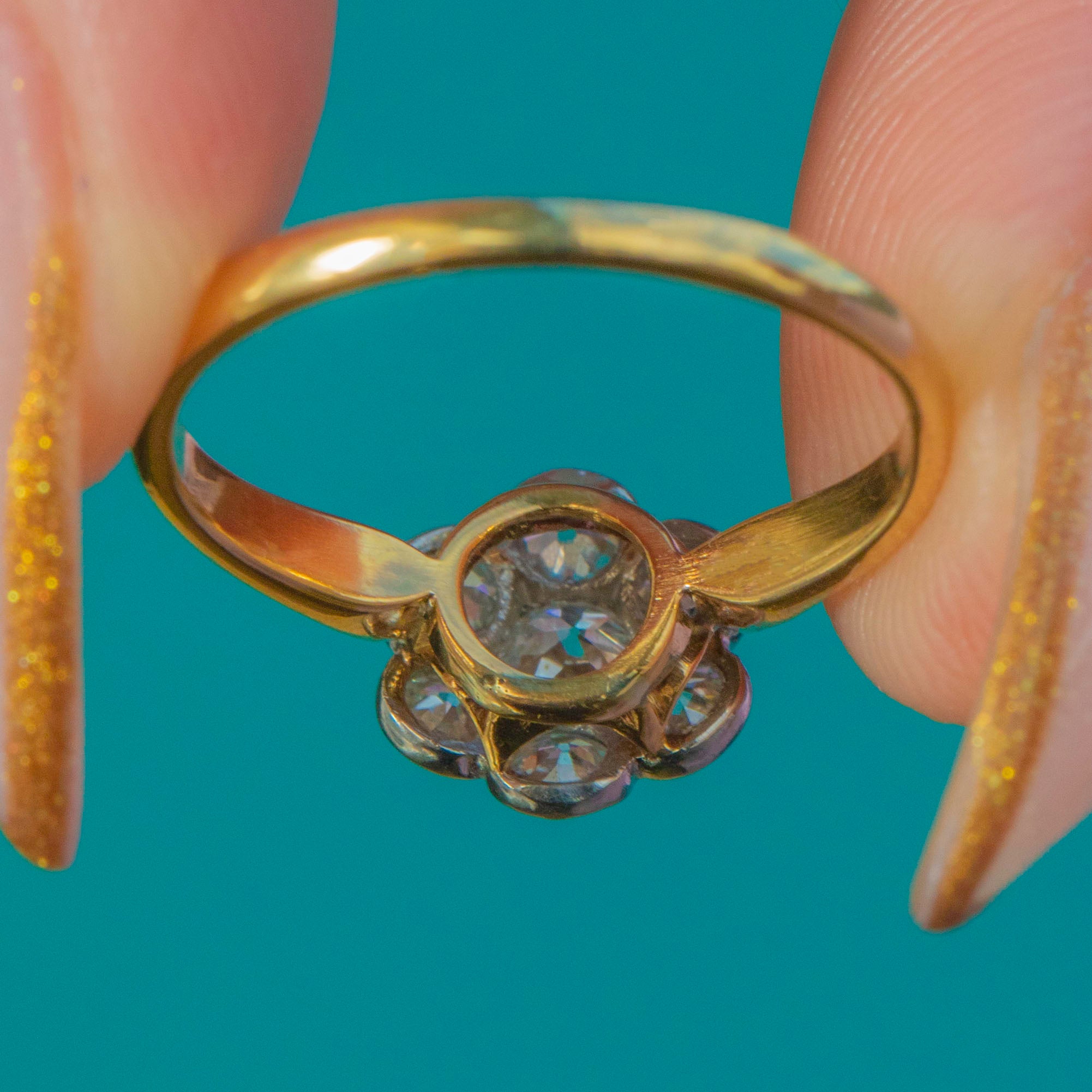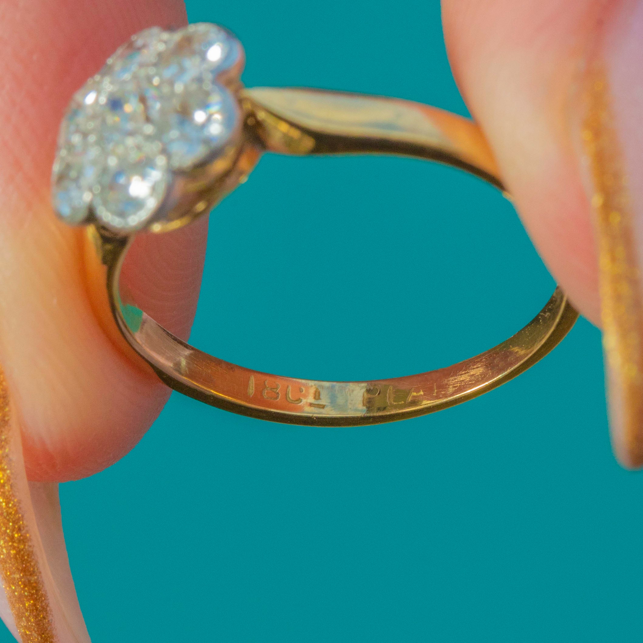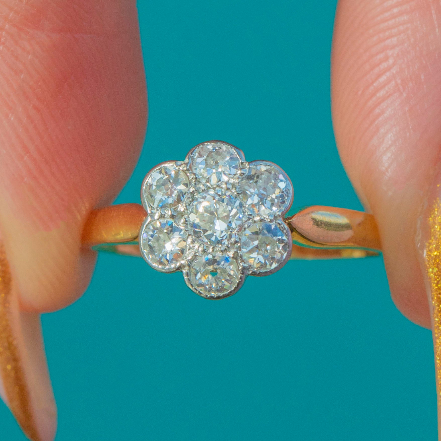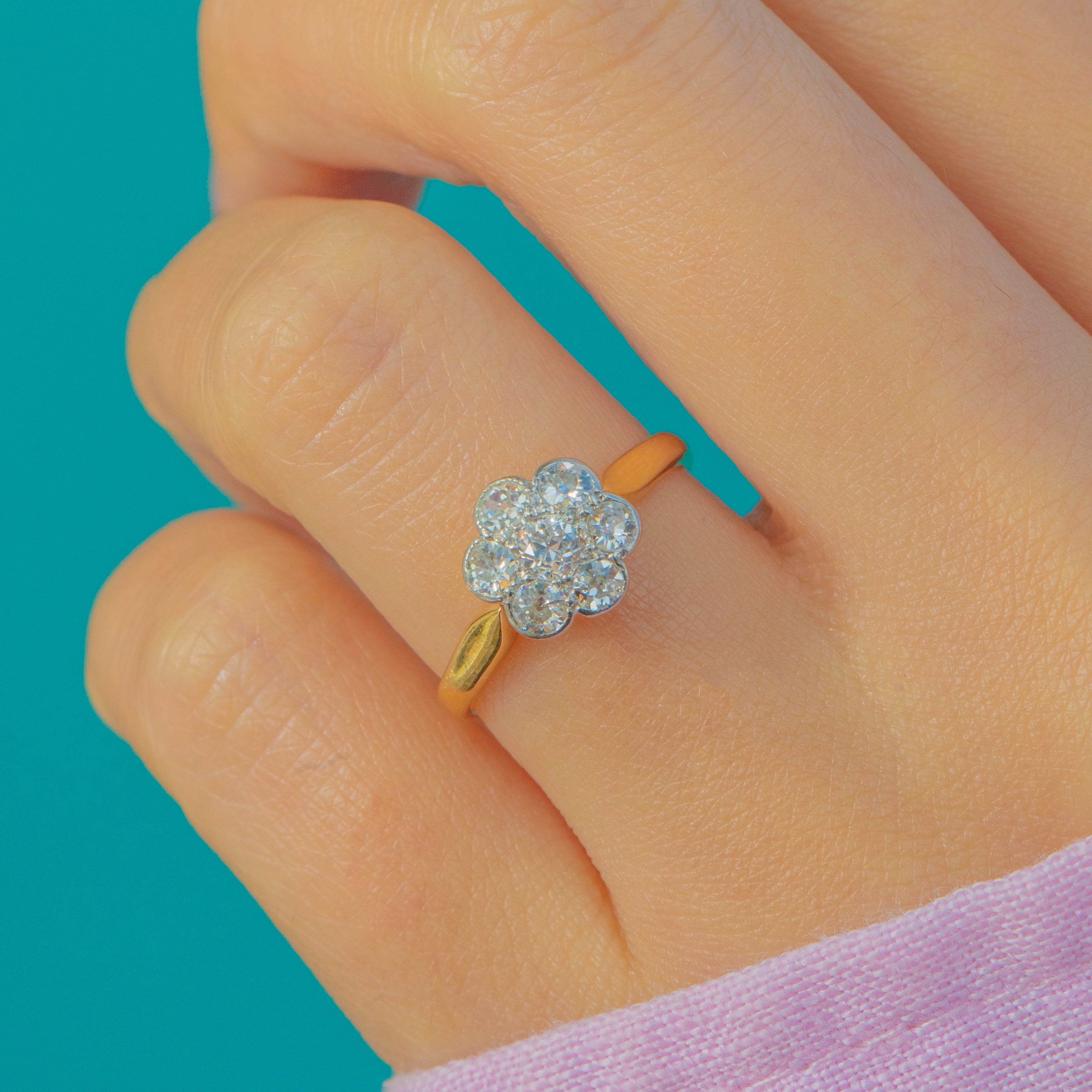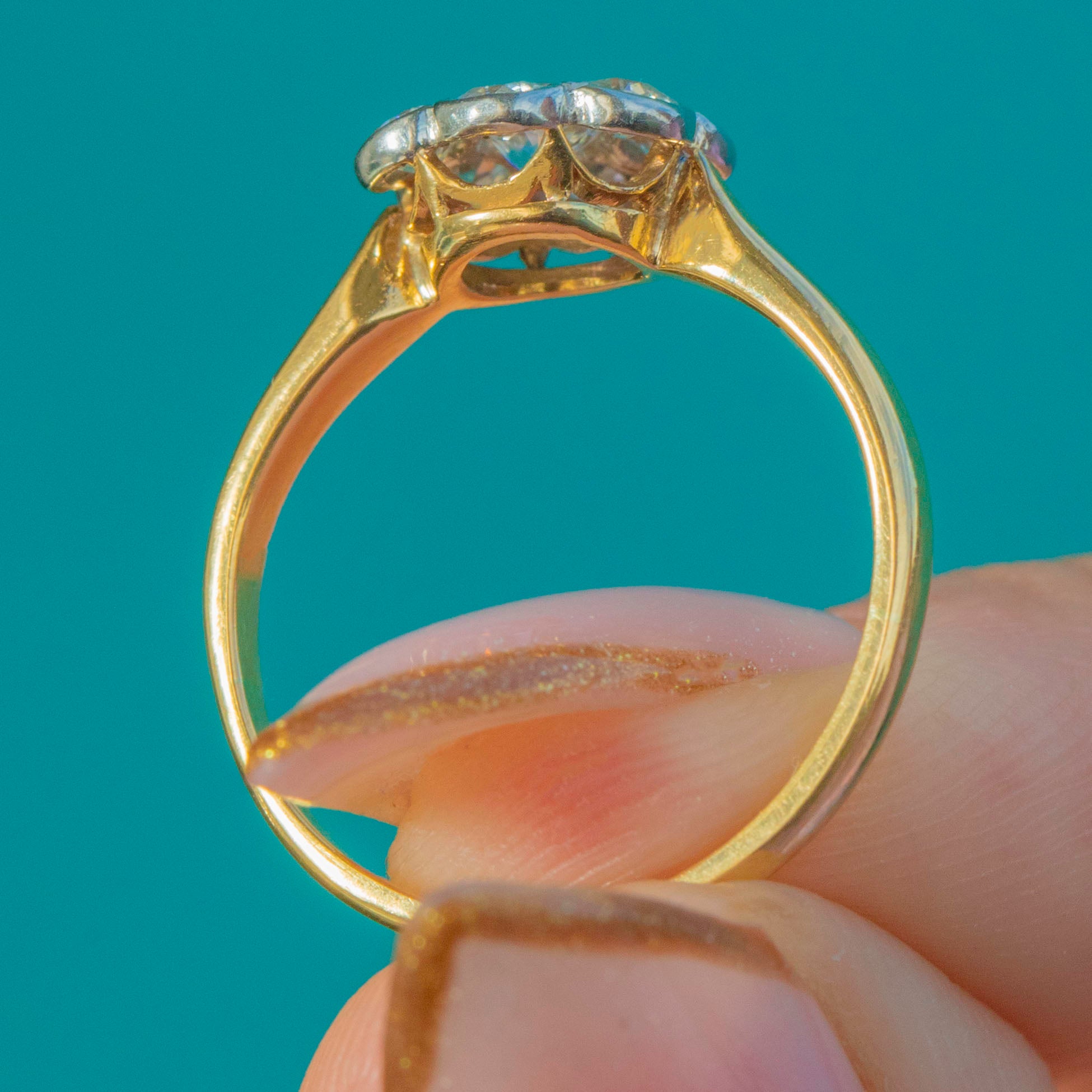 A charming Edwardian Diamond cluster engagement ring crafted in 18ct Yellow Gold with elegant Platinum settings.