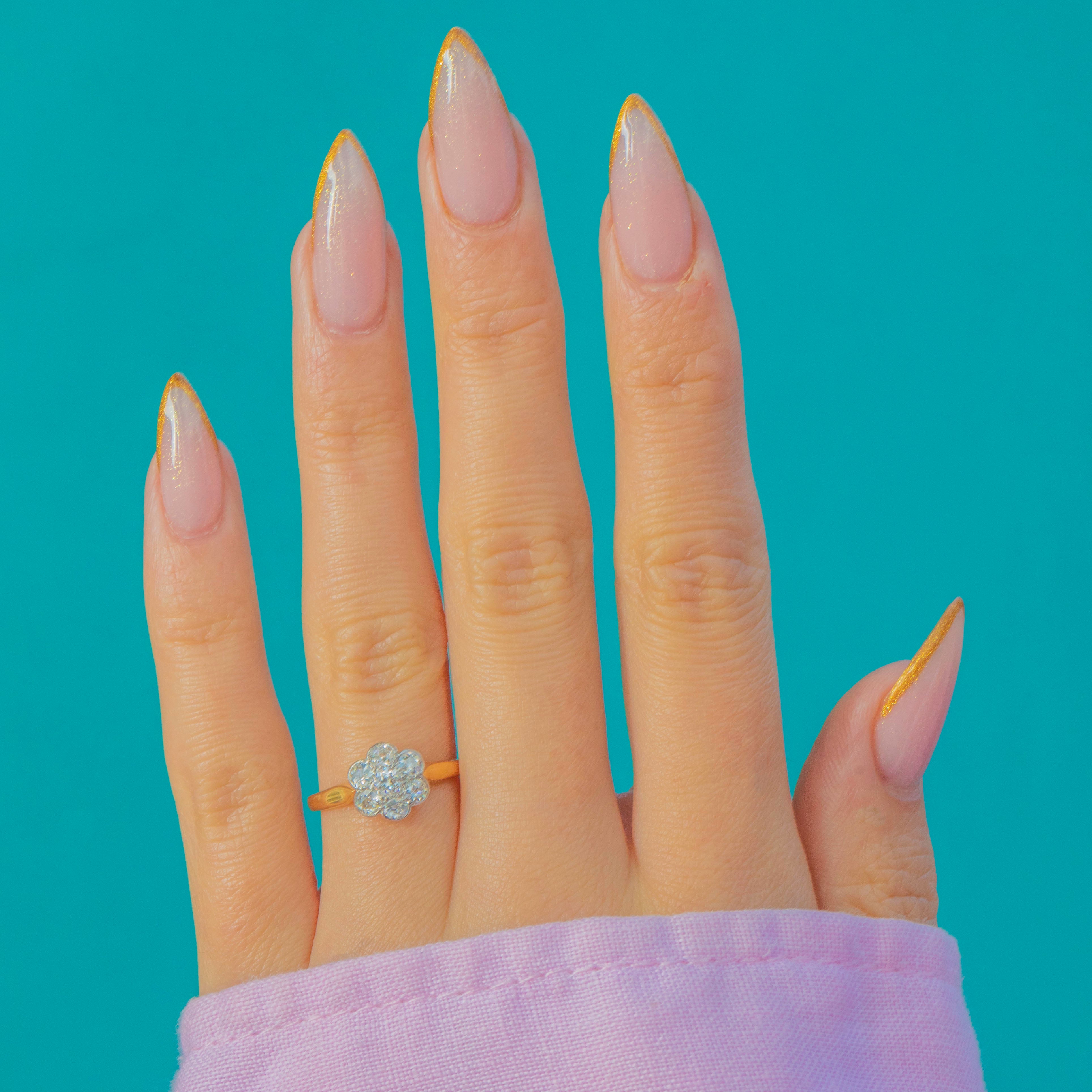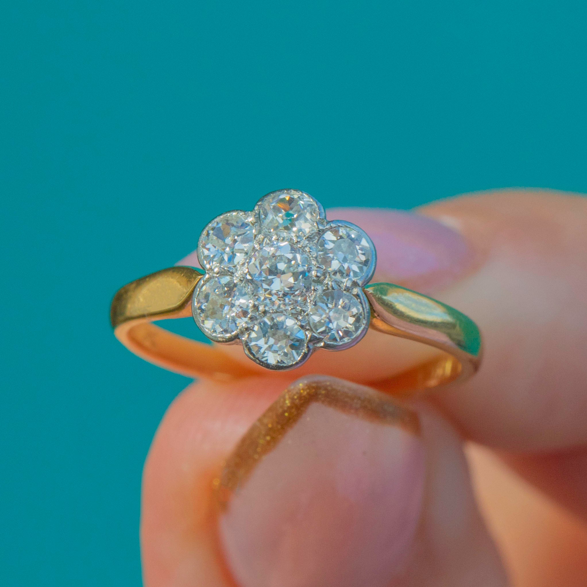 The classic seven-stone daisy design feels timeless and romantic, enhanced by the soft warmth of the 18ct Gold band and the refined Platinum settings. A wonderfully feminine Edwardian jewel—delicate, graceful and perfect as an engagement ring or elegant everyday piece.