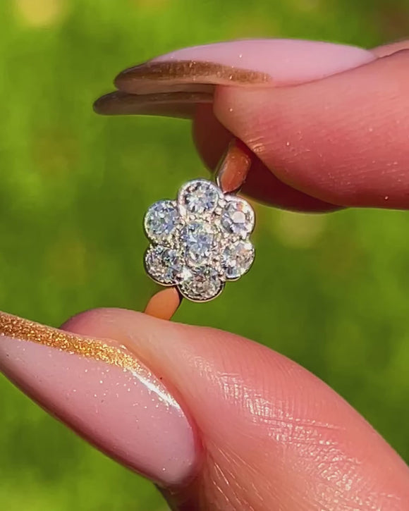 VERY GOOD: The antique Diamonds are bright, lively and securely set, with no chips or significant abrasions. The Platinum settings remain crisp with light age-consistent wear. The 18ct Gold band is smooth and well-preserved with only minimal signs of wear. A beautifully maintained Edwardian cluster ring.