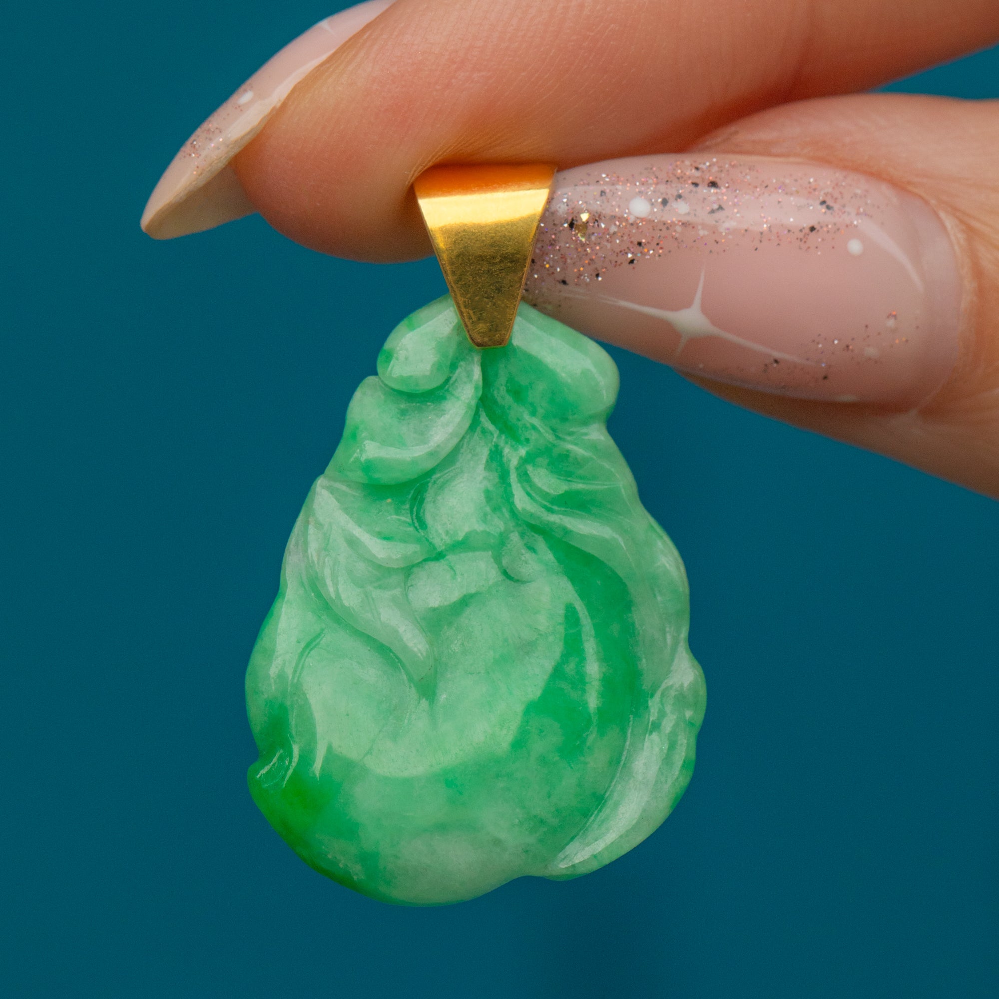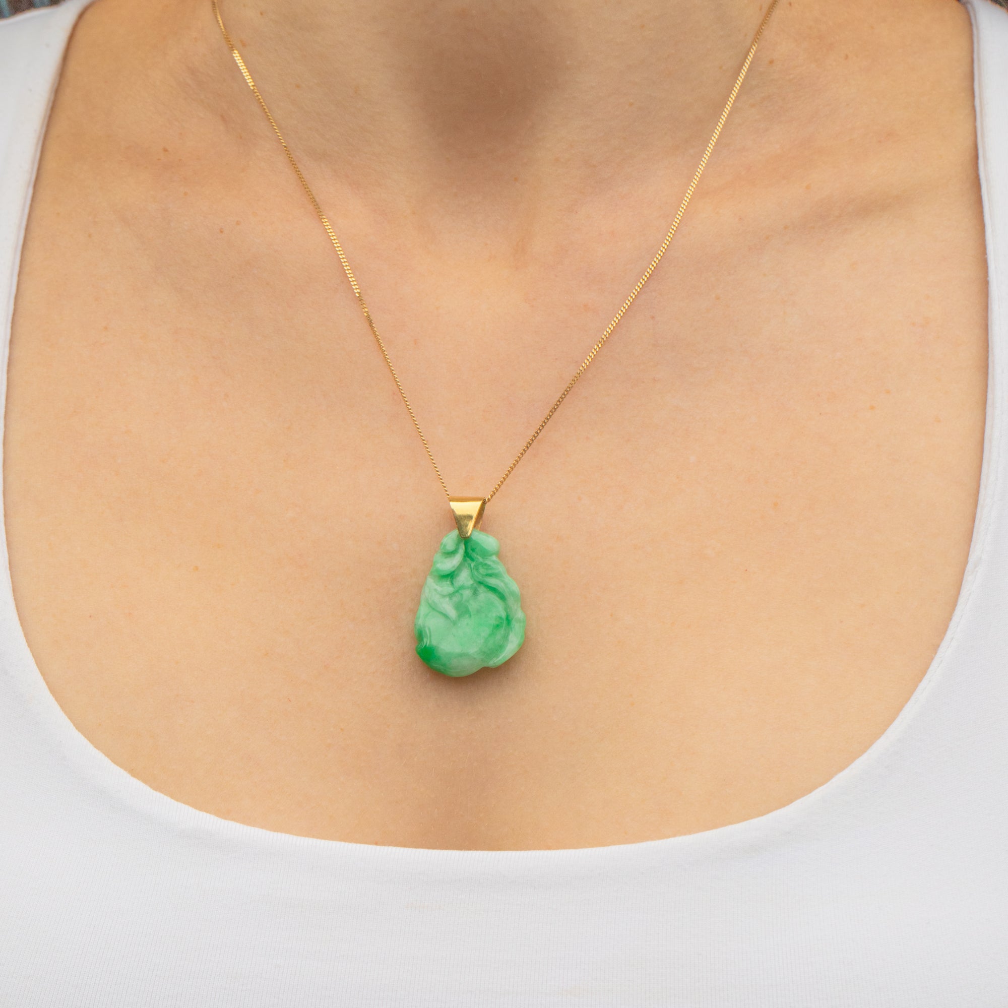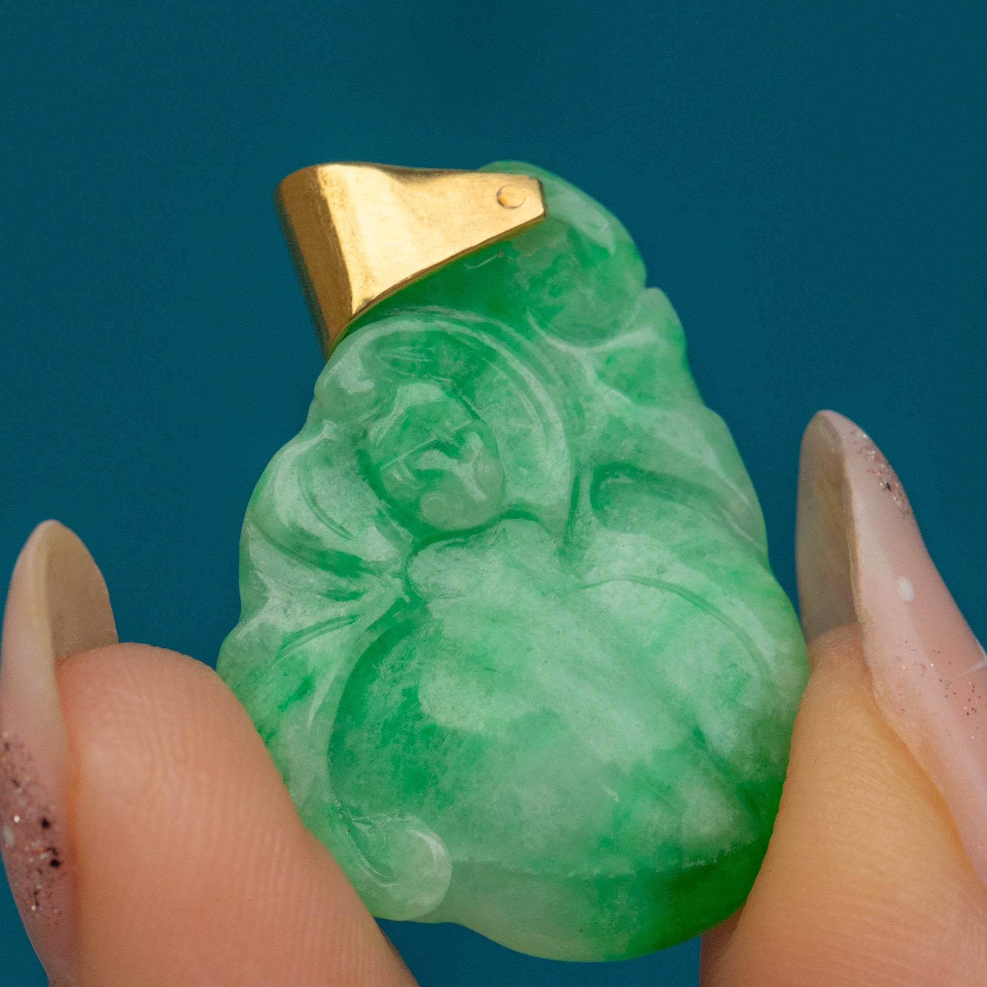 EXCELLENT. This antique 18ct Gold Art Deco carved Jade pendant is in excellent condition. From the smooth carved Jade to the intensely saturated 18ct Gold bail, we can't fault her!