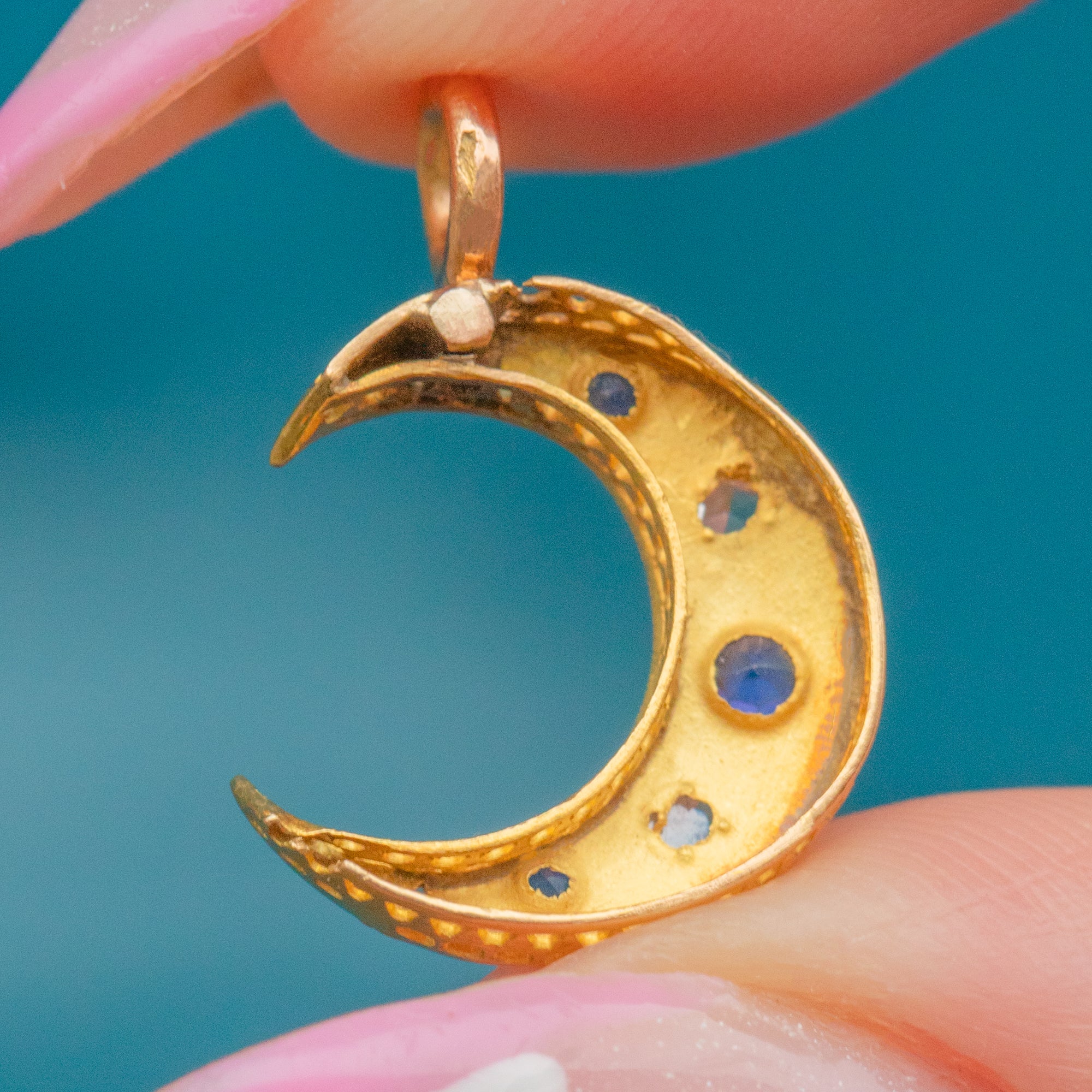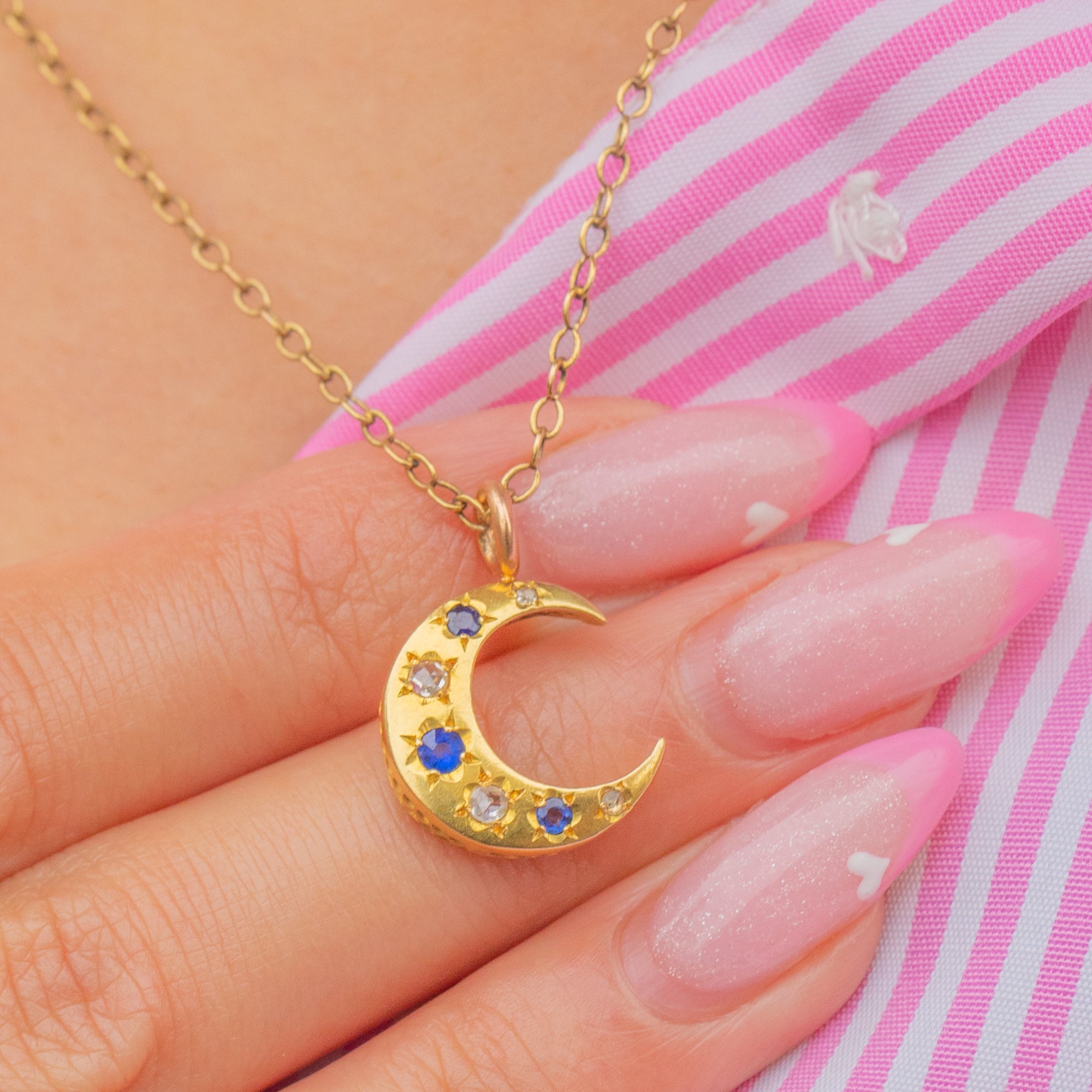 This charming Victorian crescent pendant glows in rich 18ct Gold, sparkling with alternating Blue Paste stones and Natural Diamonds. The elegant graduated gemstones catch the light beautifully, creating a celestial shimmer that captures the romance of the night sky.