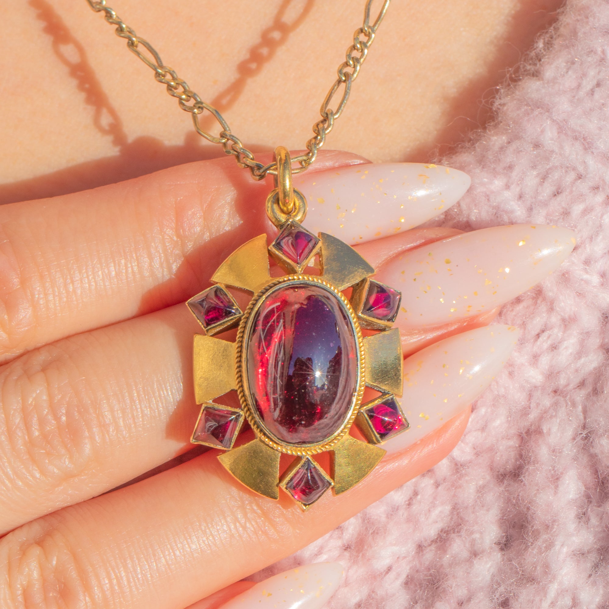 Glowing with a deep wine-red hue, this Victorian 18ct Gold pendant centres on a luscious oval Garnet cabochon framed by a striking sunburst of sculptural, radiating panels. The rich, satin Gold finish and crisp geometry create a bold, compass-like motif, punctuated by small matching Garnet accents set on the diagonal for a refined play of light and texture.