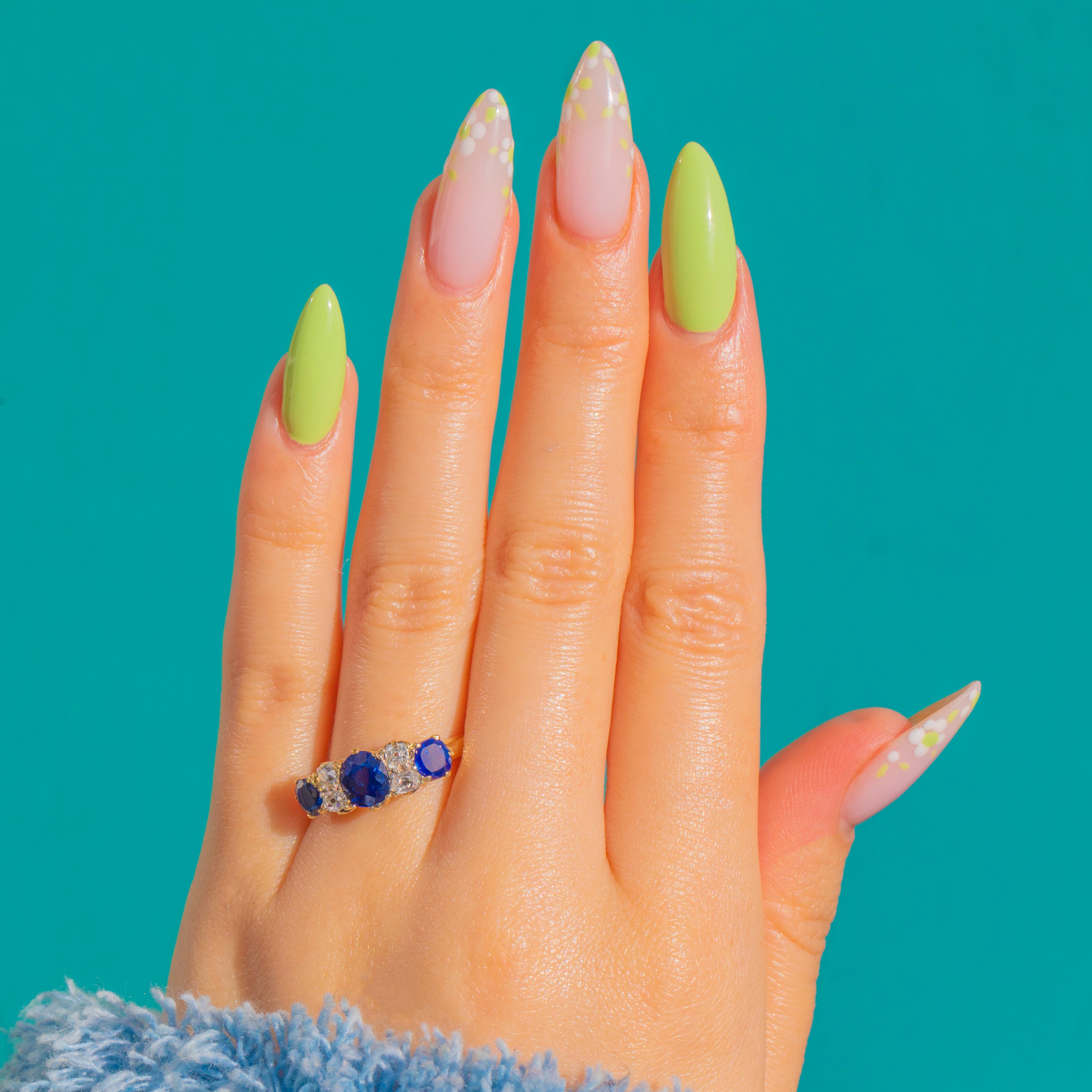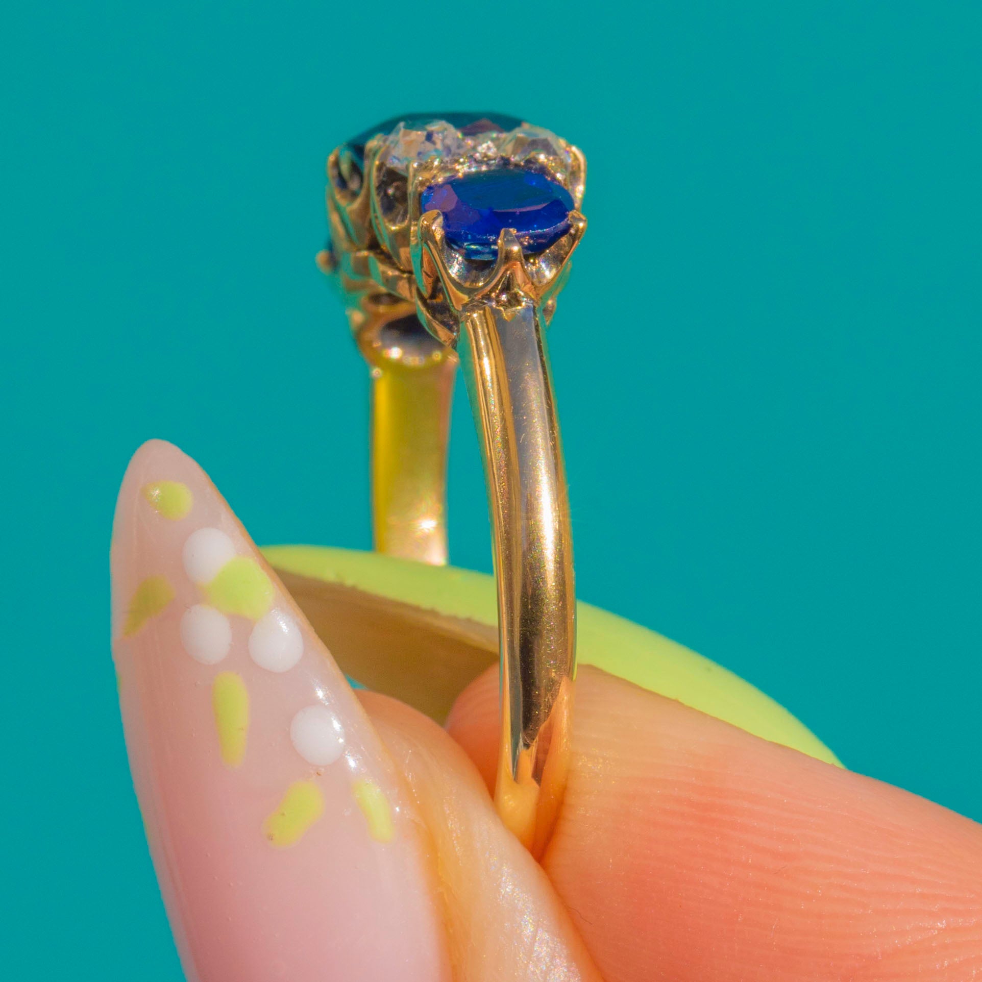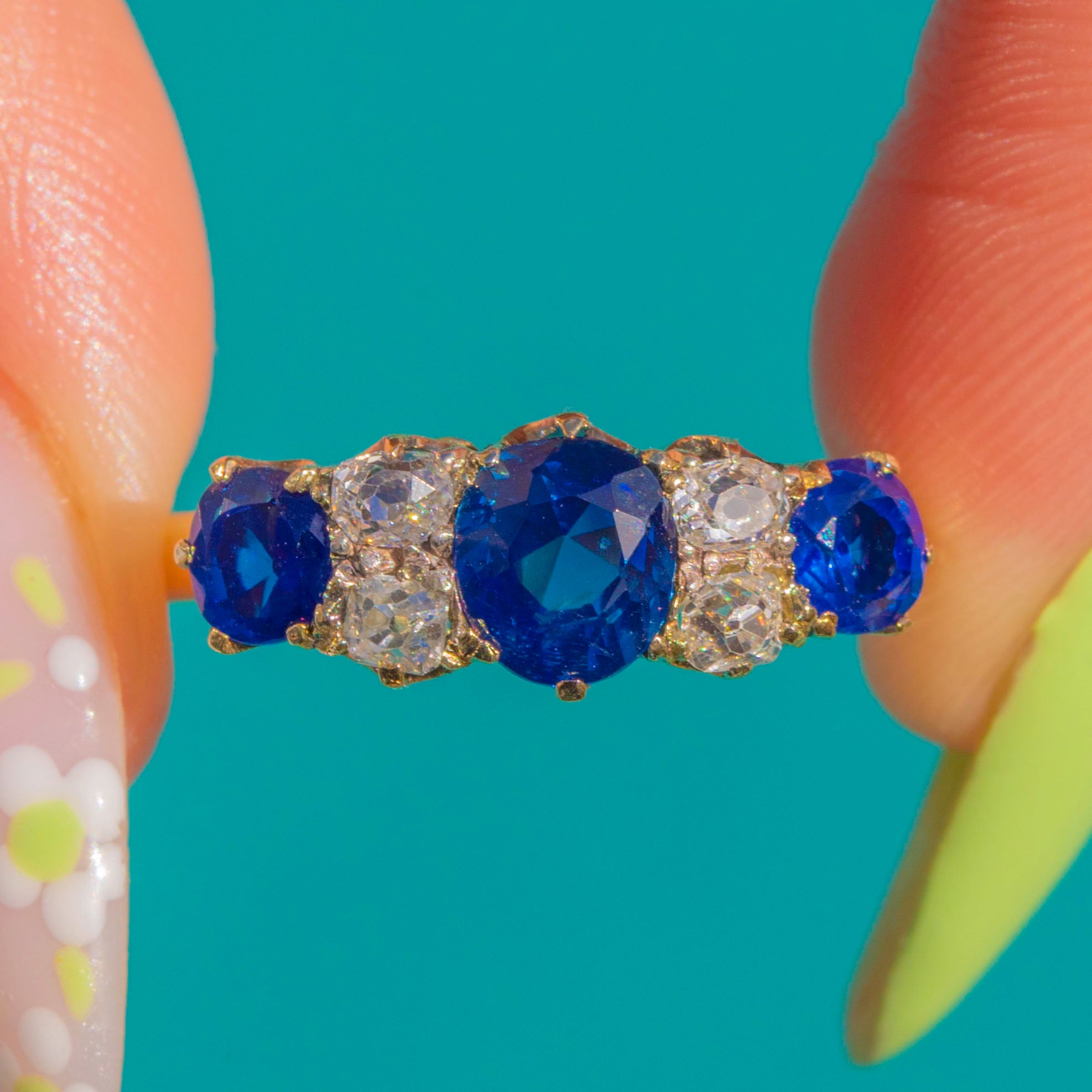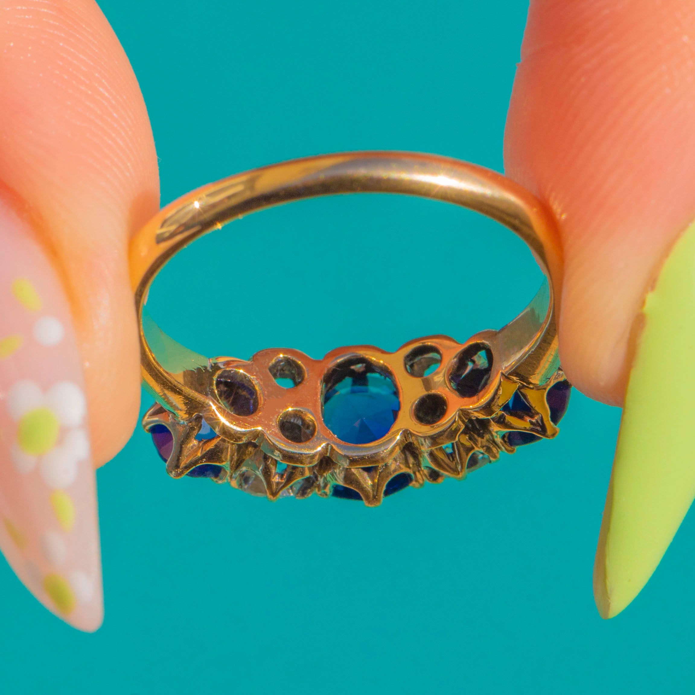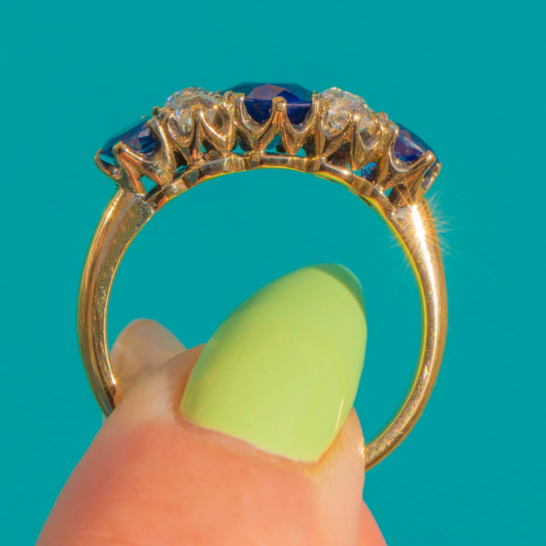 華麗なVictorian様式と洗練された美しさが際立つ、五石のリングです。豊かな18ctゴールドで仕立てられ、優雅に高く掲げられたクラウンと透かし細工のギャラリーが特徴です。中央には深みのあるロイヤルブルーのサファイアが配され、その両脇を4石の輝くダイヤモンドとさらに2石のブルーサファイアが彩ります。いずれも個別にスカラップ状の爪で繊細に留められ、伝統的なシルエットを描きます。