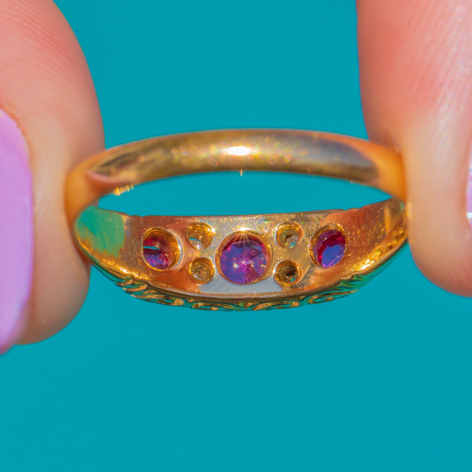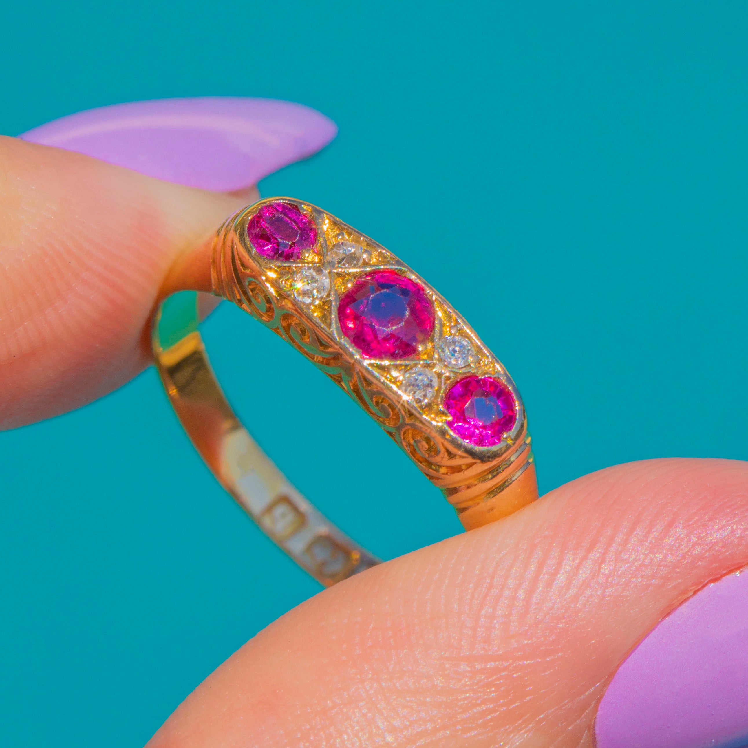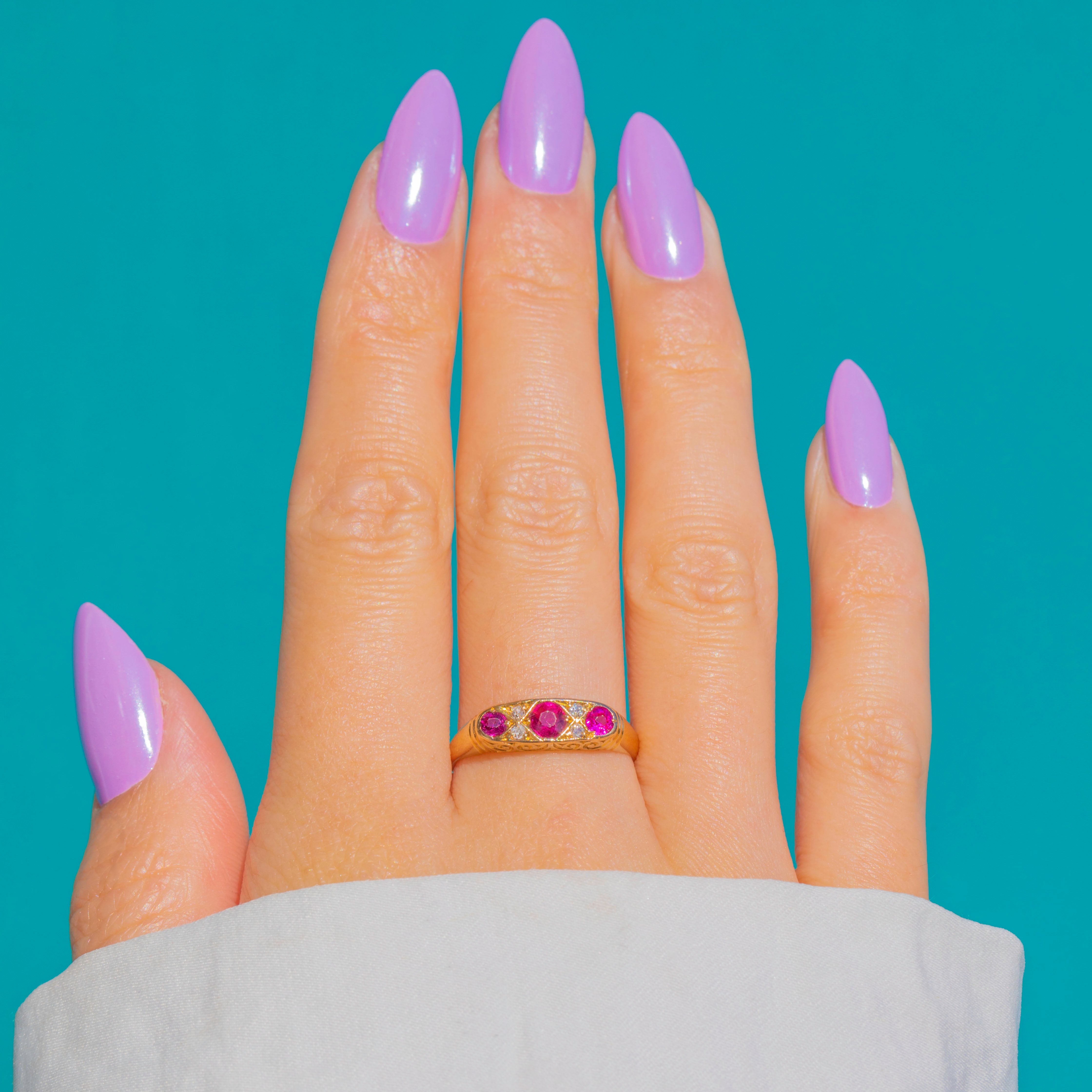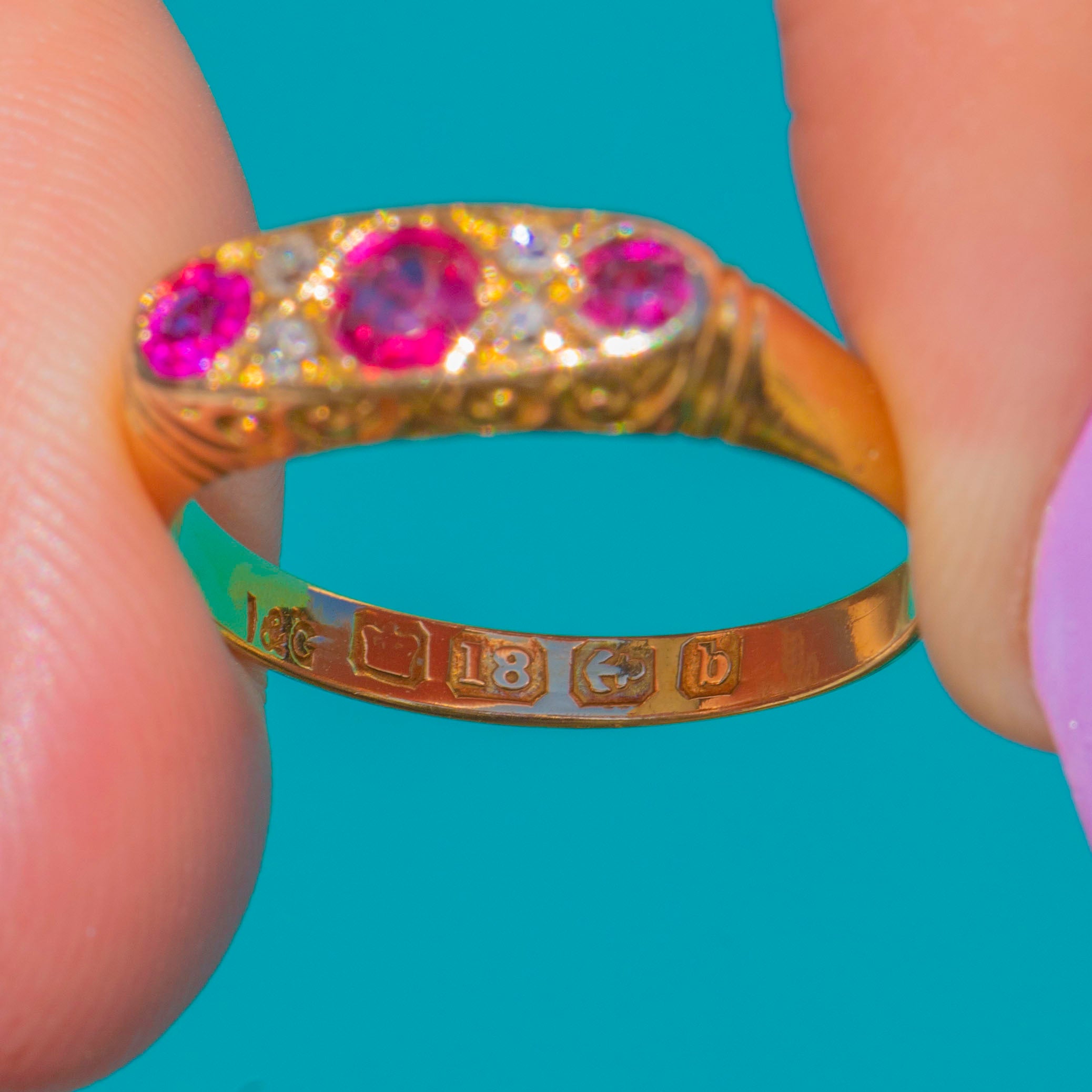 ロマンスと洗練が融合したEdwardian期の18ctゴールド ルビー&ダイヤモンドリング。バーミンガムの完全なホールマークにより、1902年製と明確に特定されています。3石の艶やかな天然ルビーがクラシックなグラデーションパネルに配され、鮮やかな中央のルビーを2石の小ぶりなルビーが優美に引き立てます。その間には繊細なスペーサーとして、澄んだダイヤモンドが上品に輝きます。エレガントなロープロファイル、ミルグレイン装飾、精緻に透かし彫りされたアンダーギャラリーが、このジュエリーに時代を超えた優雅さを添えています。