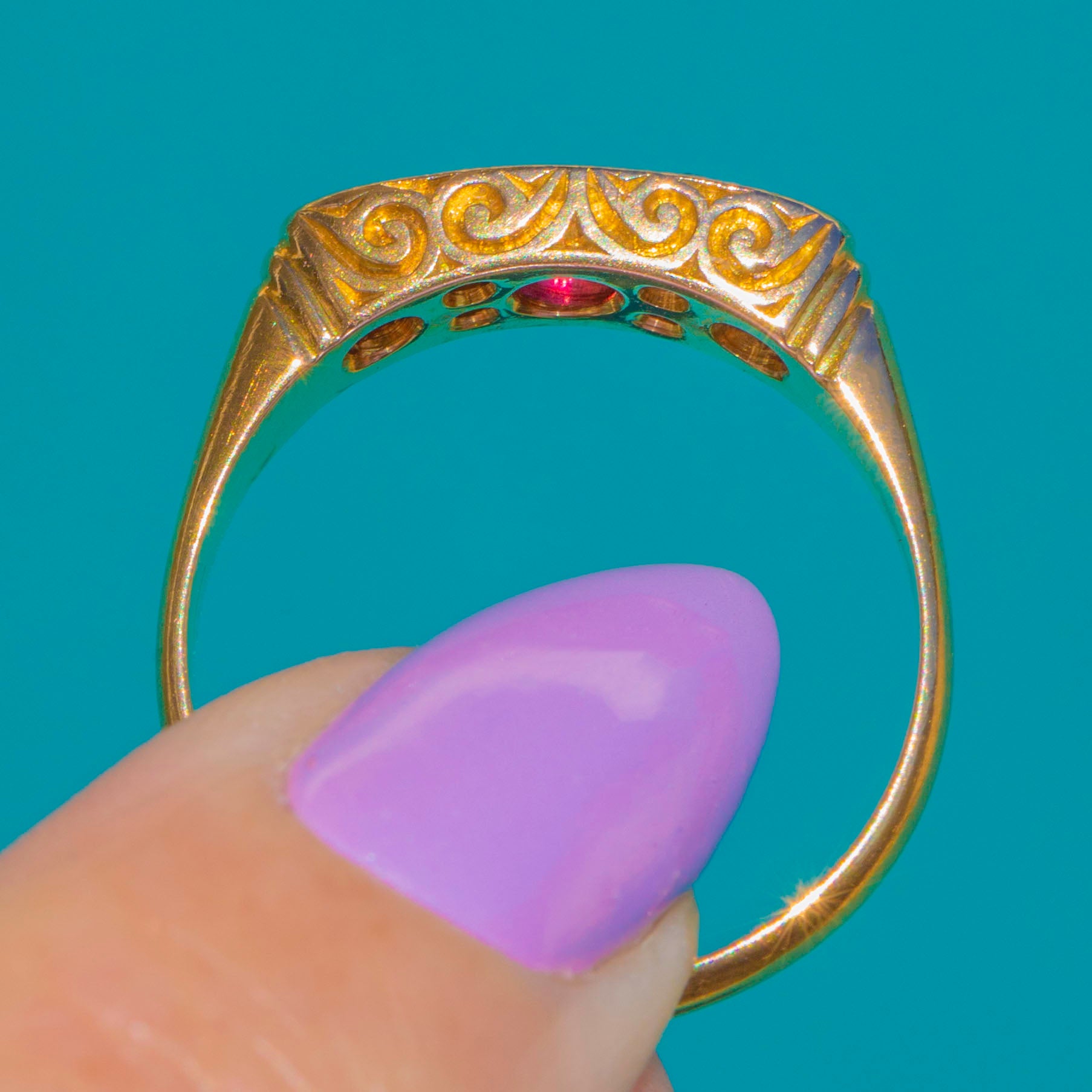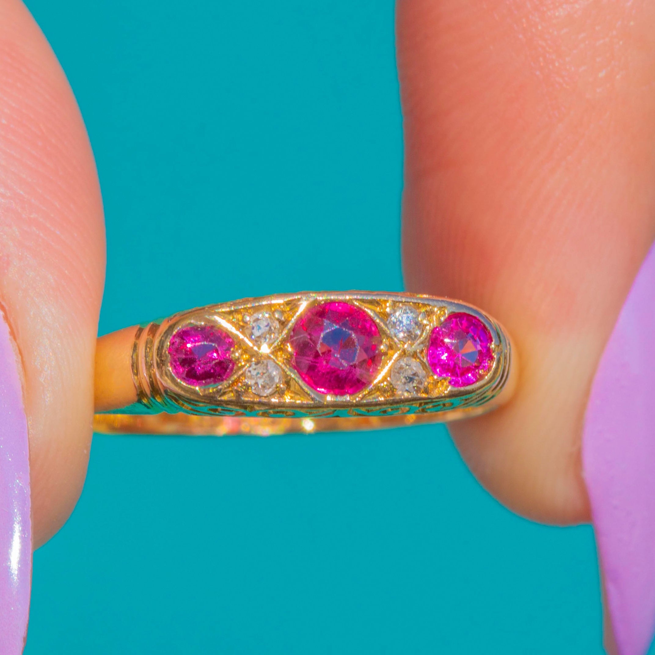 植物モチーフのエングレービングが施されたショルダーから、細身のシャンクへと流れるラインは、この時代特有の卓越した手仕事を物語ります。ルビーの総カラット数は約1.00ct。濃密なピンクレッドの色彩が18ctゴールドの温かな輝きにより一層引き立ち、ダイヤモンドが明るく華やかなアクセントを添えます。気品に満ちたアンティークの逸品——洗練された美しさと実用性を兼ね備え、永遠にシックな存在です。