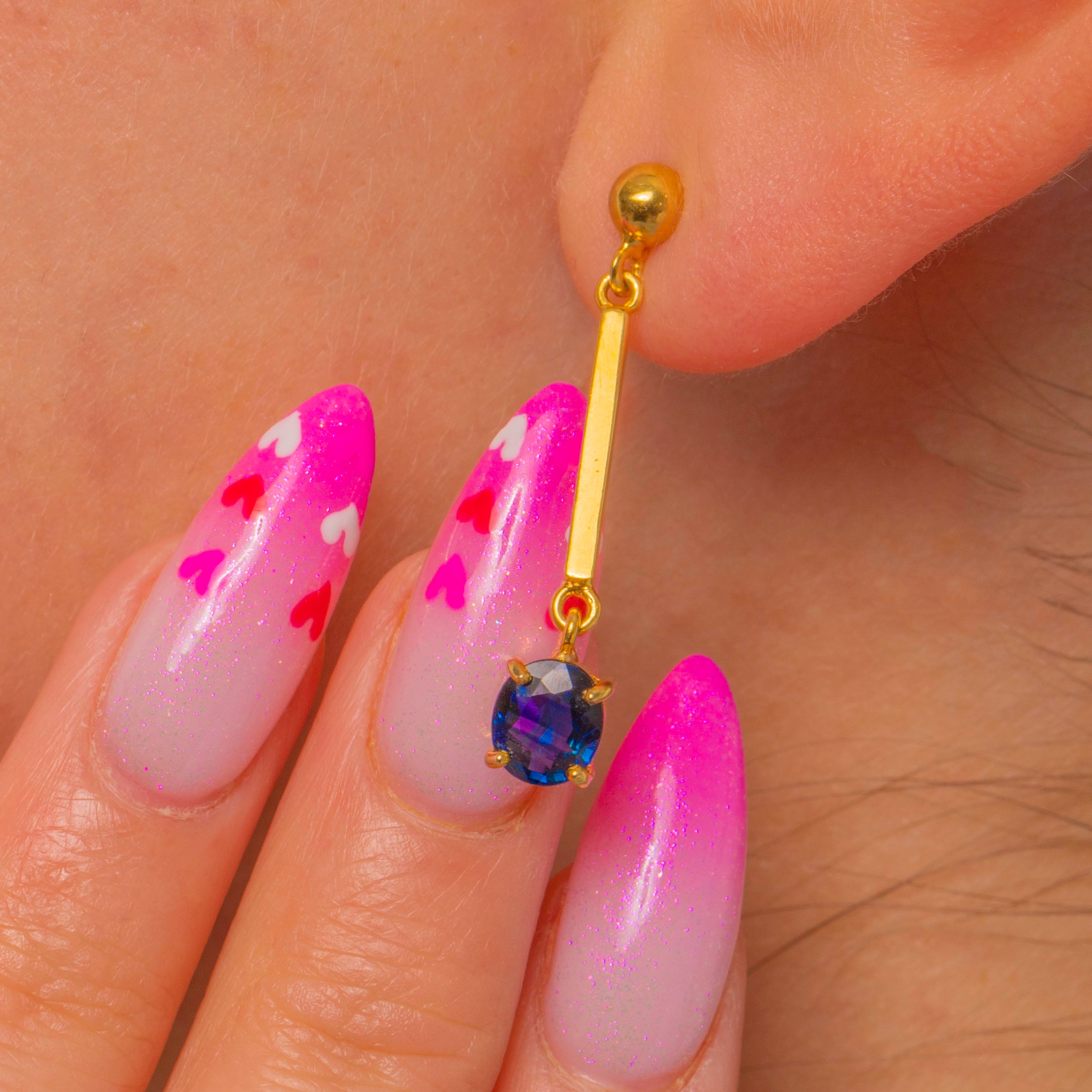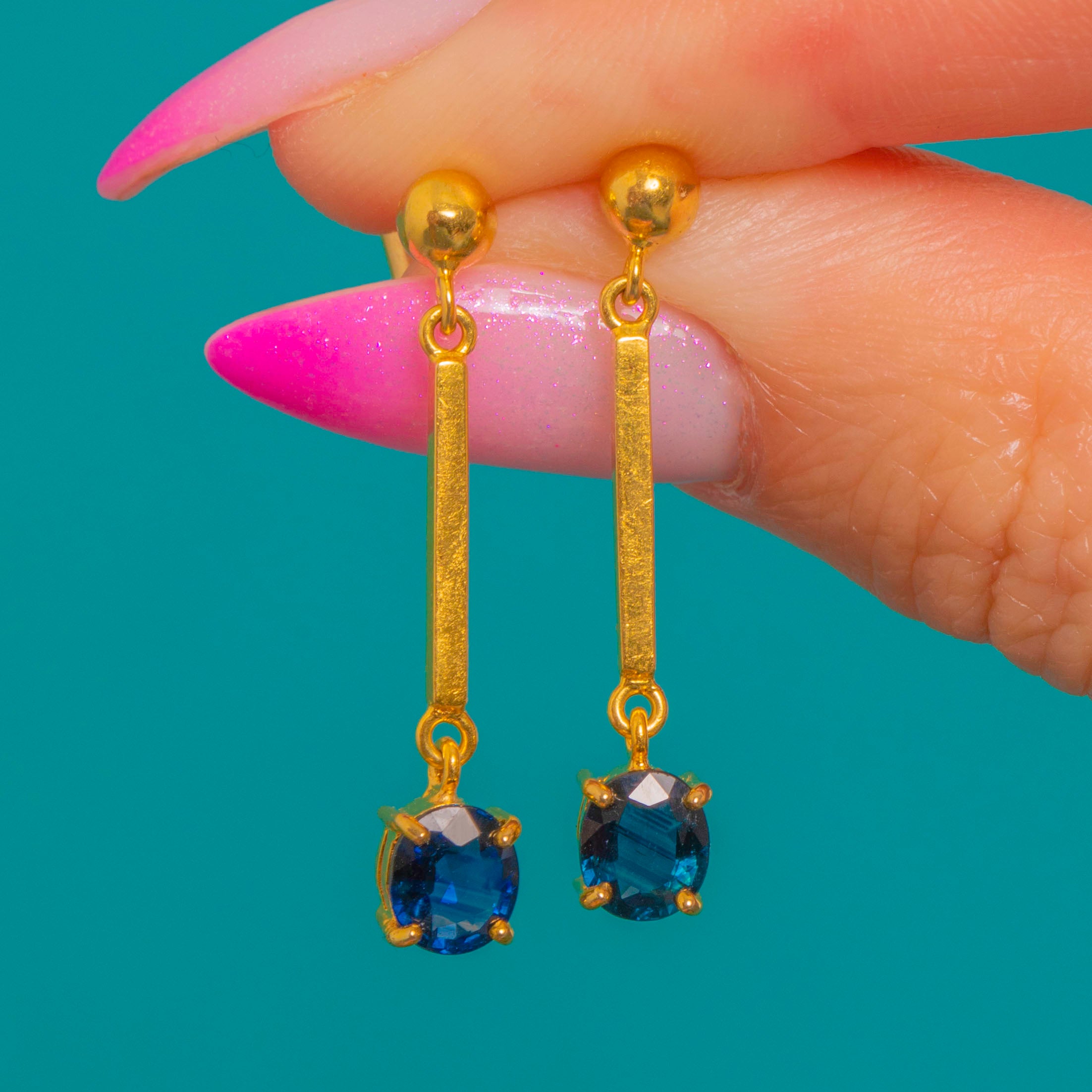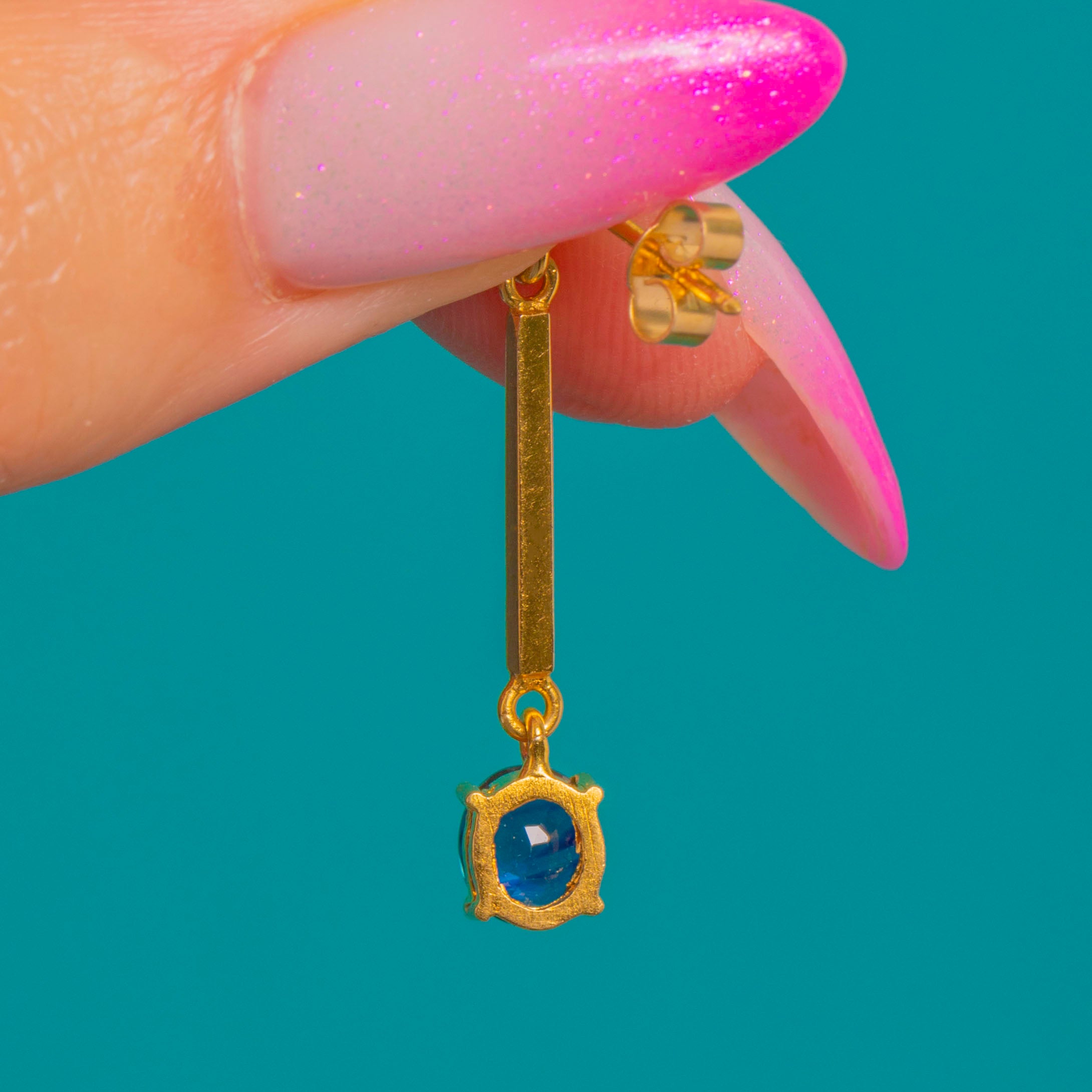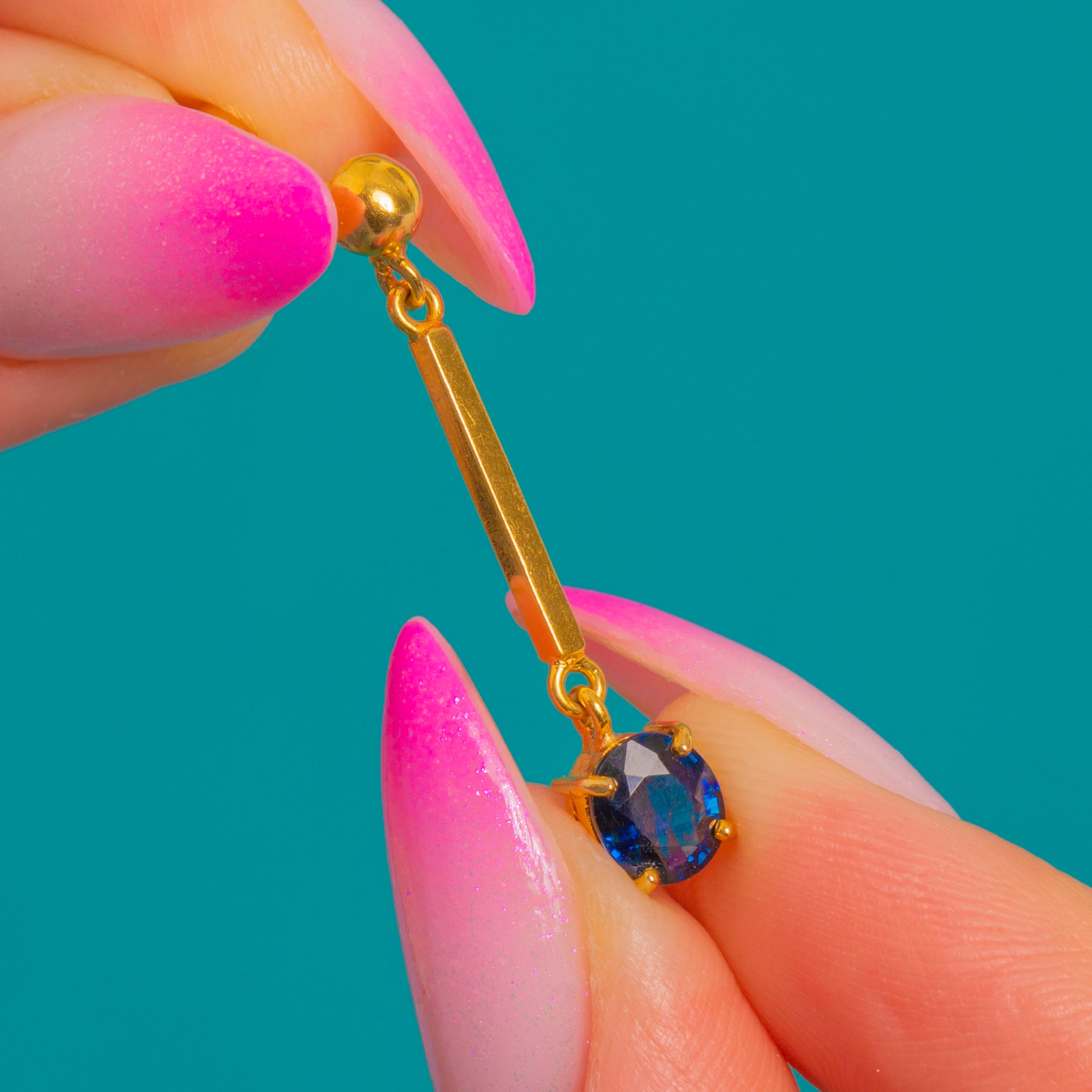 Sleek and elegant, these articulated 18ct Gold bar drop earrings celebrate minimalist design with a luxurious twist. A neat ball stud leads to a slender bar that finishes in a four-claw set, deep blue Sapphire, creating a refined linear silhouette with graceful movement.