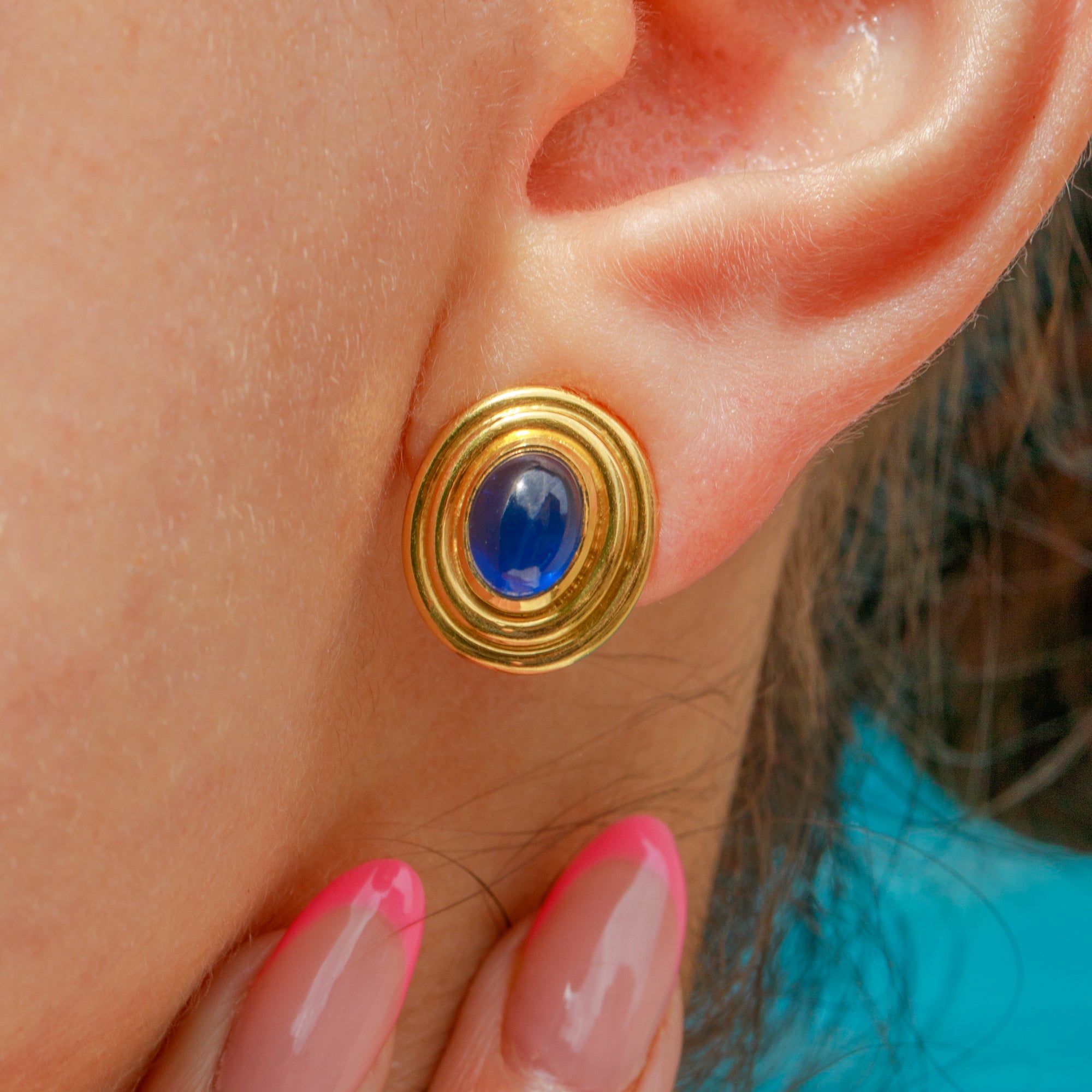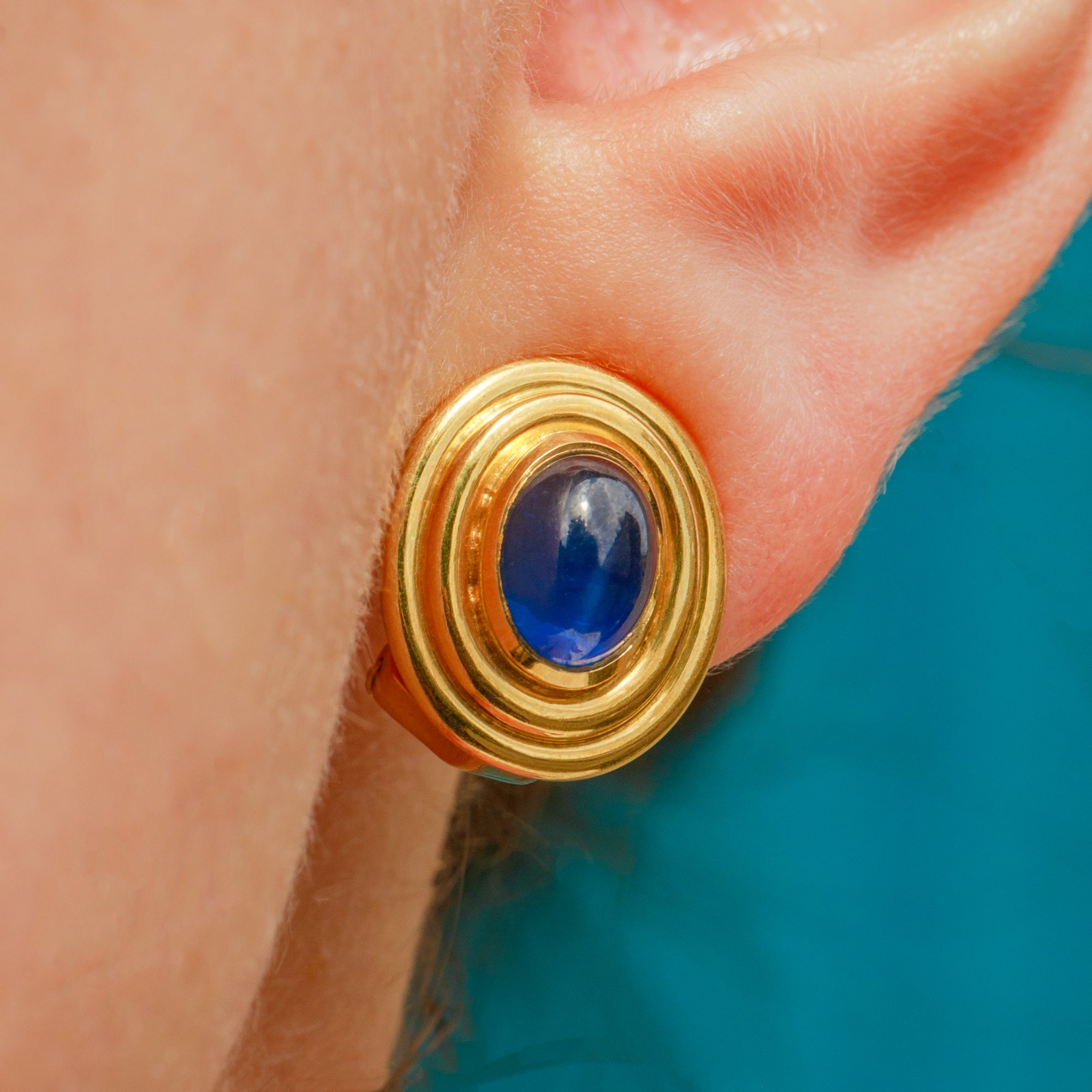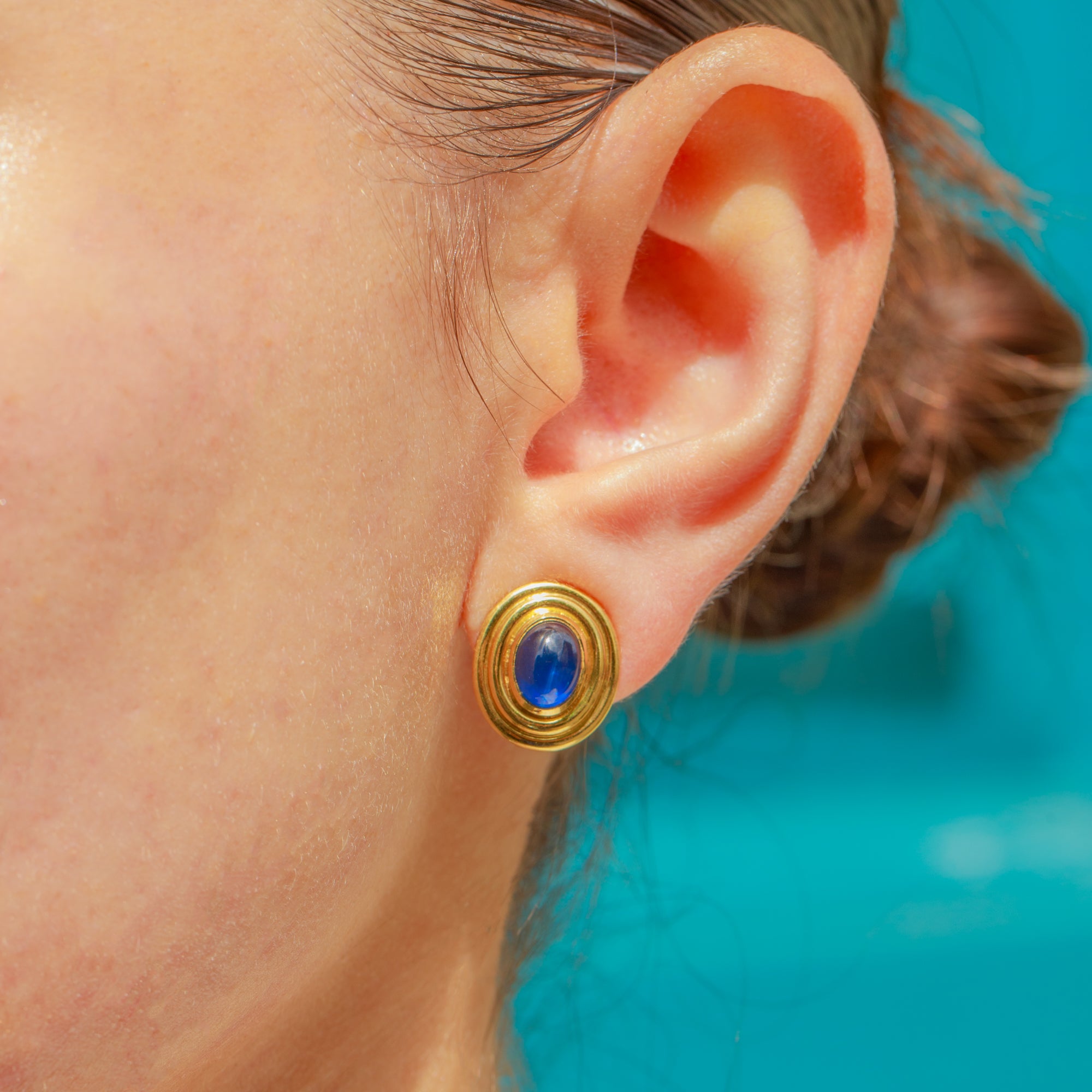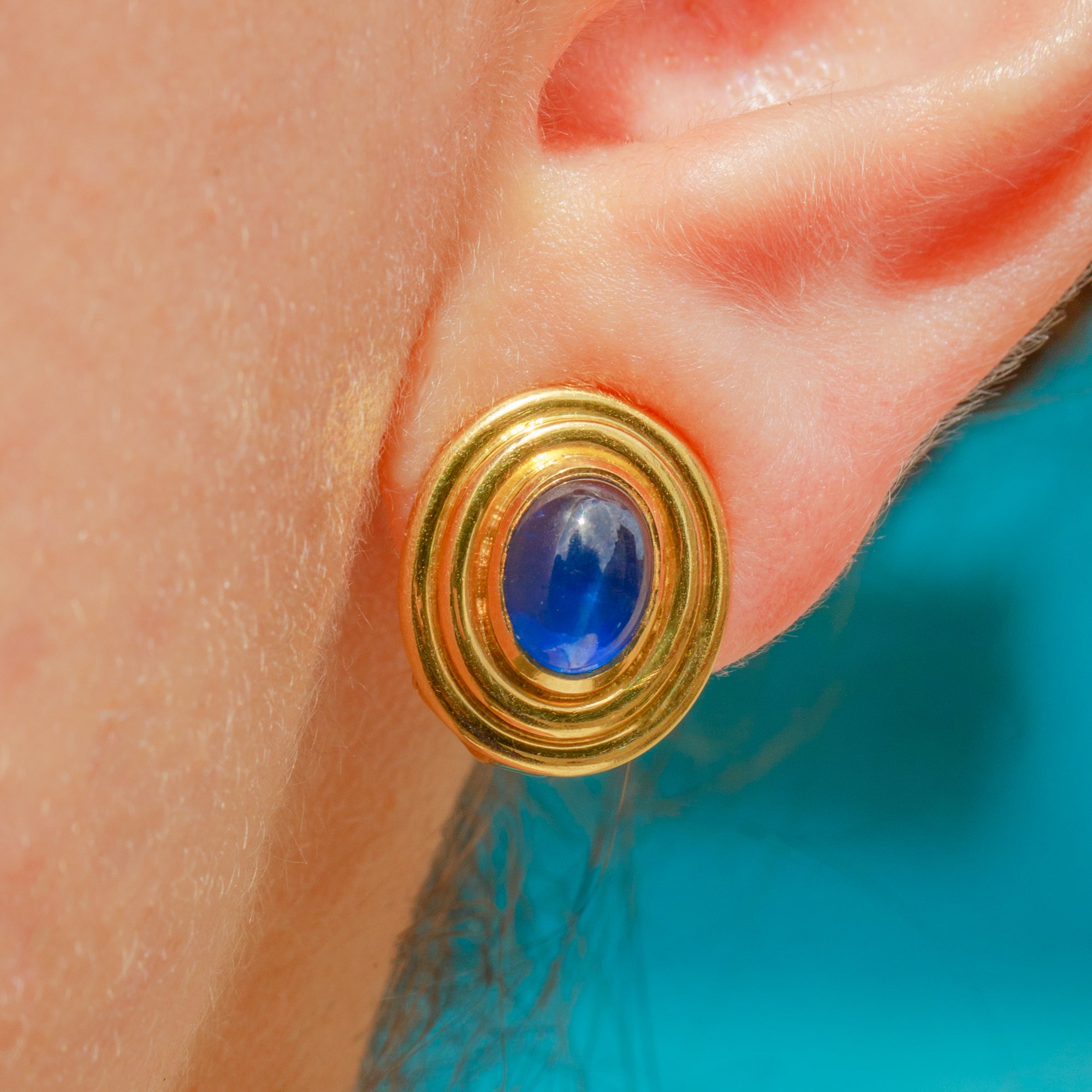 Each earring homes a stunning natural Sapphire cabochon, its domed surface projecting a rich royal blue hue and eye-catching adularescence as it catches the light. The natural Sapphires, weighing a total of 2.15 carats, are encircled by textured buttery warm 18ct Gold bezels, the warmth effortlessly complementing the natural deep blue of the Sapphires.