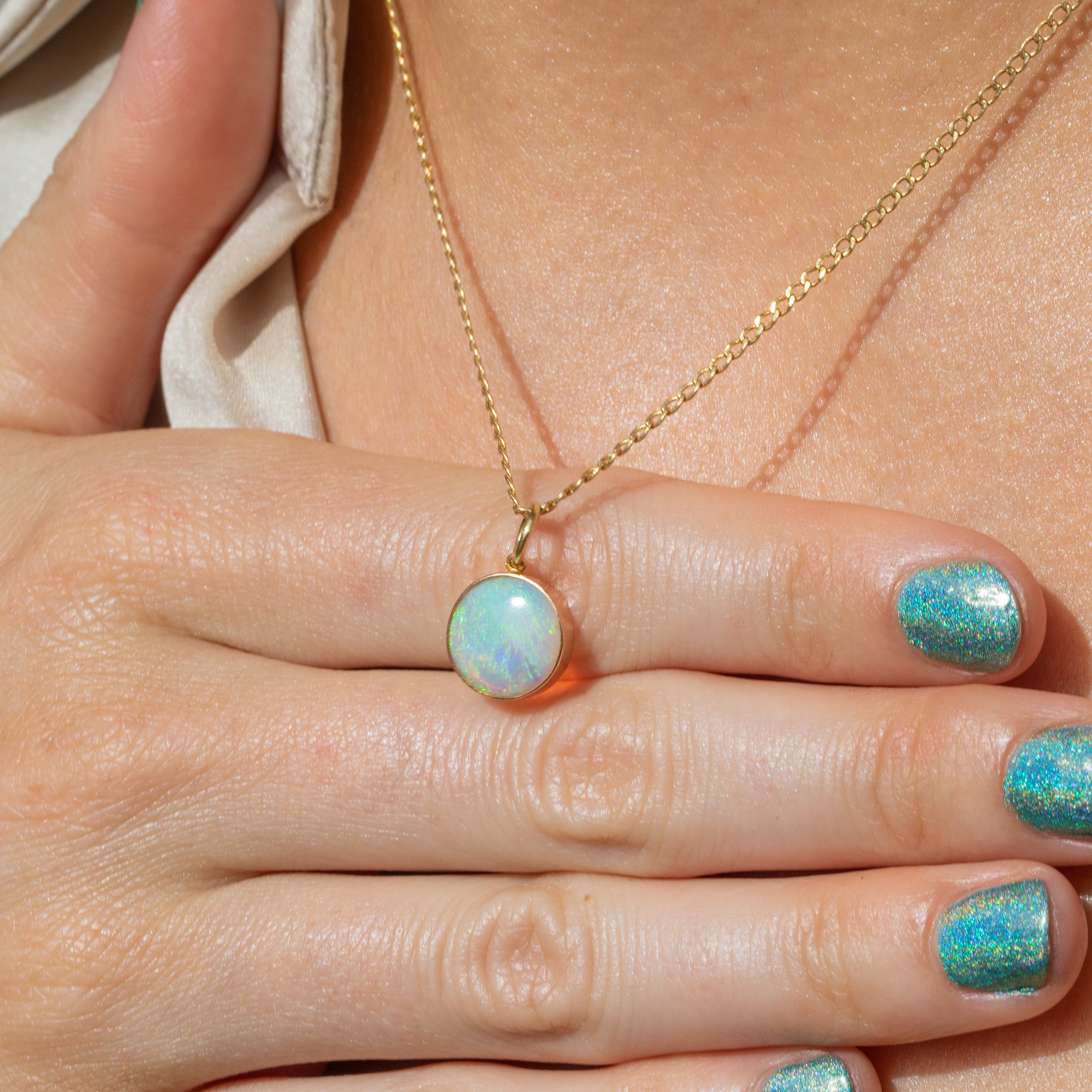 Once around your décolletage, you can't help but notice her iridescent shimmers glow beneath the light.