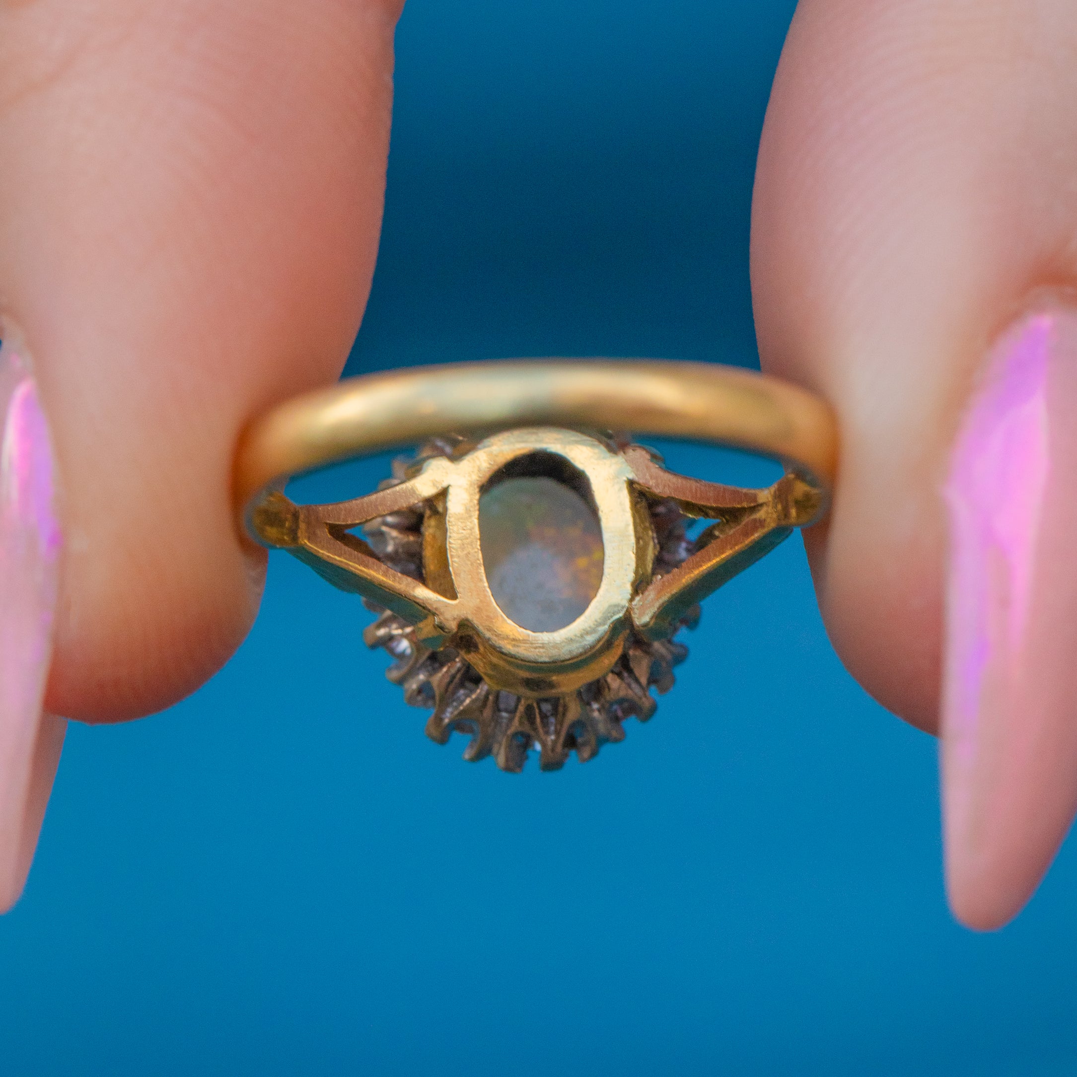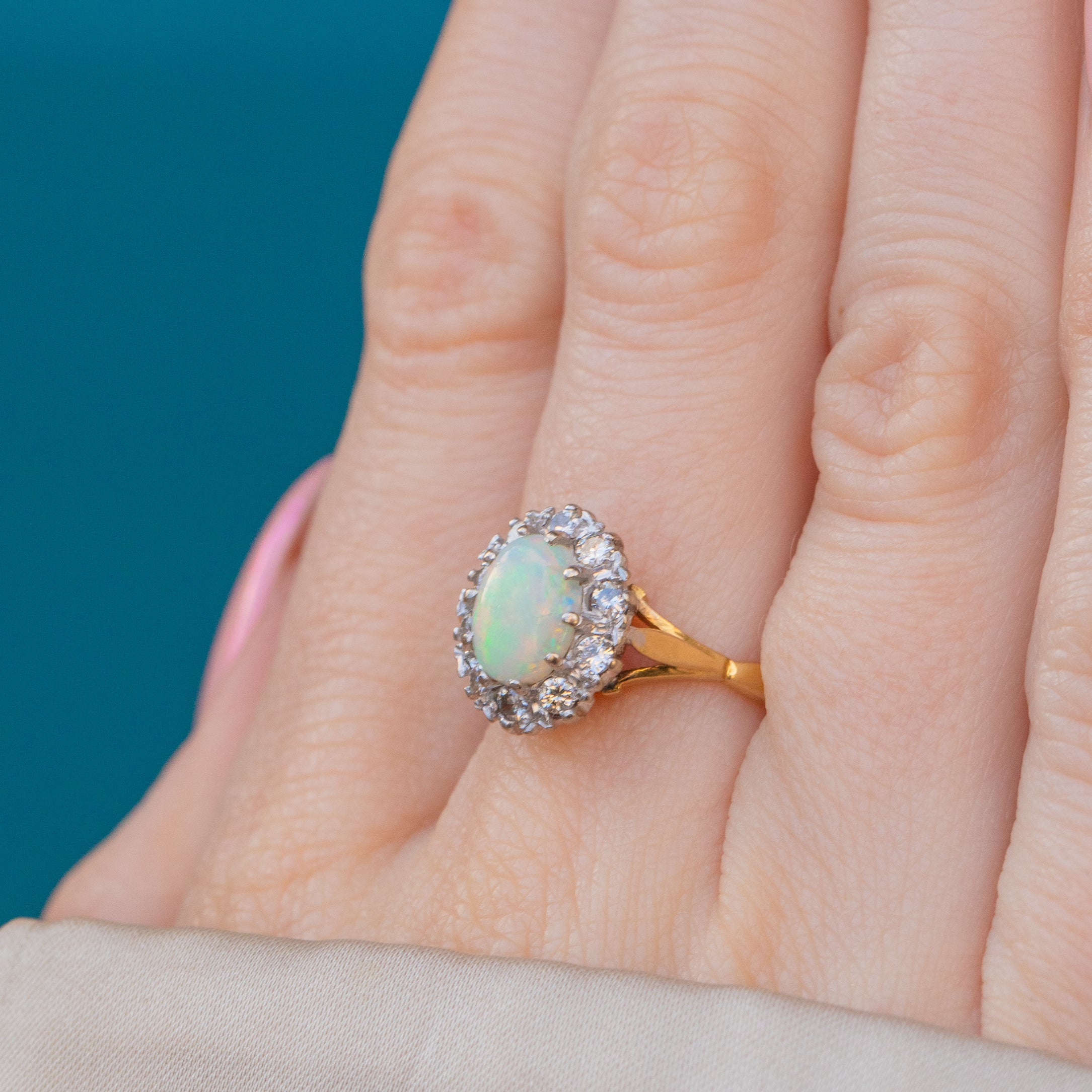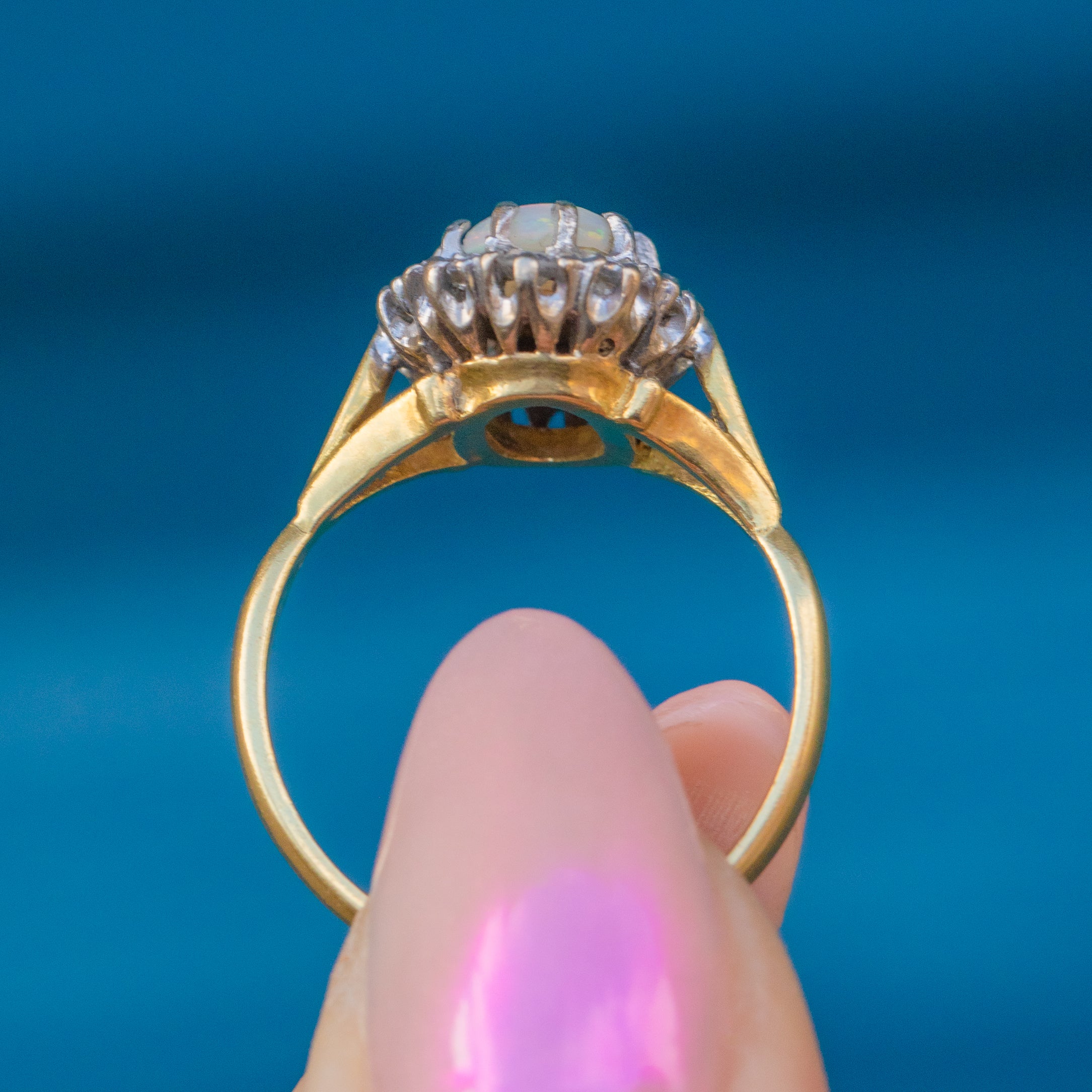 Add a touch of timeless elegance to your collection with this breathtaking 18ct Gold Opal Diamond oval cluster ring!