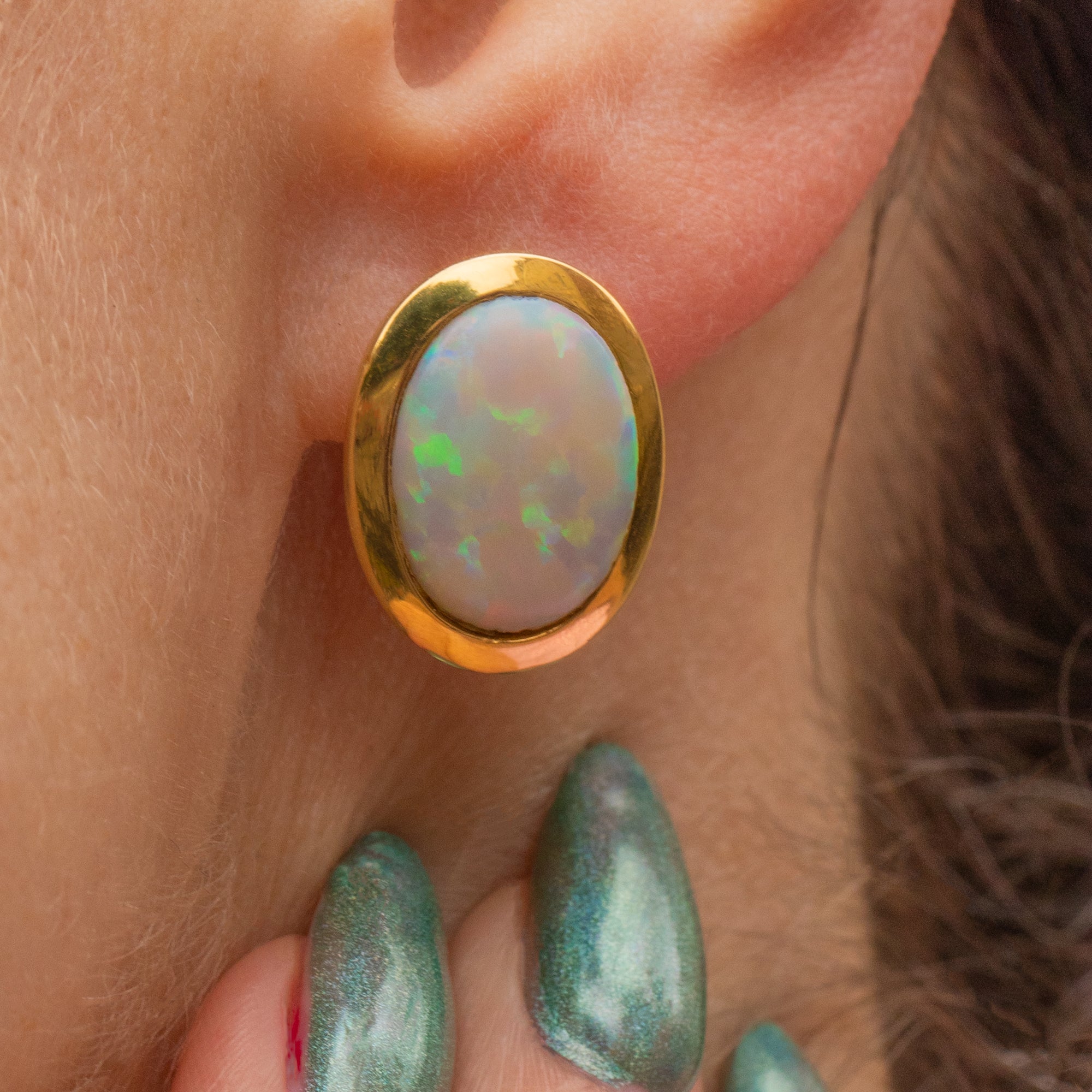 Each smoothly cut Opal hosts a fabulous play of colour, there are tangy greens, orange hues and ethereal pastel blues to wet your appetite! With a total weight of 5.20ct, these solid 18ct Gold natural Opal earrings will dress your lobes impeccably, effortlessly adding elegance to your everyday.