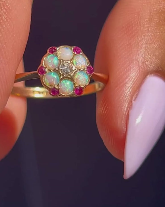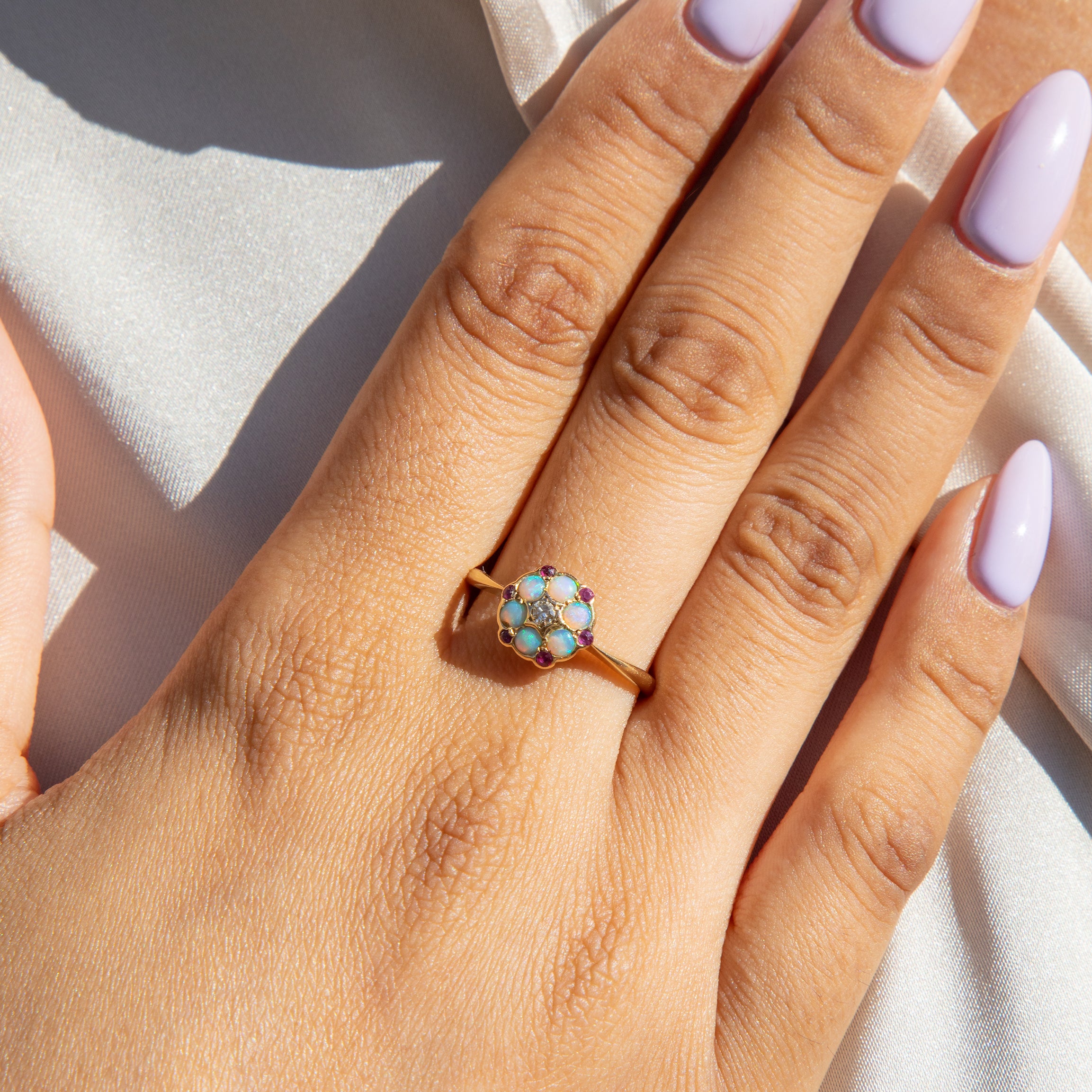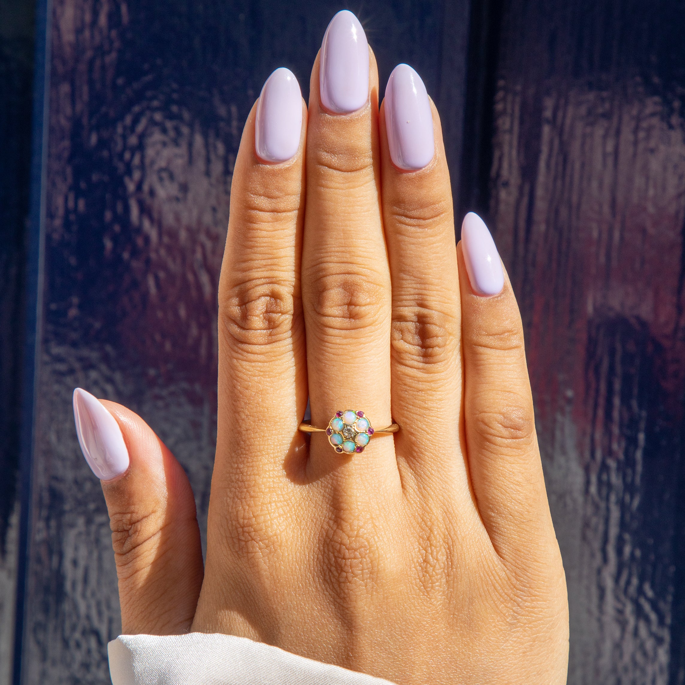 18ct ゴールド オパール ルビー フラワークラスターリング、0.25ct オパール