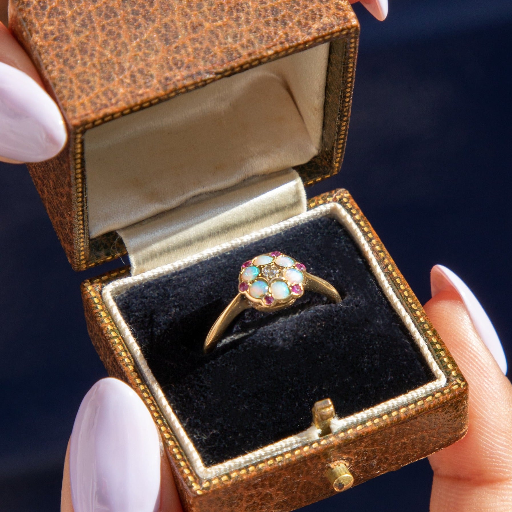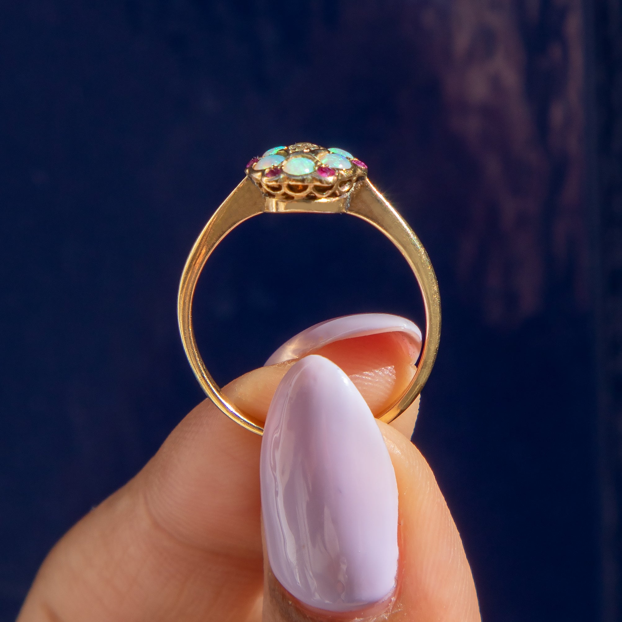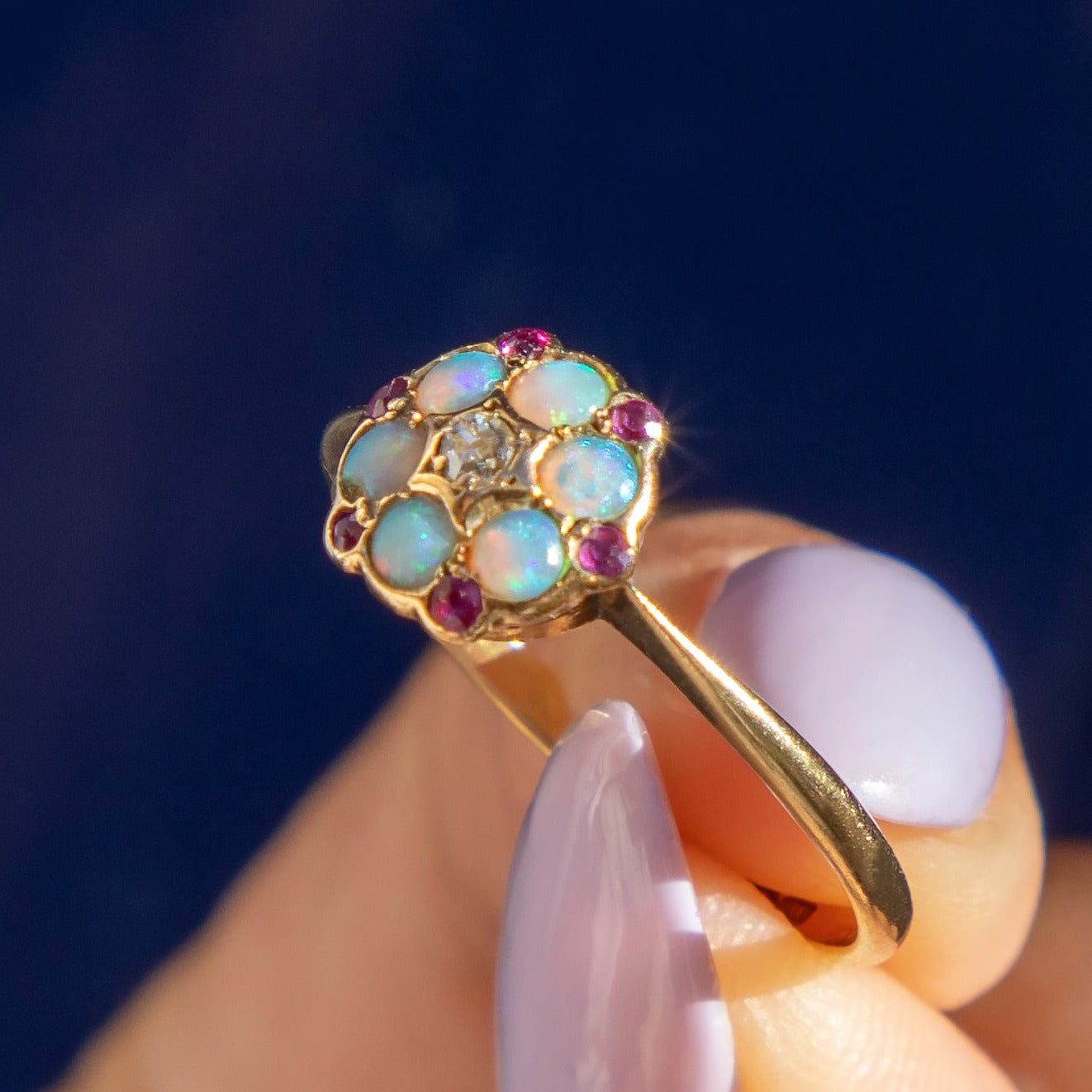 18ct ゴールド オパール ルビー フラワークラスターリング、0.25ct オパール