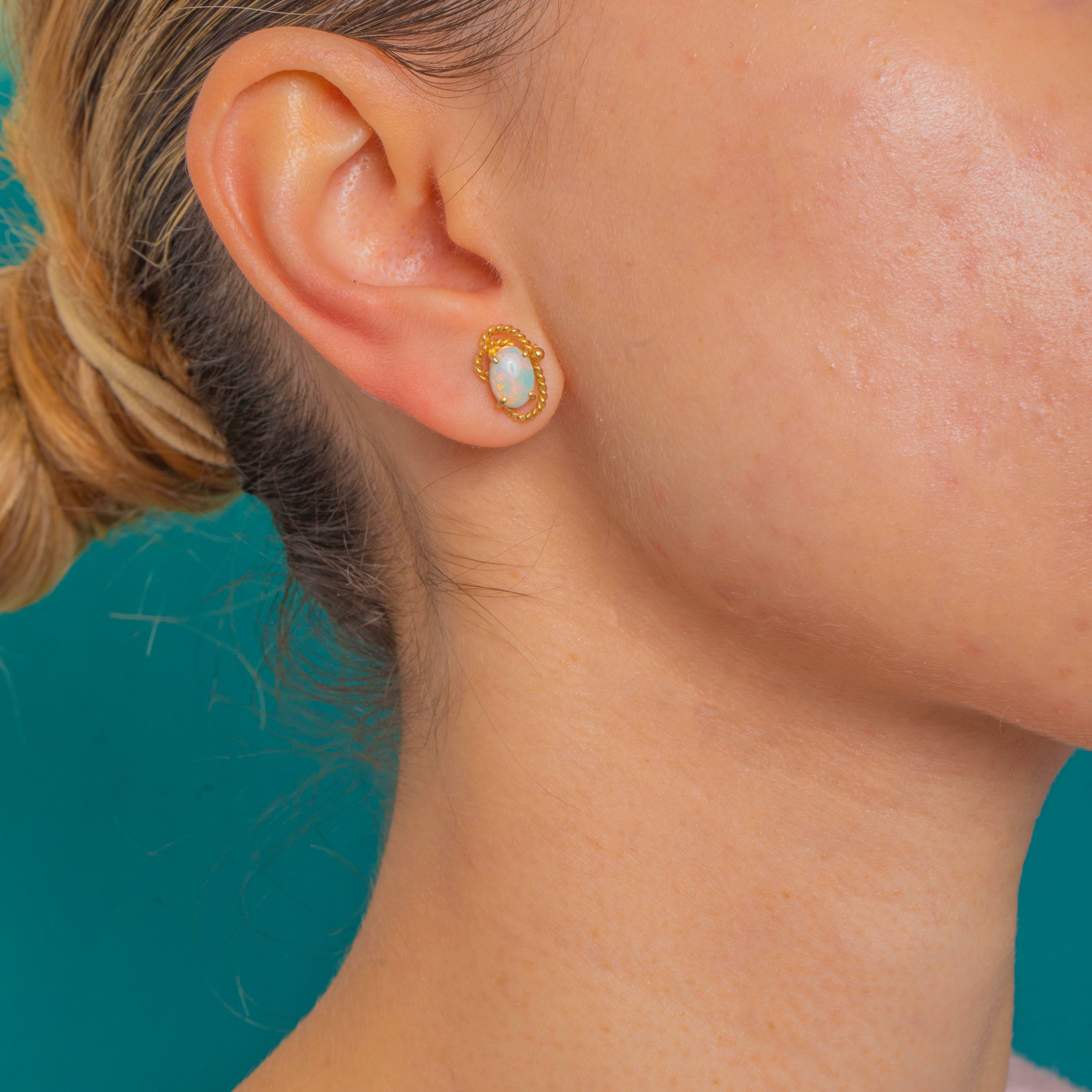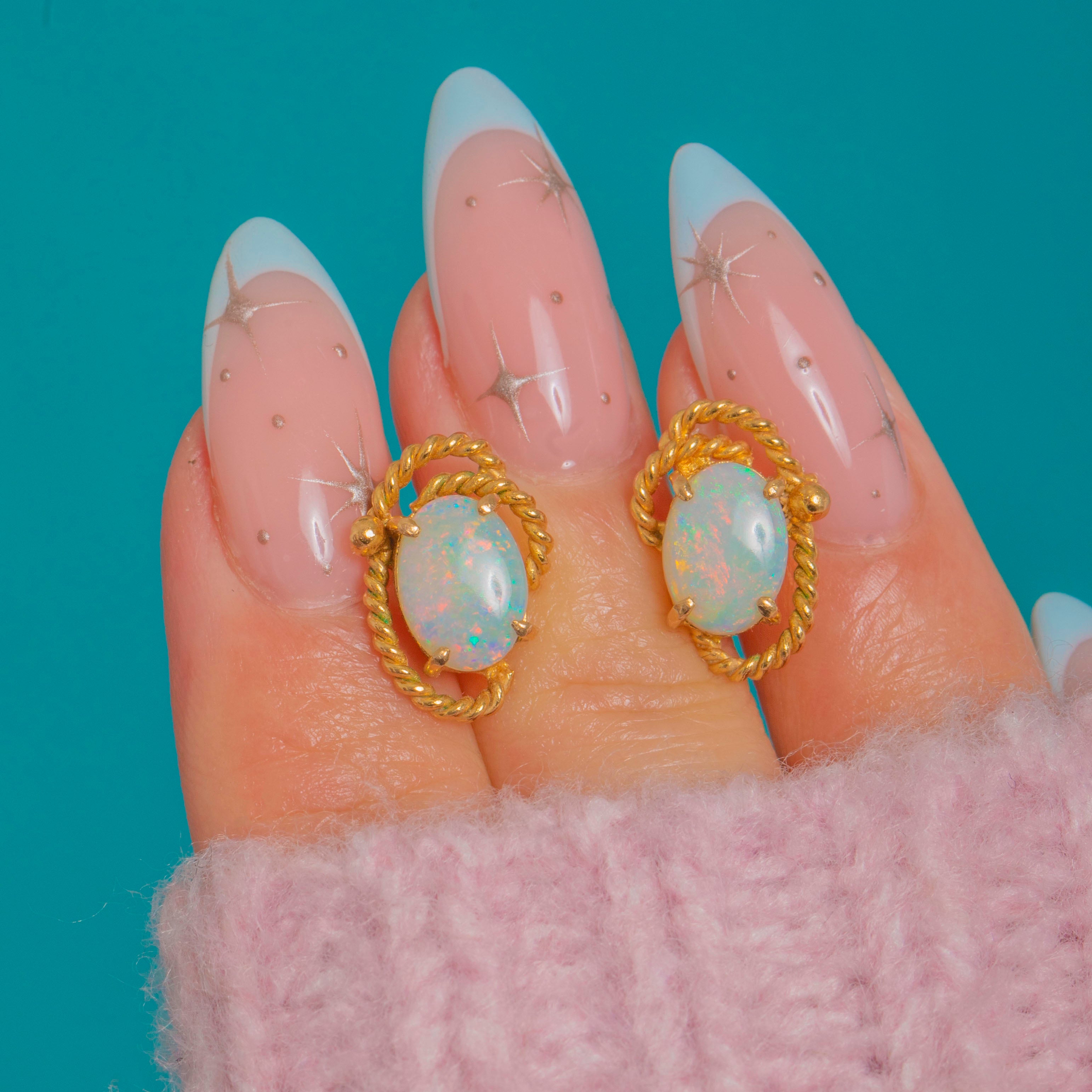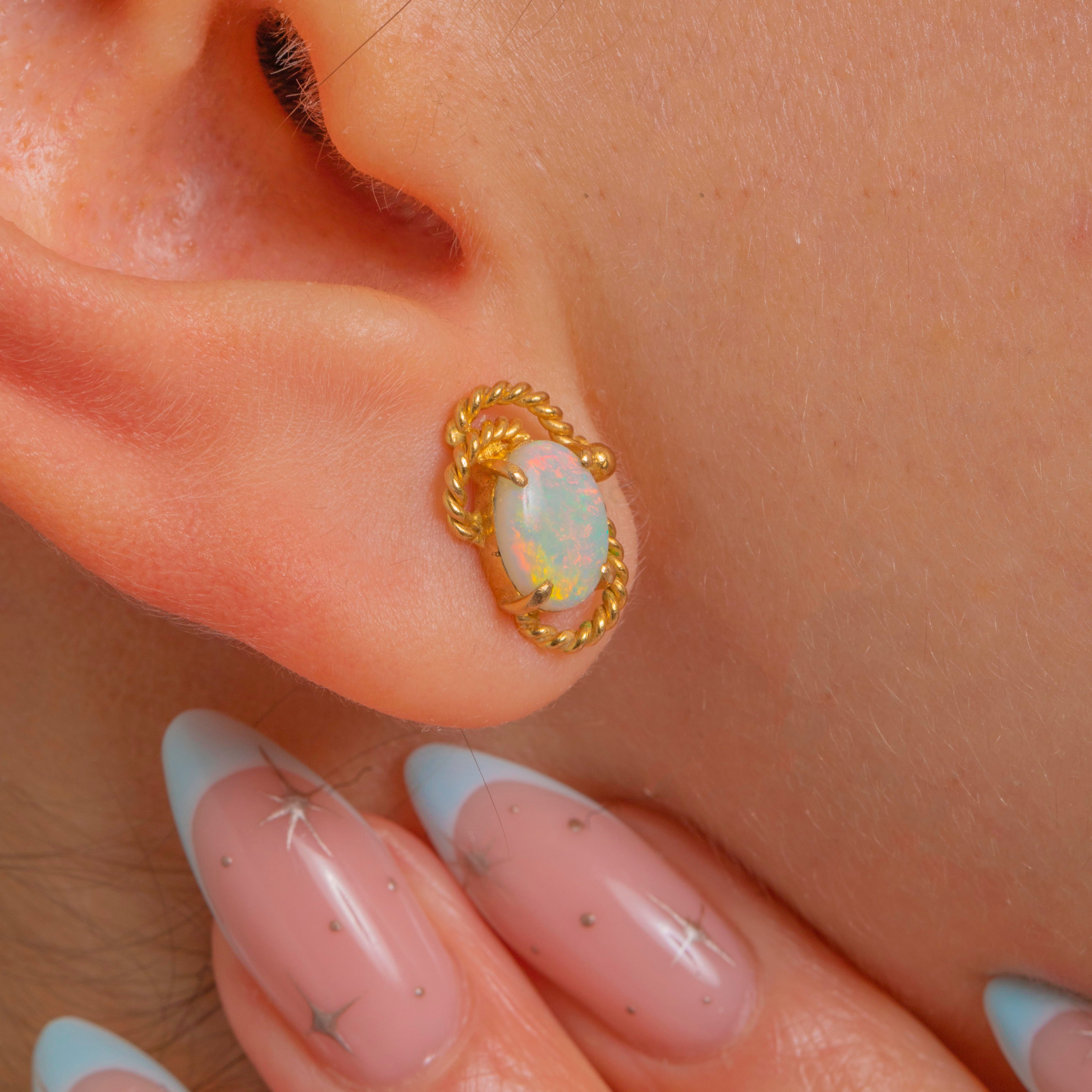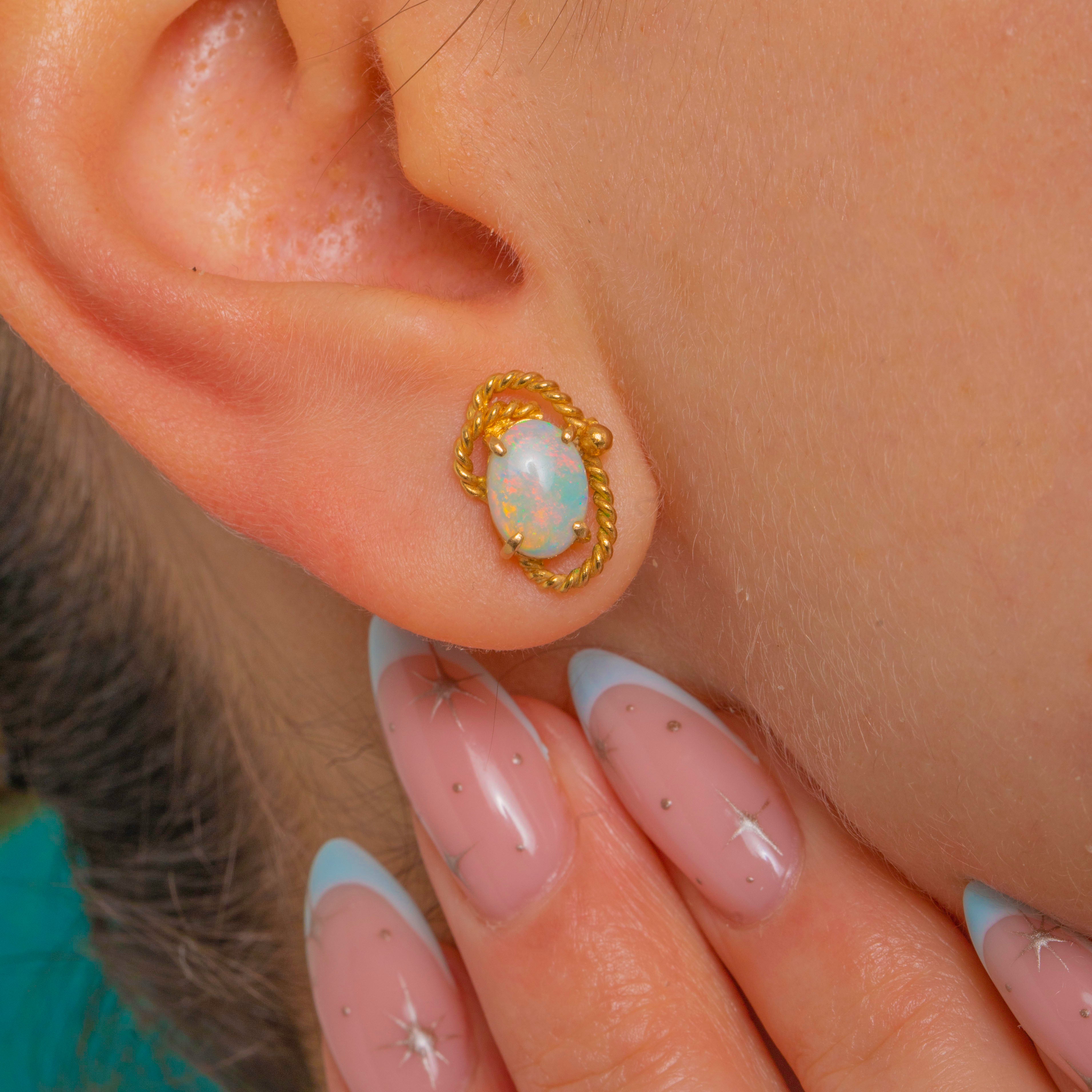 Joyful flashes of colour radiate from these Vintage Opal stud earrings, framed by a charming rope‑twist halo. Each natural, solid Opal displays vibrant play‑of‑colour—pops of red, orange, pink, green and blue—held securely in classic four‑claw mounts for a timeless, elegant look.