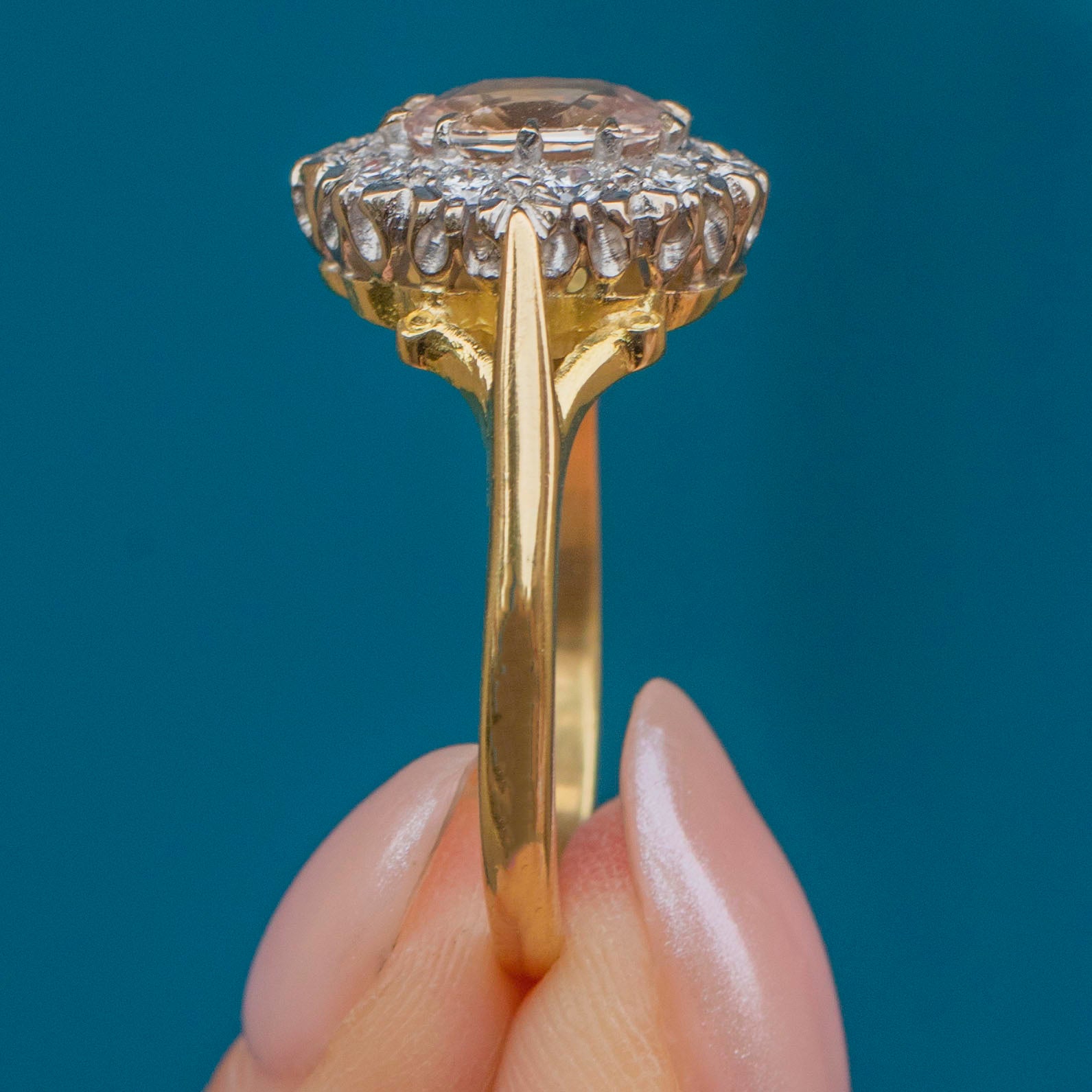EXCELLENT. This 18ct Gold Padparadscha Sapphire Diamond cluster ring is in excellent condition! The Sapphire is free from any scratches and the Diamonds have a brilliant crisp white hue! Fully hallmarked for the date c.1988 this ring is ready to be a girls best friend!