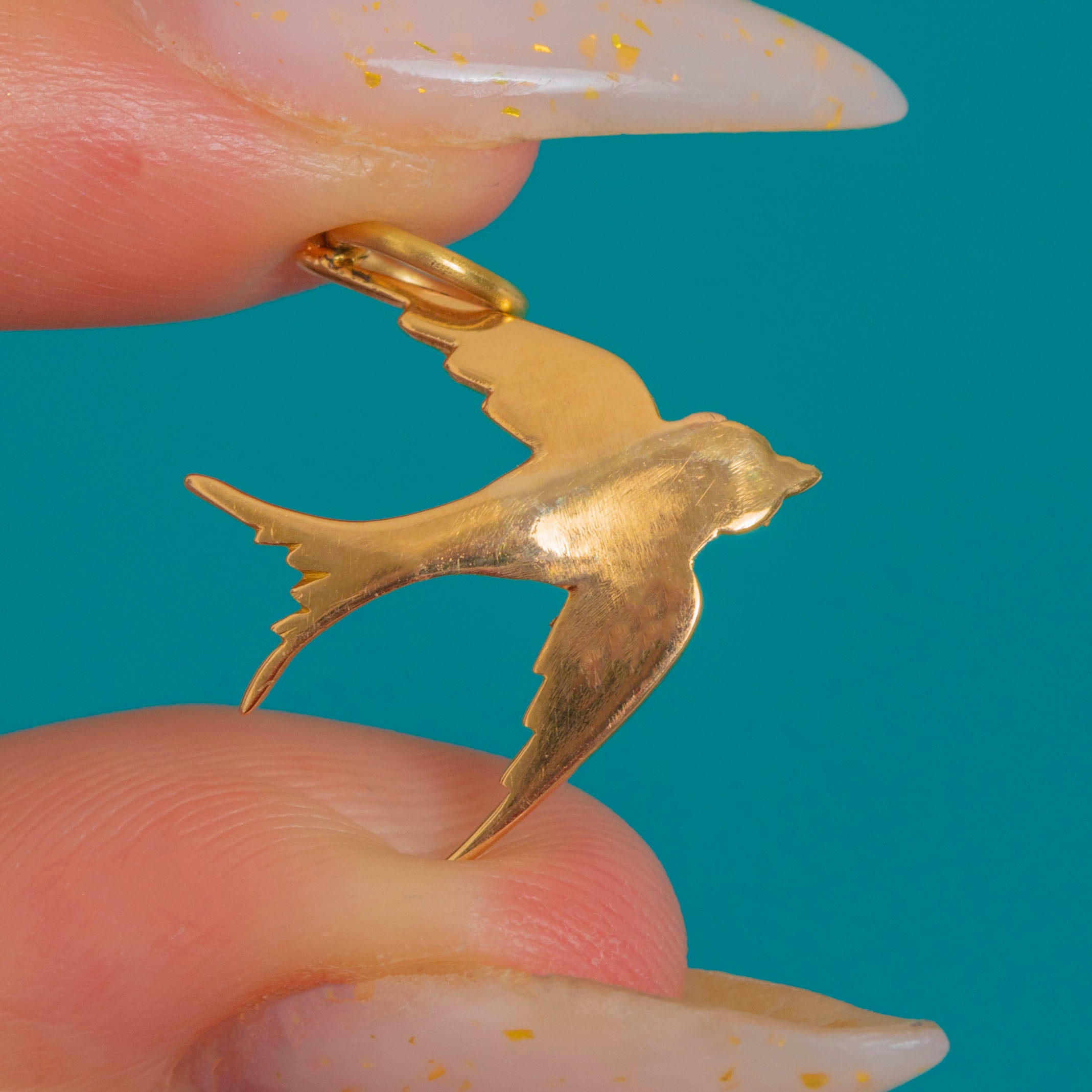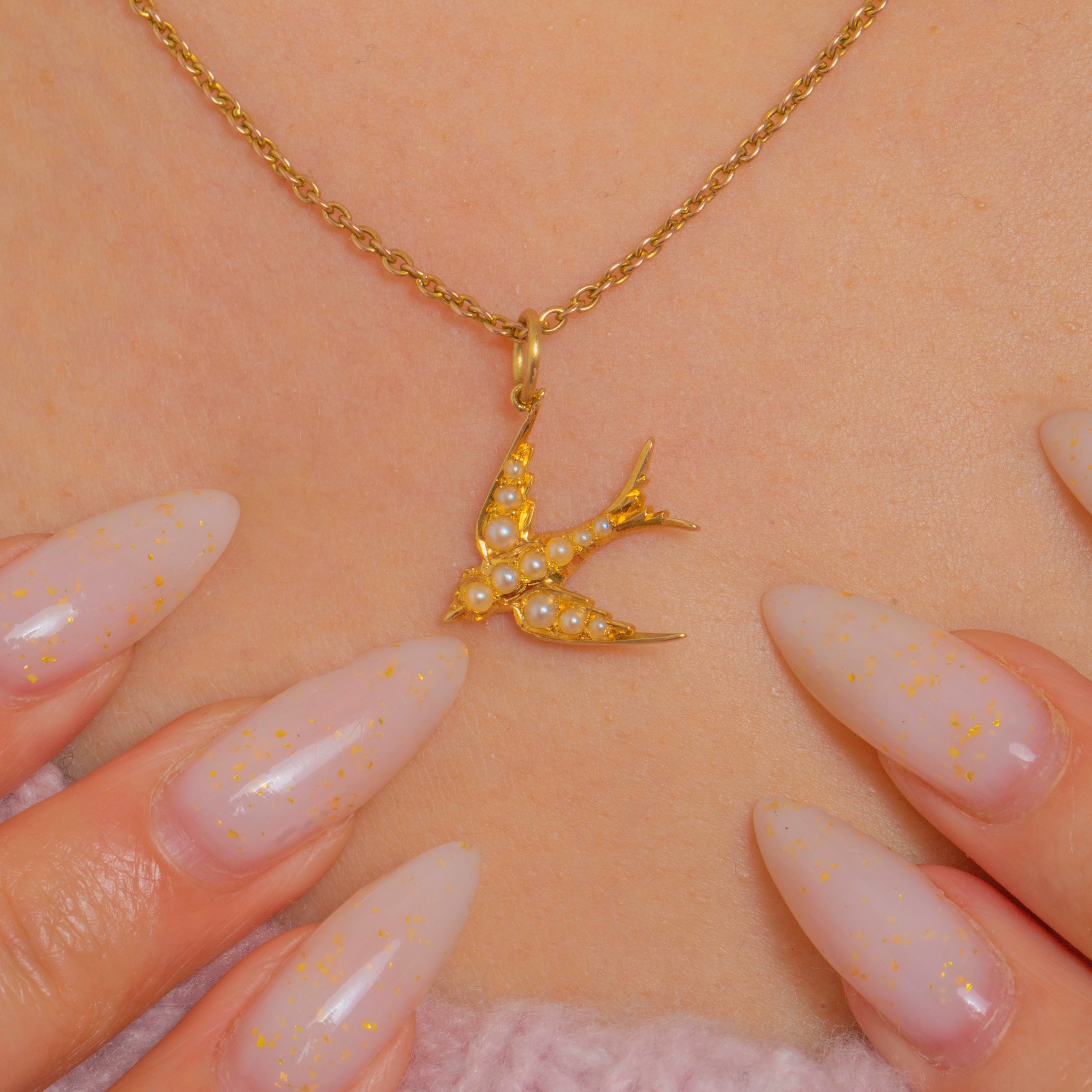 A petite Victorian treasure, this 18ct Gold sparrow charm is set with a delicate sweep of creamy Pearls that shimmer across its wings and body. The graceful bird-in-flight silhouette and polished Gold bring a soft glow and a touch of sentiment to any look.