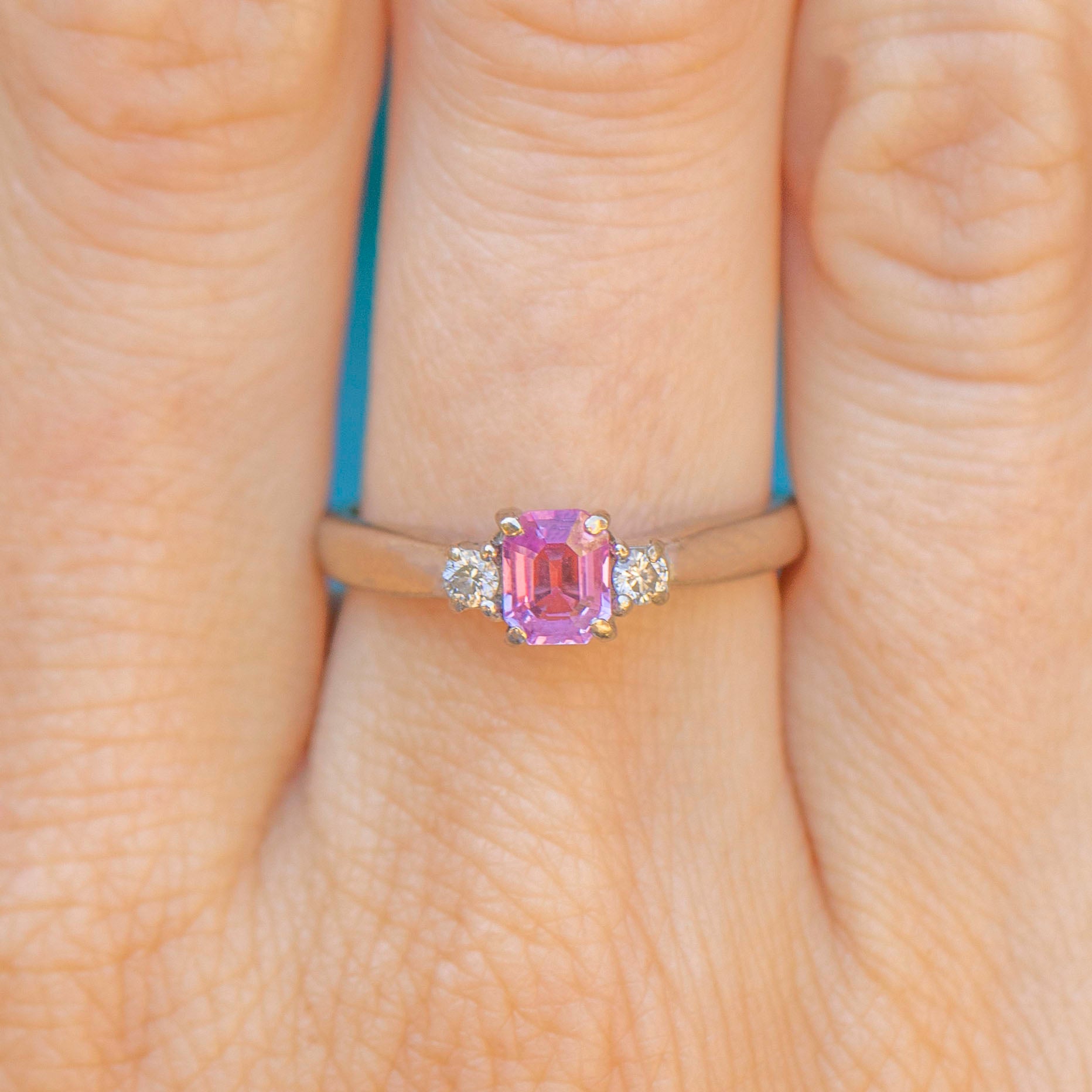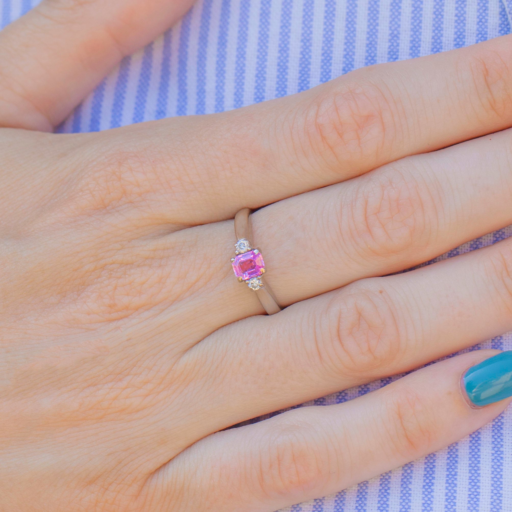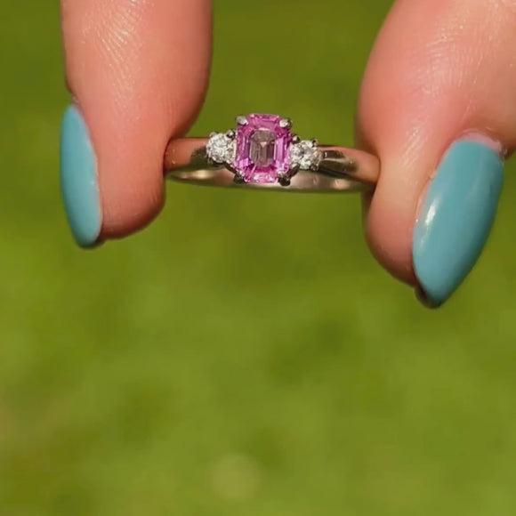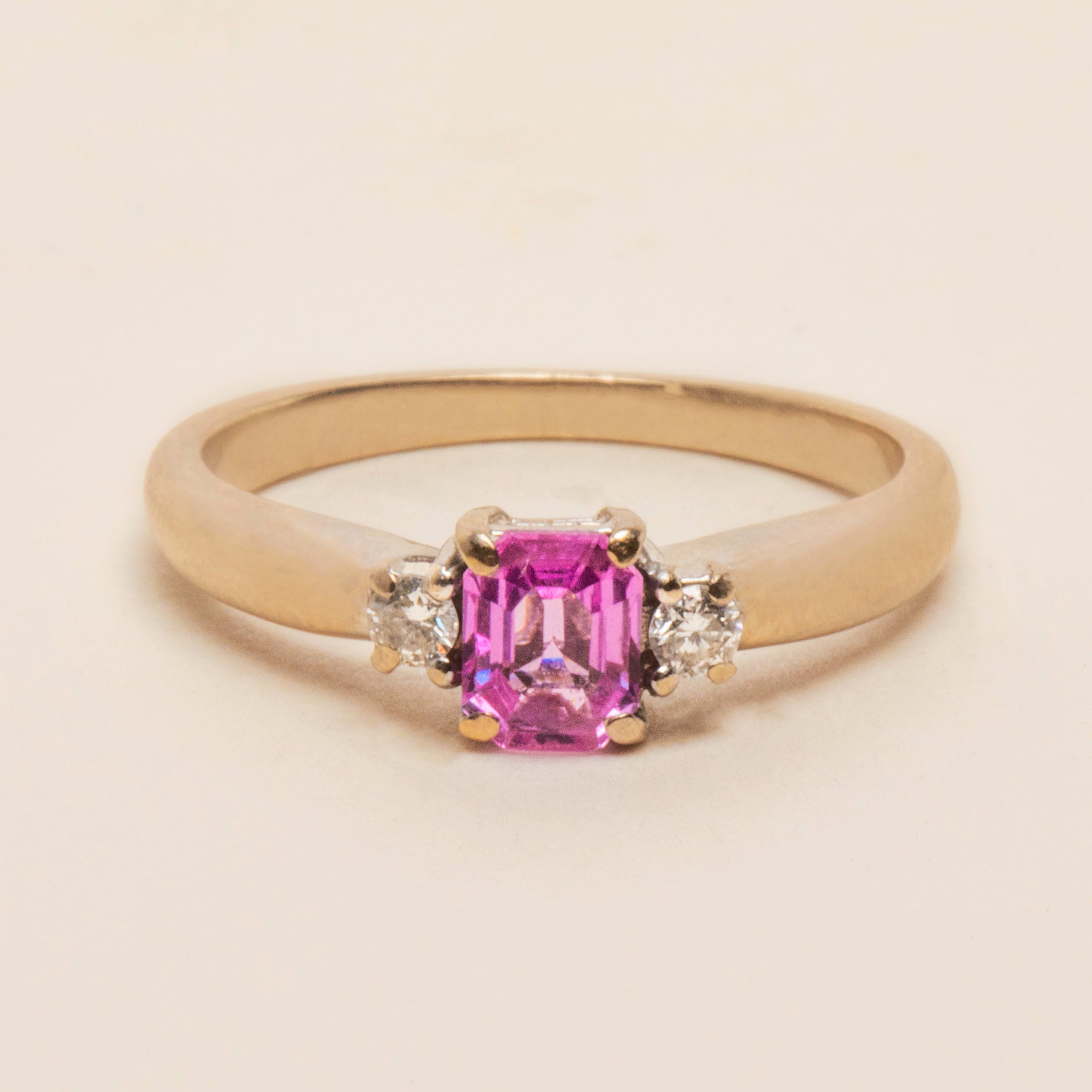 This 18ct Gold pink Sapphire Diamond three stone ring is fit for the jewellery box of a princess! In her centre lies a pretty 0.40ct pink Sapphire with an irresistibly feminine sparkle, nestled between two crisp white Diamonds.