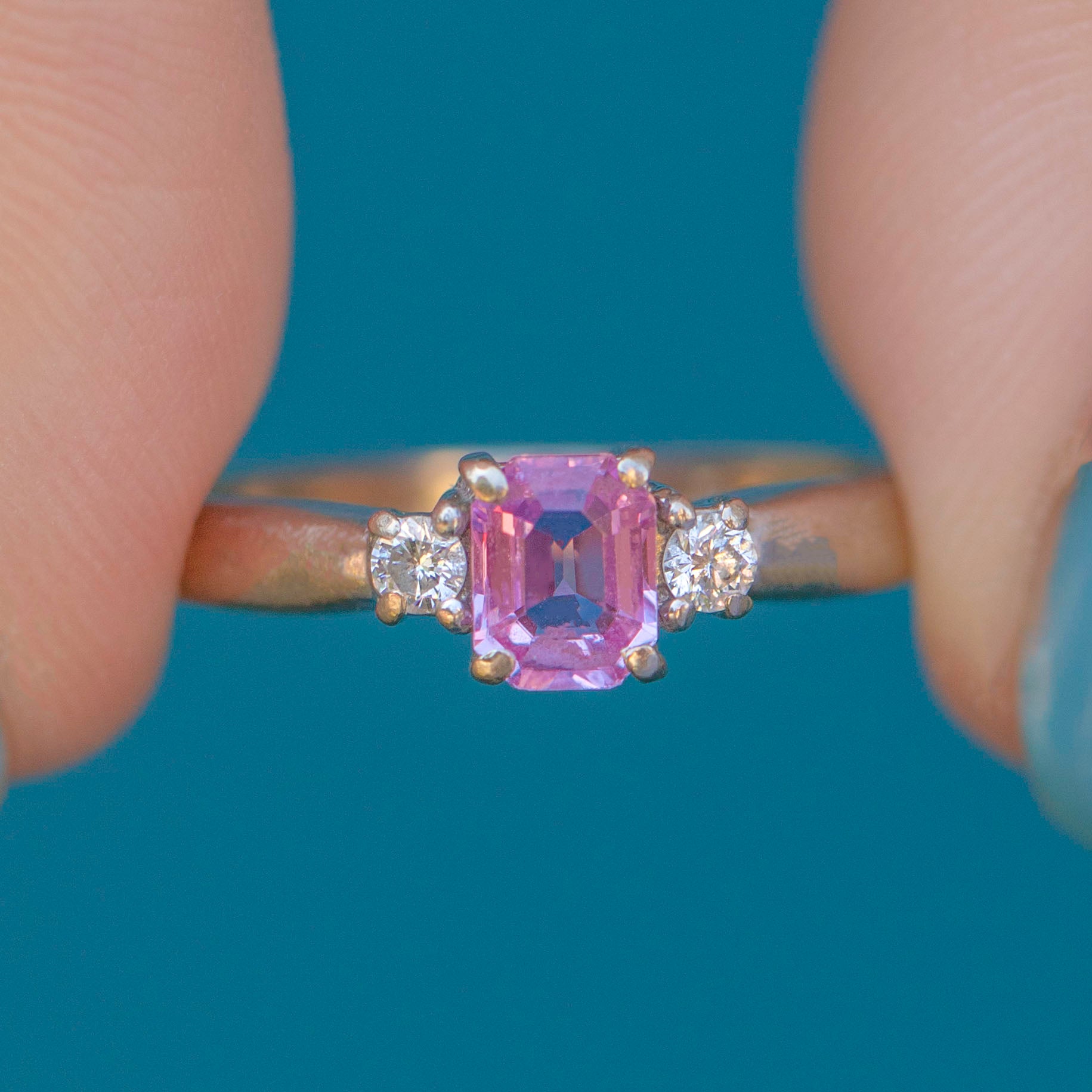 VERY GOOD-EXCELLENT. This 18ct Gold pink Sapphire Diamond three stone ring is in wonderful condition! The Sapphire and Diamonds are secure within their settings, with no damage to the facets to note. The ring band is sturdy and well formed, gliding onto your hand a dream. There is a small resize mark on the back, but rest assured this cannot be seen when worn! A timeless addition to any jewellery collection!