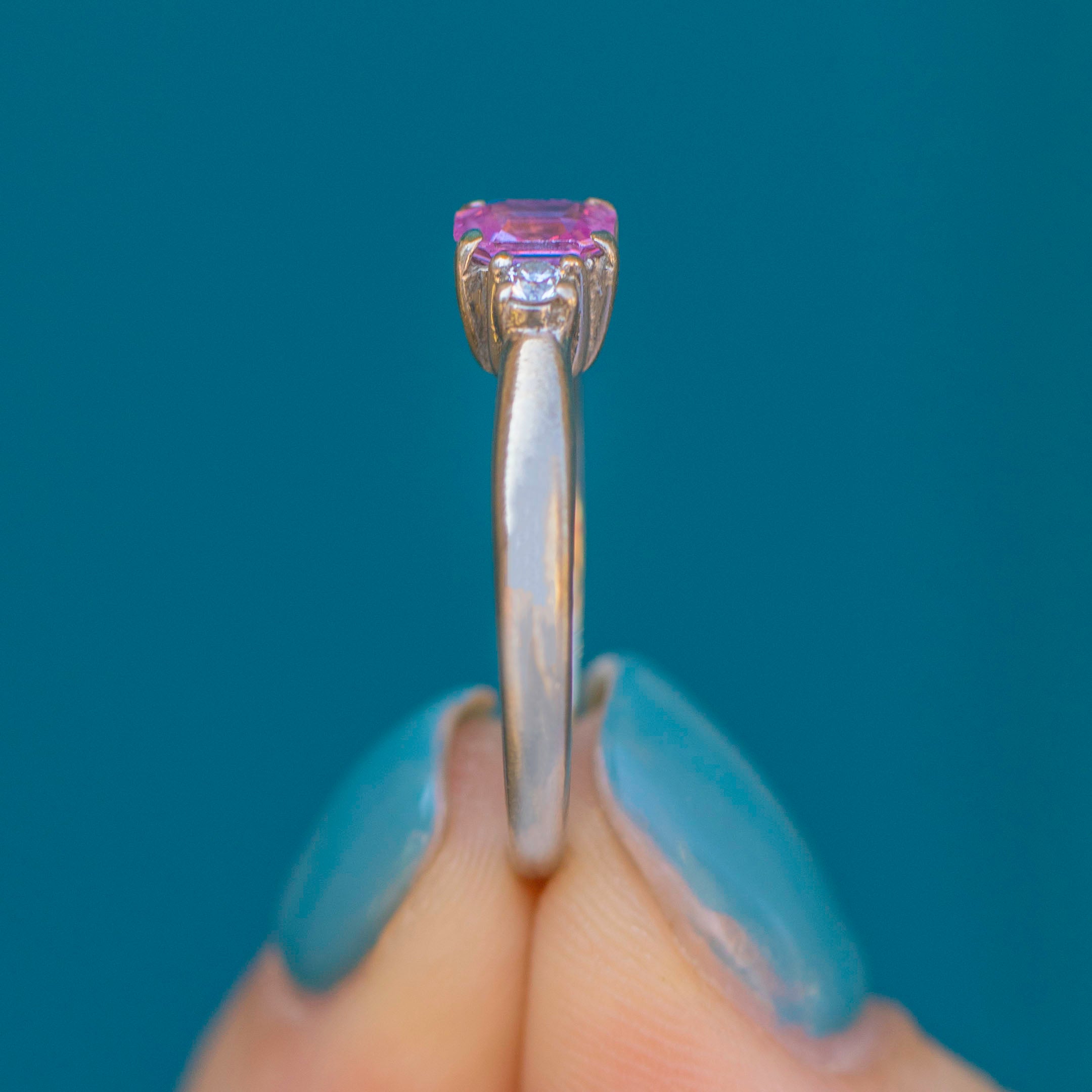 MATERIALS: Tests as 18ct White Gold throughout, Pink Sapphire (0.40ct), Diamond (0.08ct).