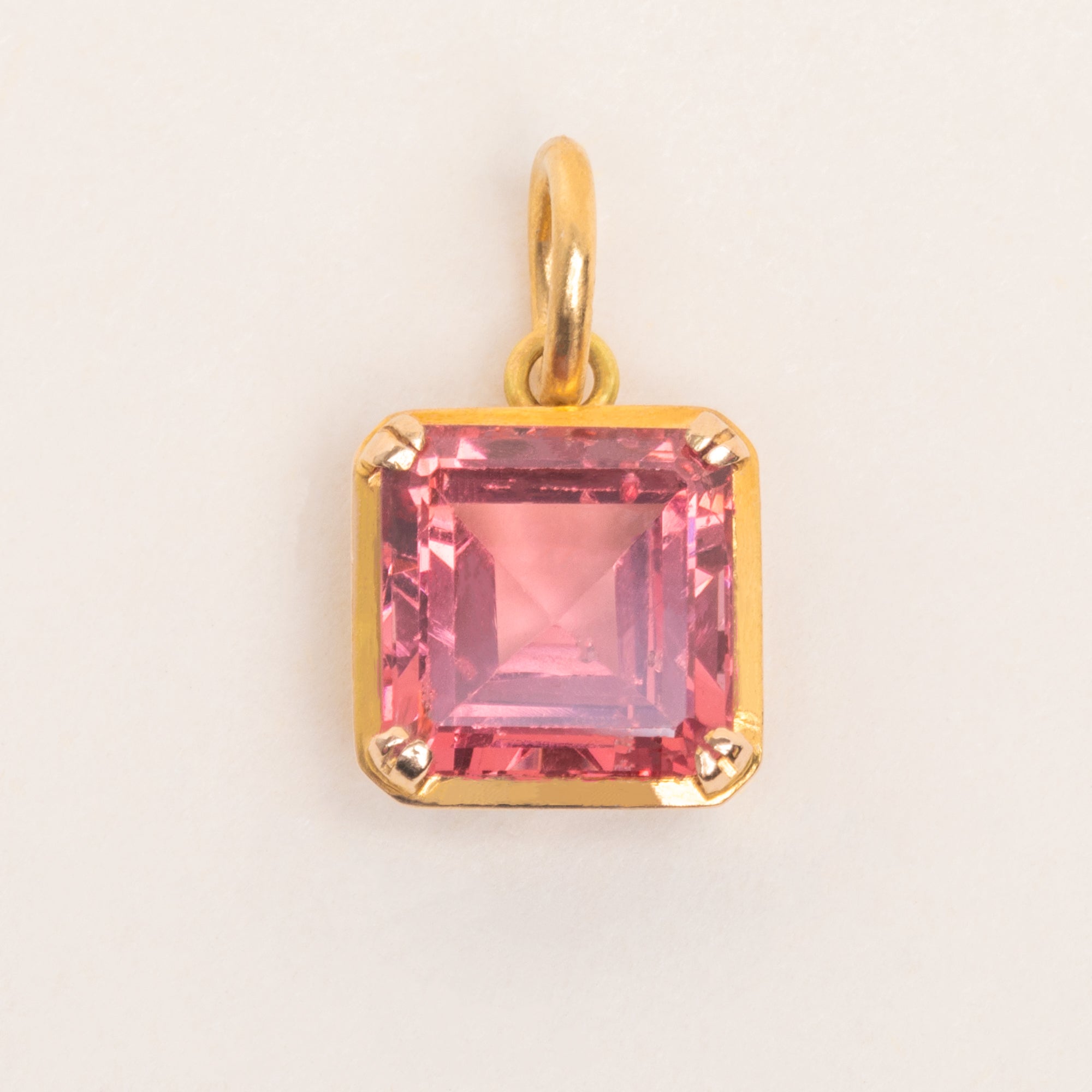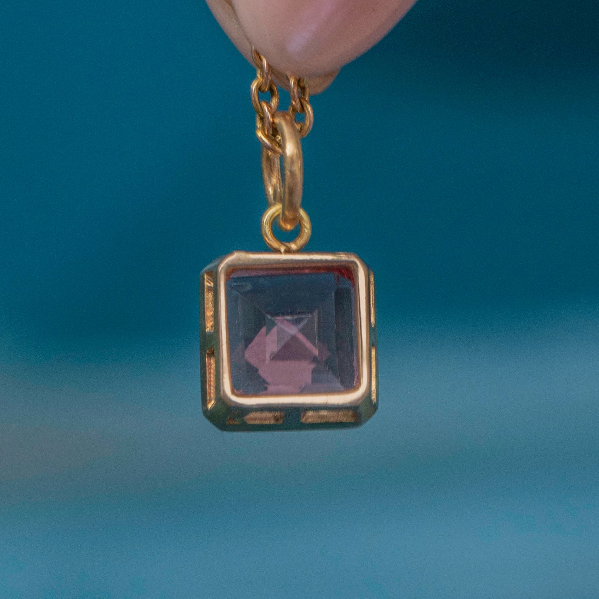 CONDITION. This 18ct Gold Rose Pink Synthetic Spinel pendant is in excellent condition. The Spinel exudes unique blush hues from her crisp facets with inclusions visible under close inspection. The Gold is brightly saturated and the setting holds the gemstones securely, with no dings or scuffs to note. With a generously sized soldered jump ring, you can suspend this eye-catching Art Deco charm from a chain with ease!