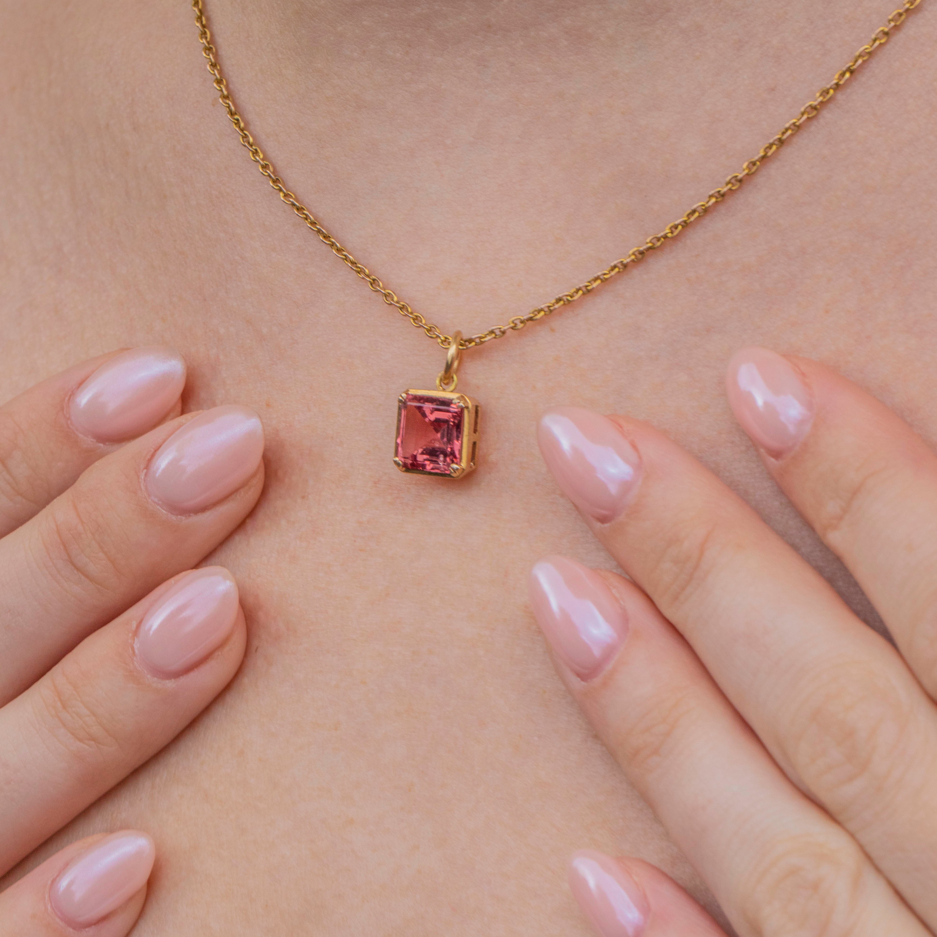 Welcome this subtle, dainty 18ct Gold Rose Pink Synthetic Spinel Pendant into your jewellery collection and she's bound to bring you years of wearing pleasure!