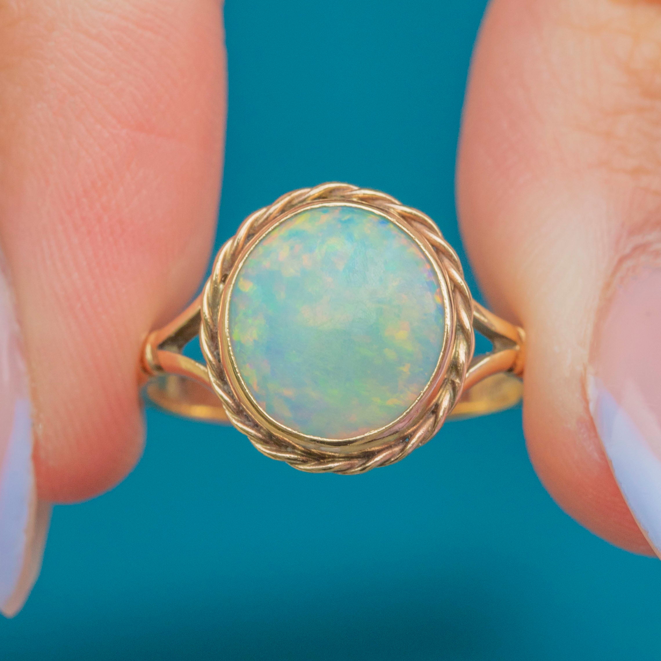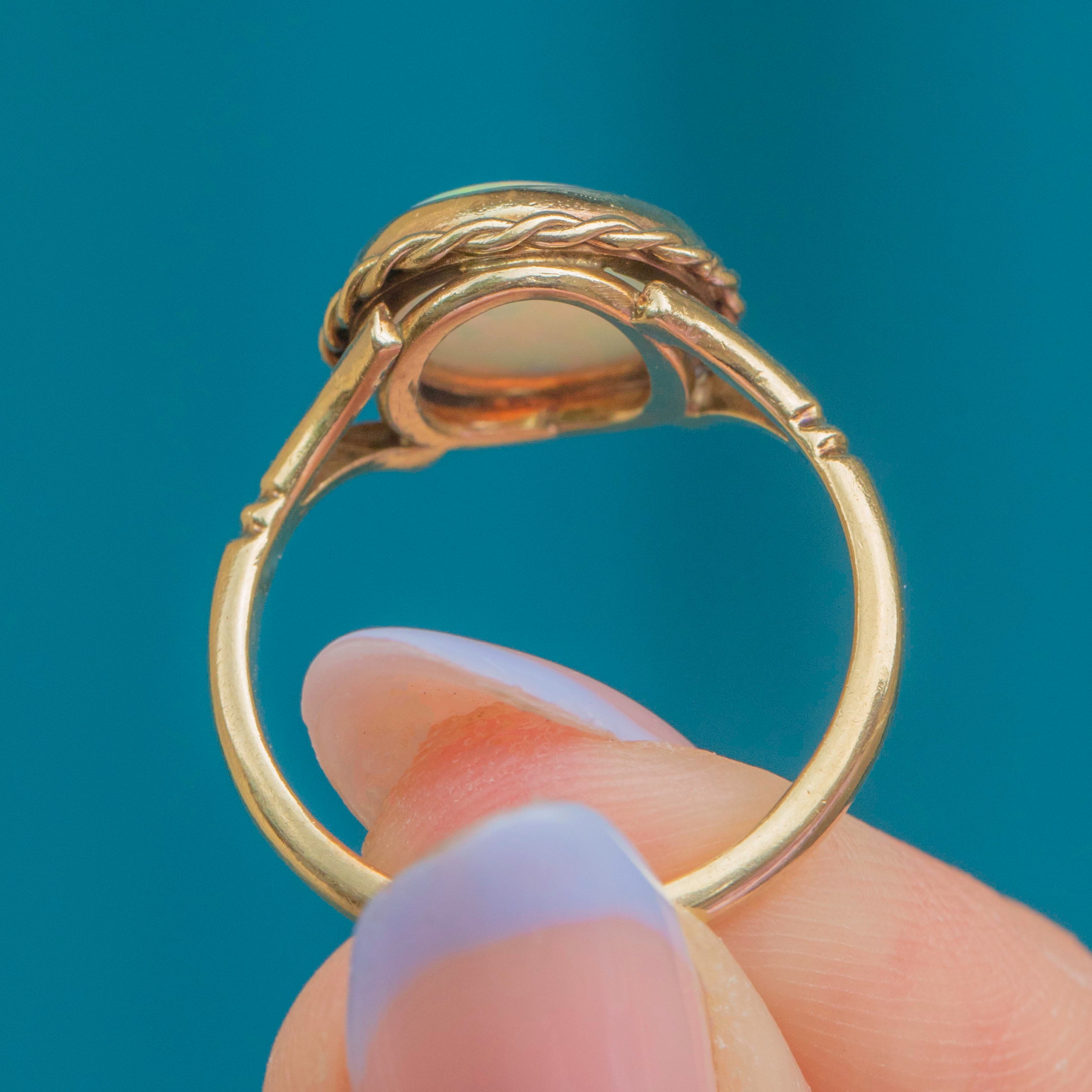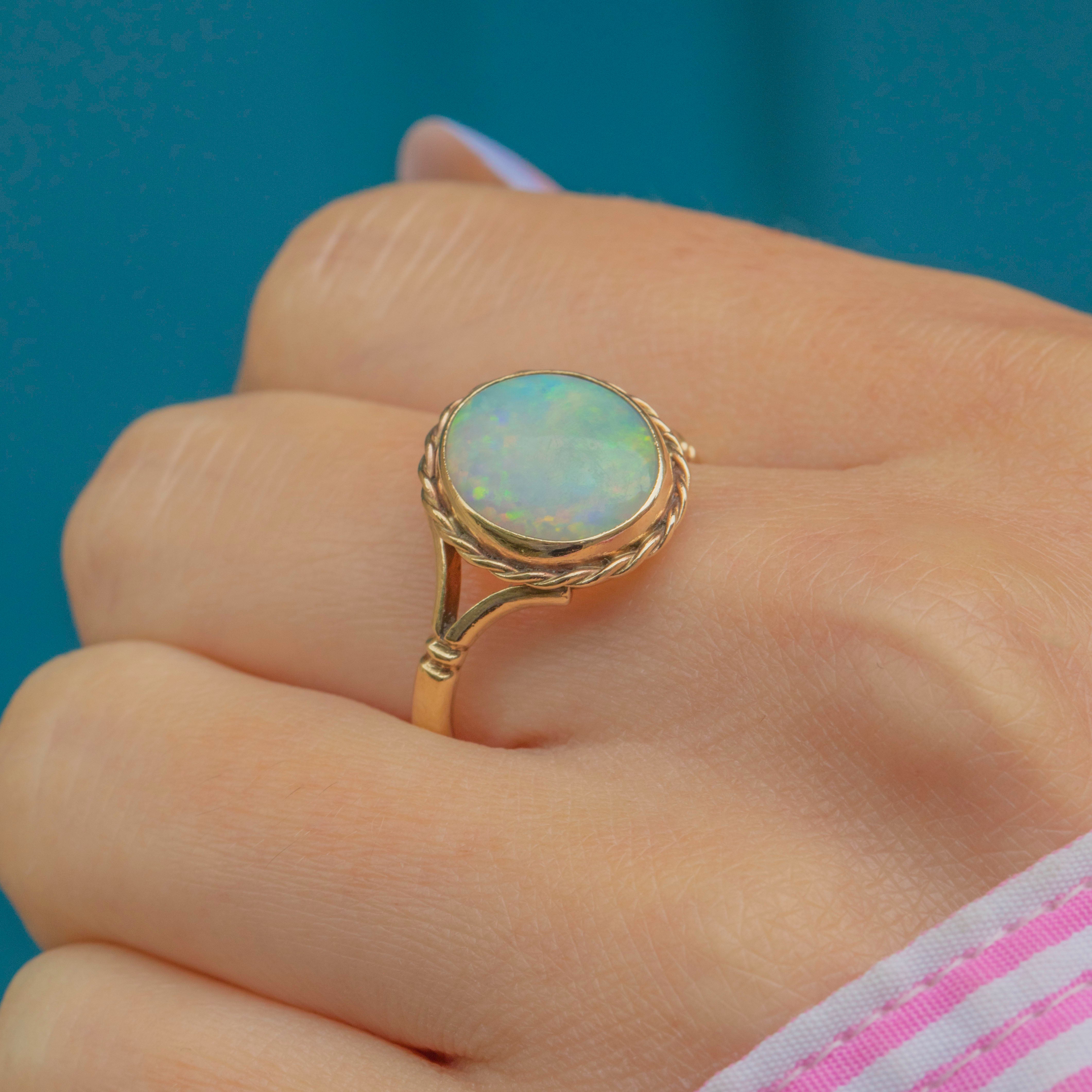 Boasting a vibrant 0.65ct Opal cabochon, this ring radiates soft sage green and lilac hues, flaunting a kaleidoscope of striking oranges and pinks as she catches the light. Her Opal is set within a buttery 18ct Gold bezel and framed by a softly twisted rope border for an eye-catchong finish.