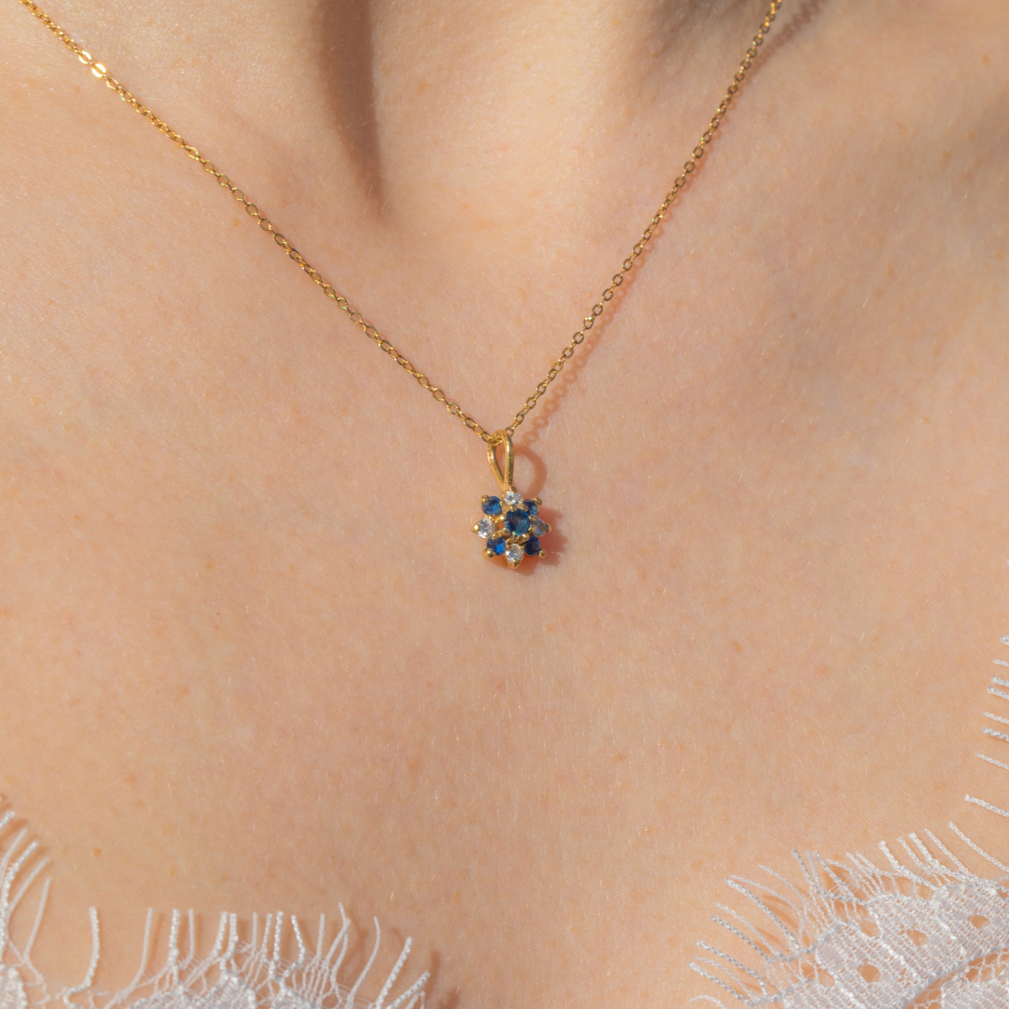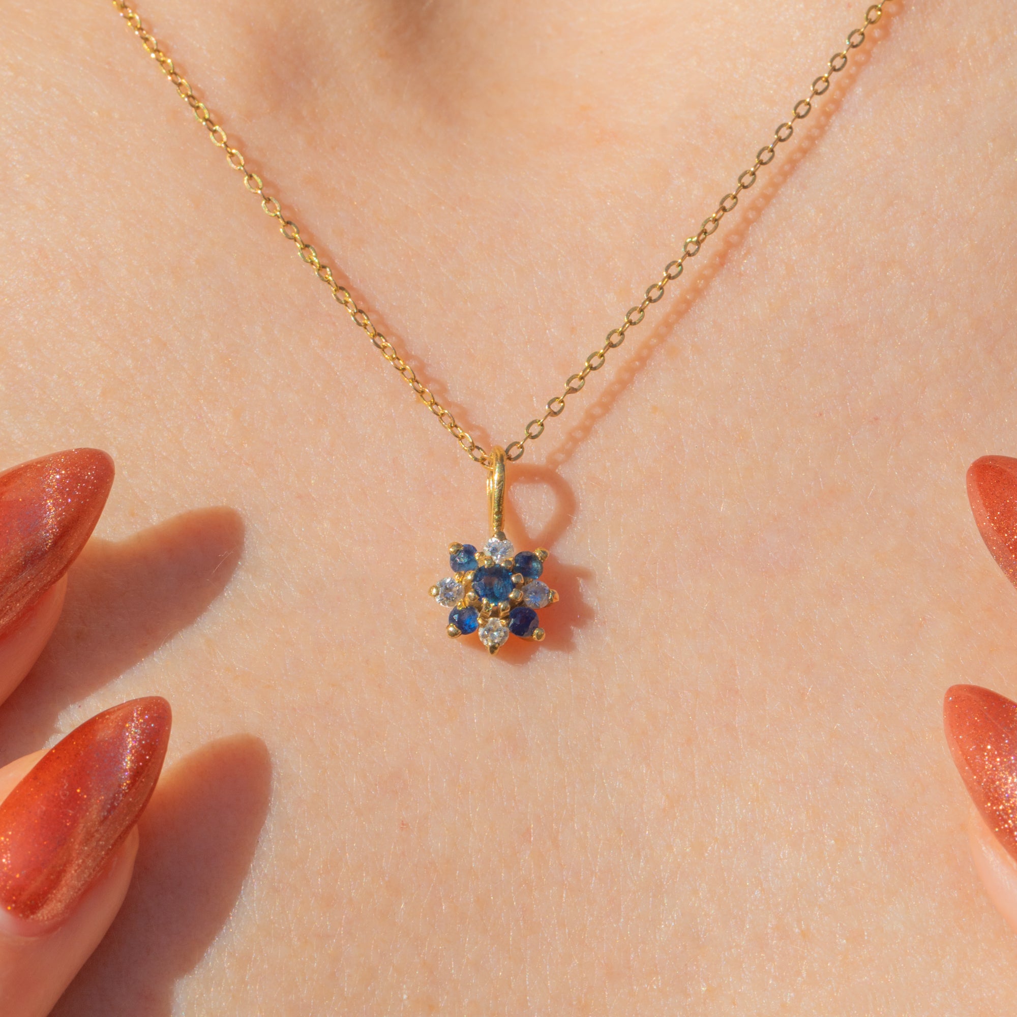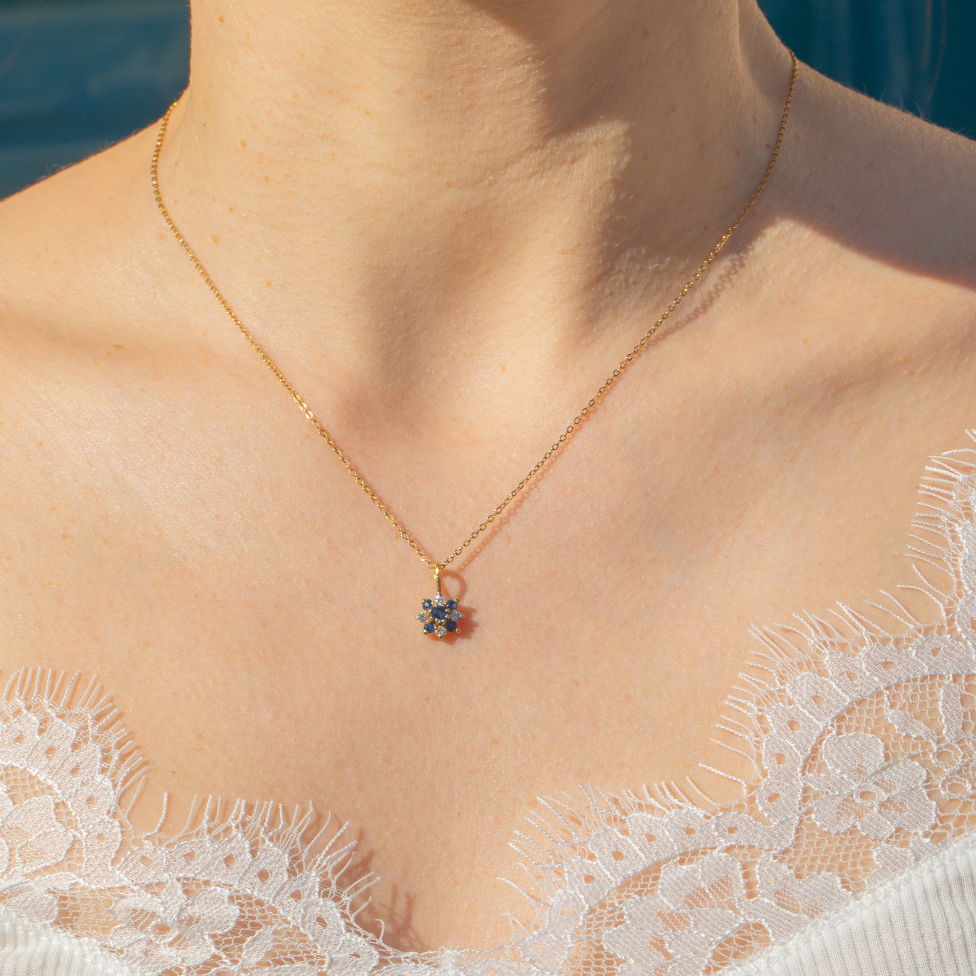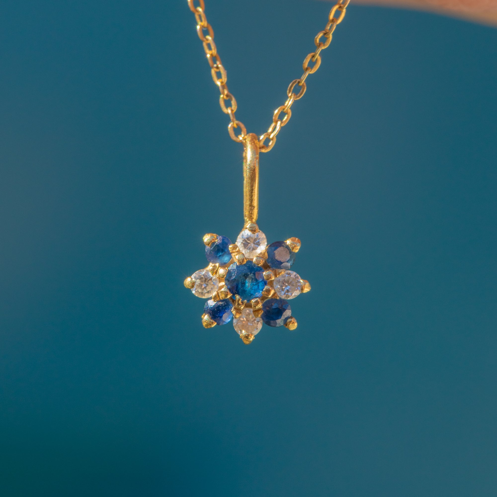 Featuring a cluster of Sapphires and Diamonds, this petite vintage charm is crafted into a dainty floral motif. The gemstones are set within buttery 18ct Gold, complemented by a bright 16" Gold chain.