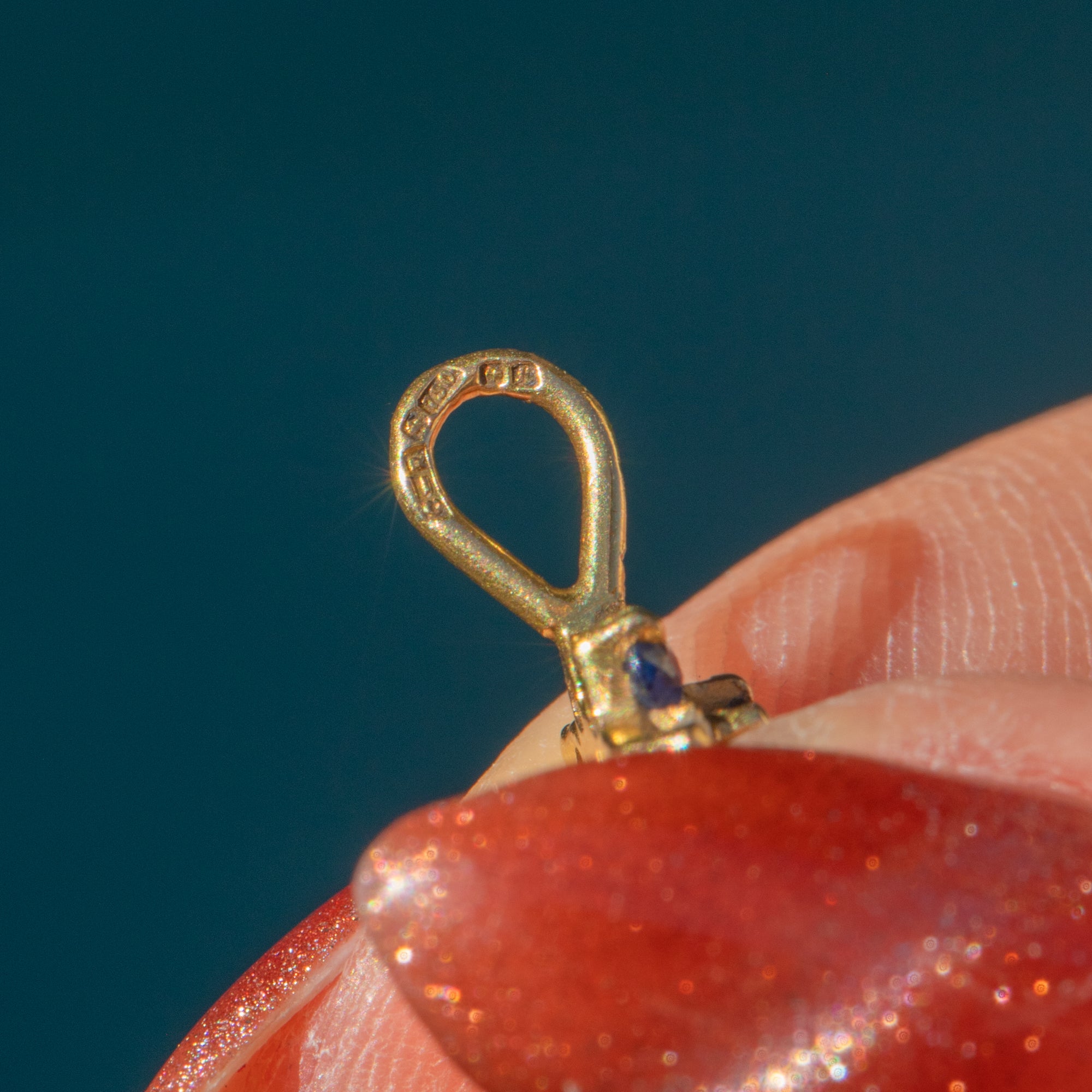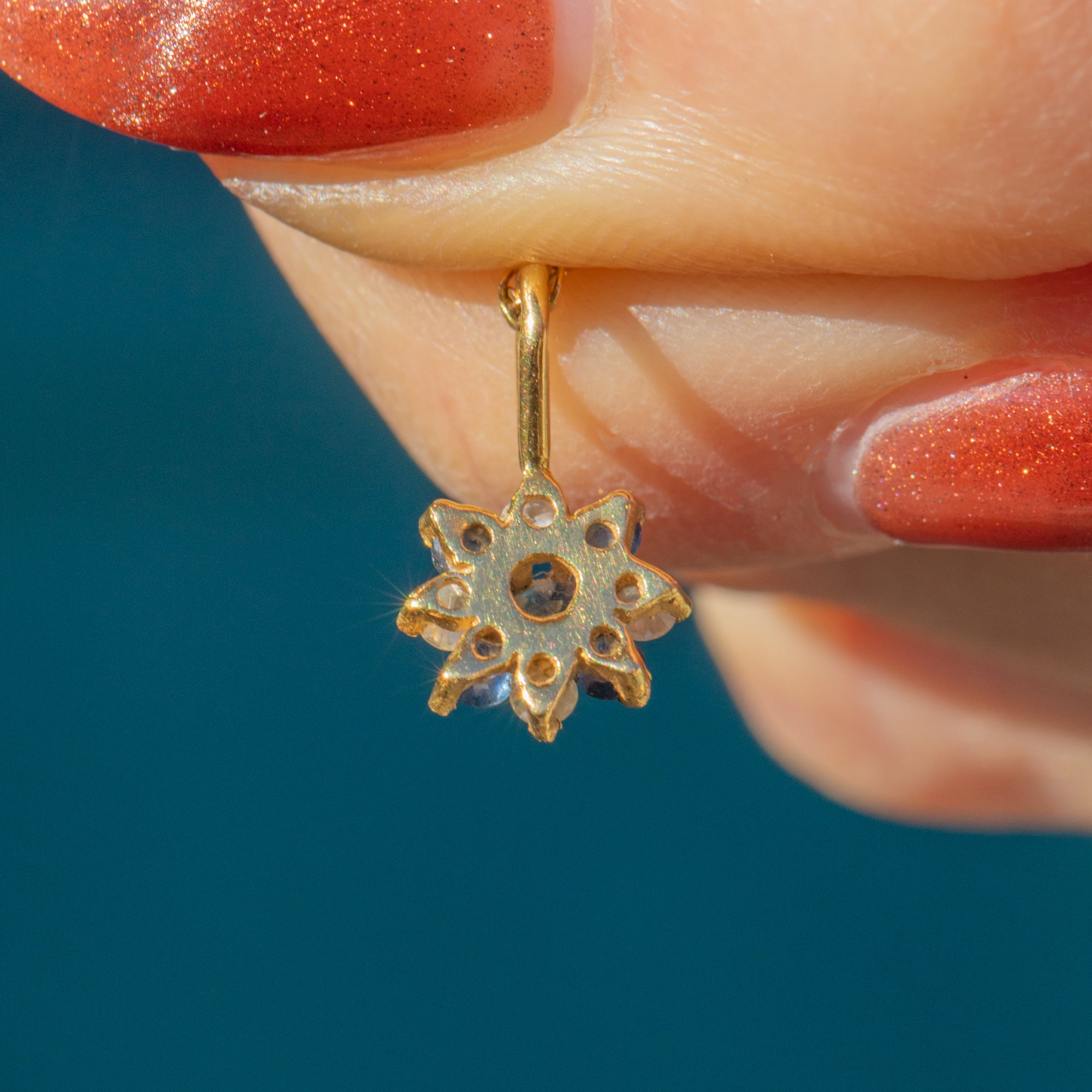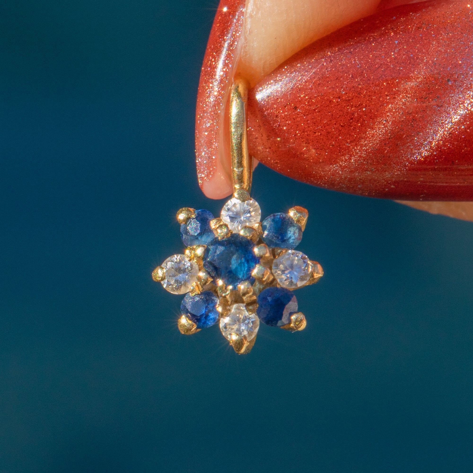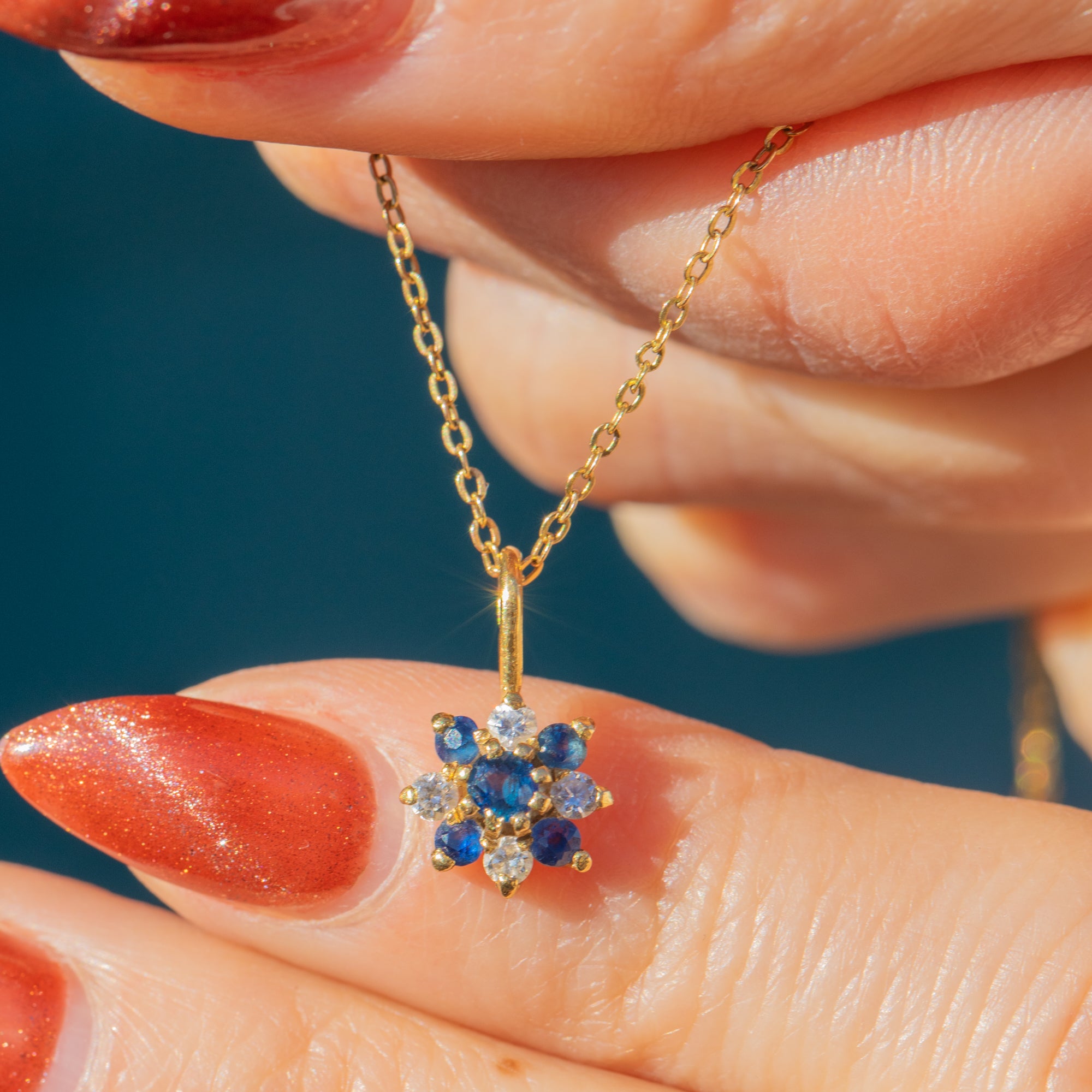 Featuring a cluster of Sapphires and Diamonds, this petite vintage charm is crafted into a dainty floral motif. The gemstones are set within buttery 18ct Gold, complemented by a bright 16" Gold chain.