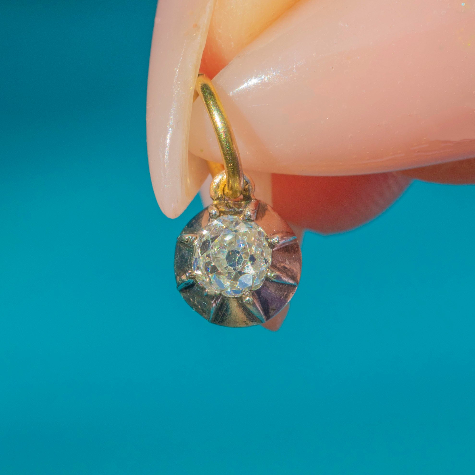 EXCELLENT: The Old Mine Cut Diamond is lively, secure, and free from chips or abrasions. The Silver collet and 18ct Gold backing are in excellent condition with minimal wear, and the Gold jump ring is strong and secure. A finely preserved Victorian pendant.