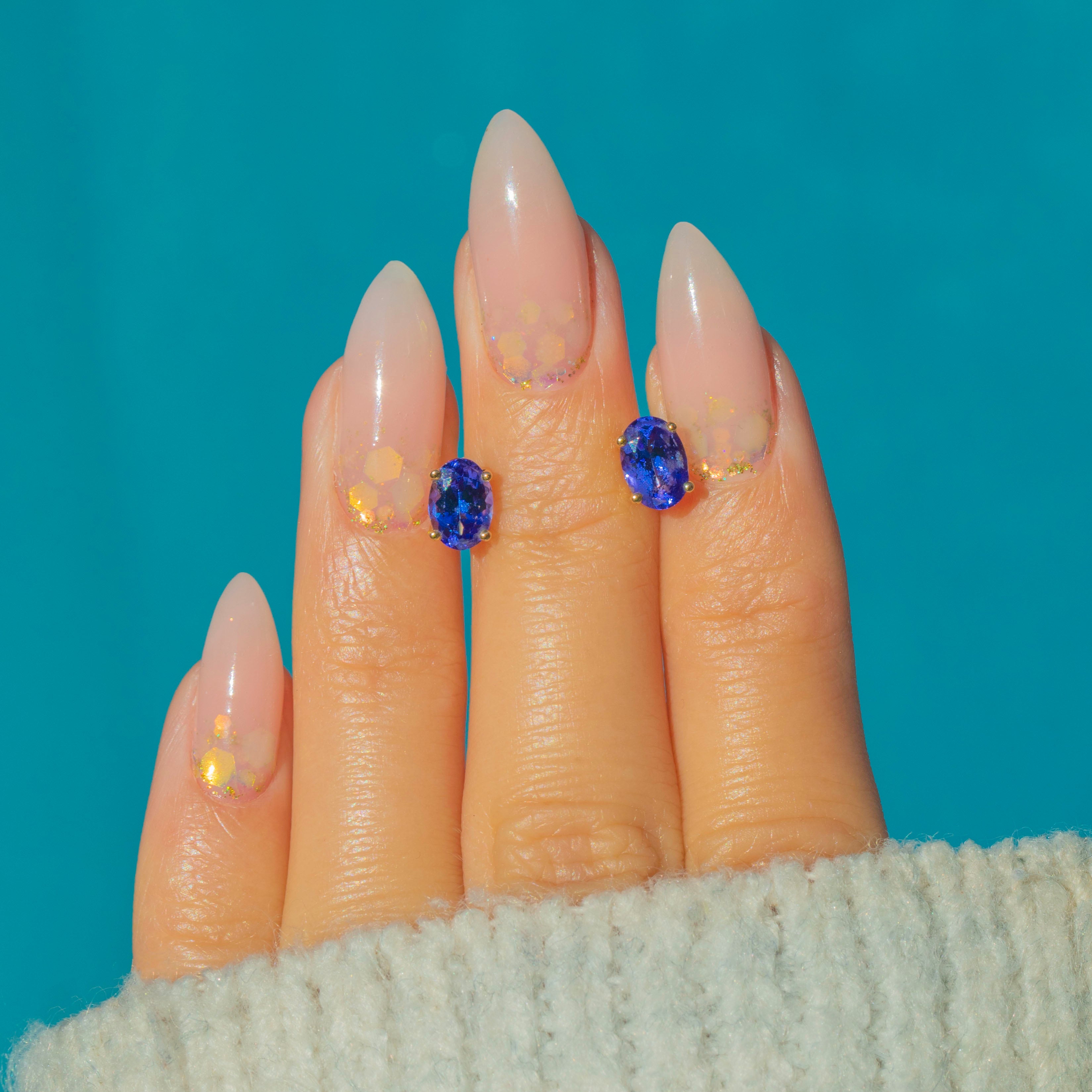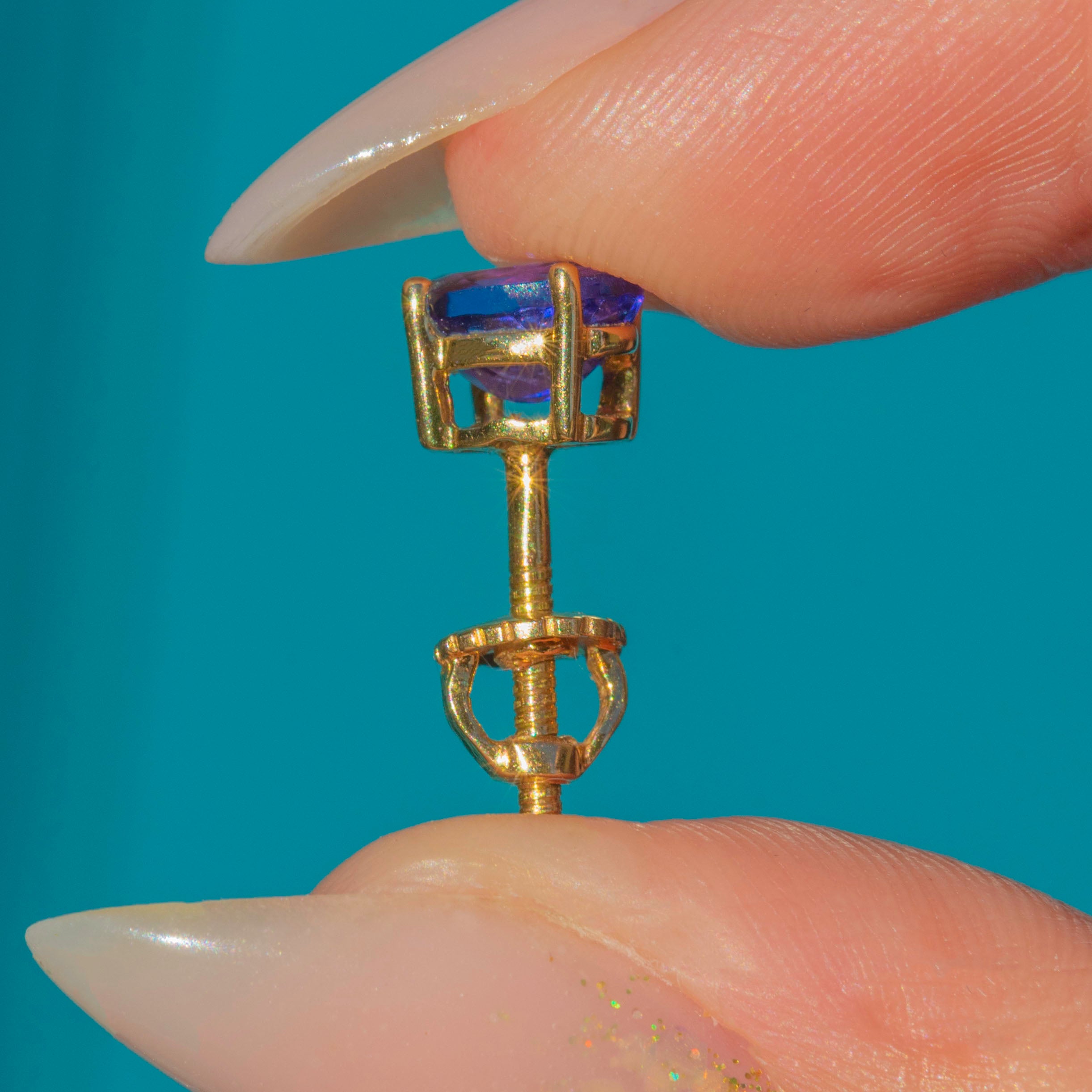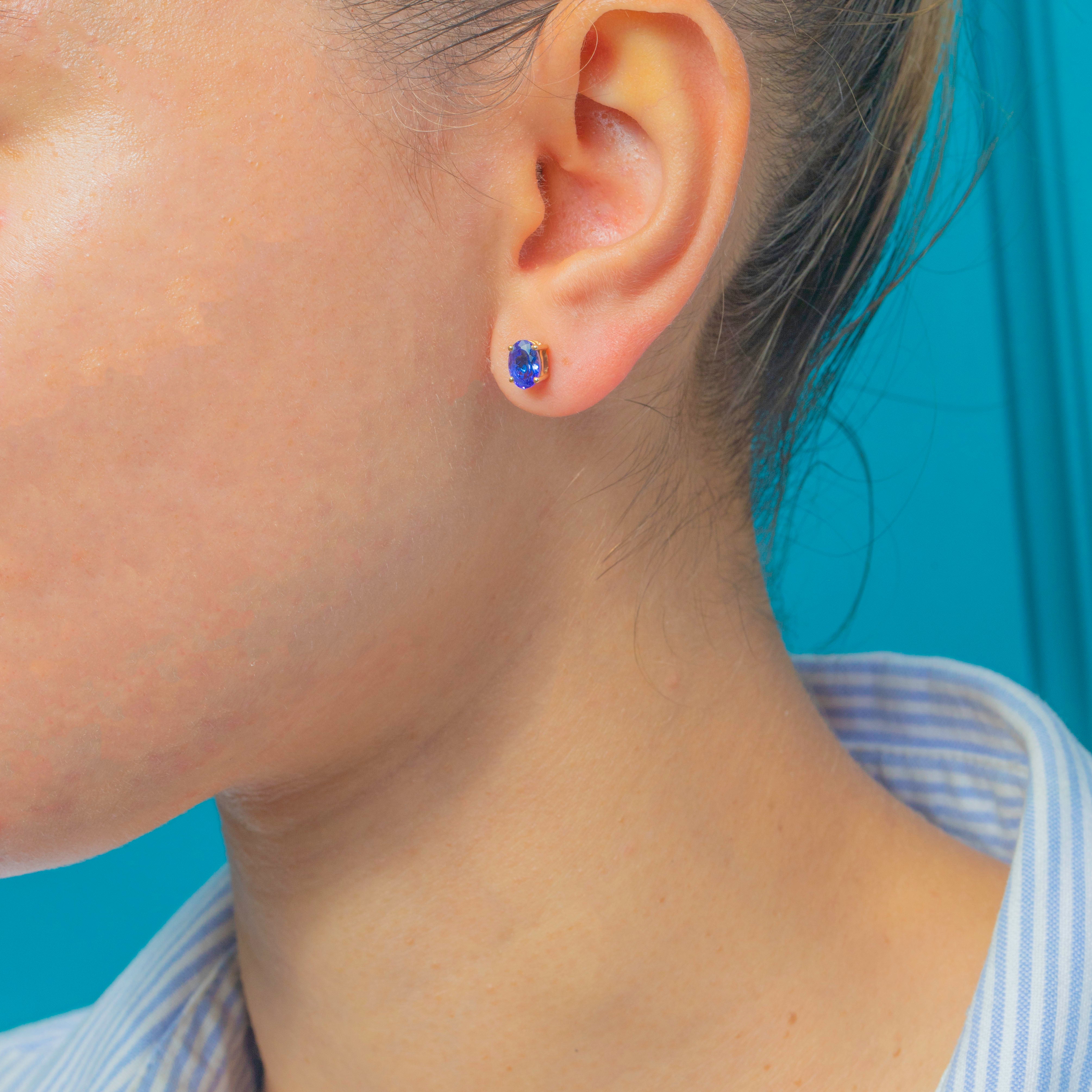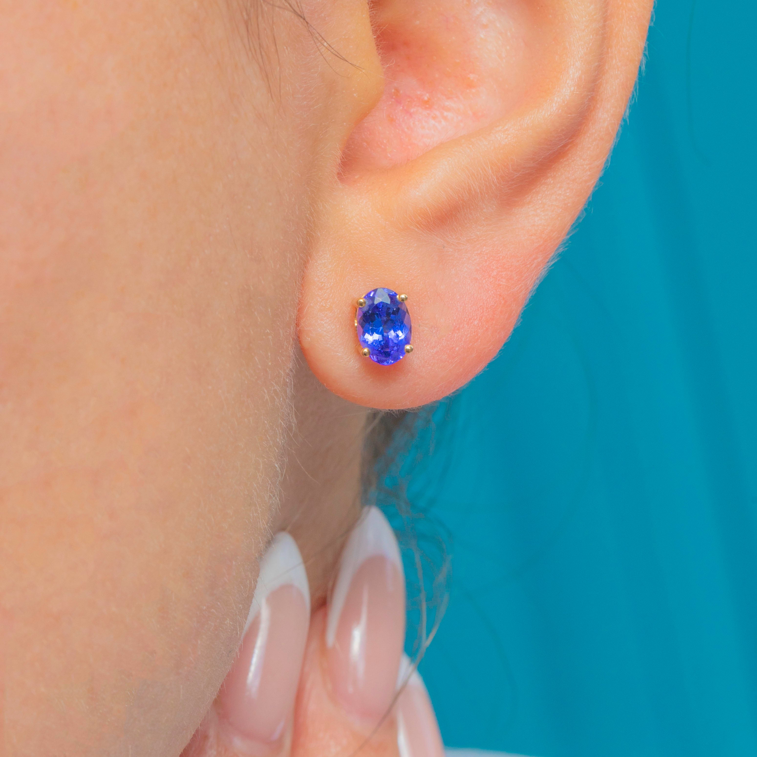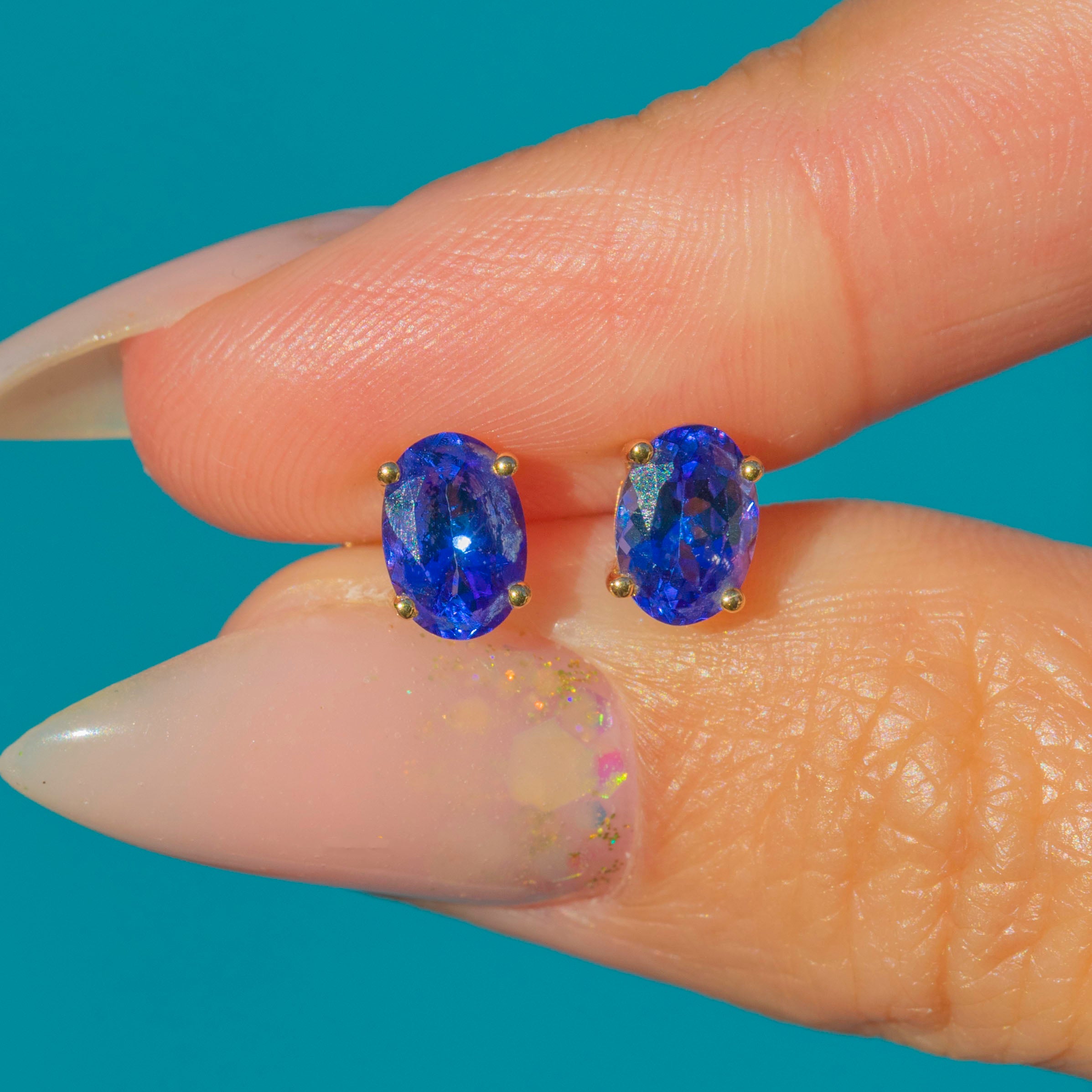 These Vintage Tanzanite stud earrings are a timeless classic, showcasing the unique beauty of this rare gemstone. Each earring is set with an oval-cut Tanzanite, glowing with a vivid violet-blue hue that Tanzanite is so admired for. The stones are well-matched, lively, and full of sparkle, making them an effortlessly elegant choice for both everyday wear and special occasions.