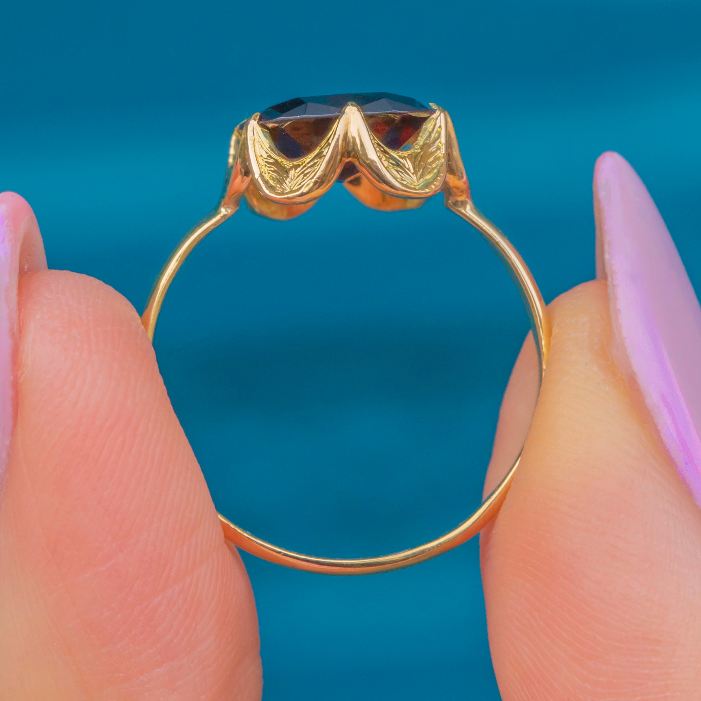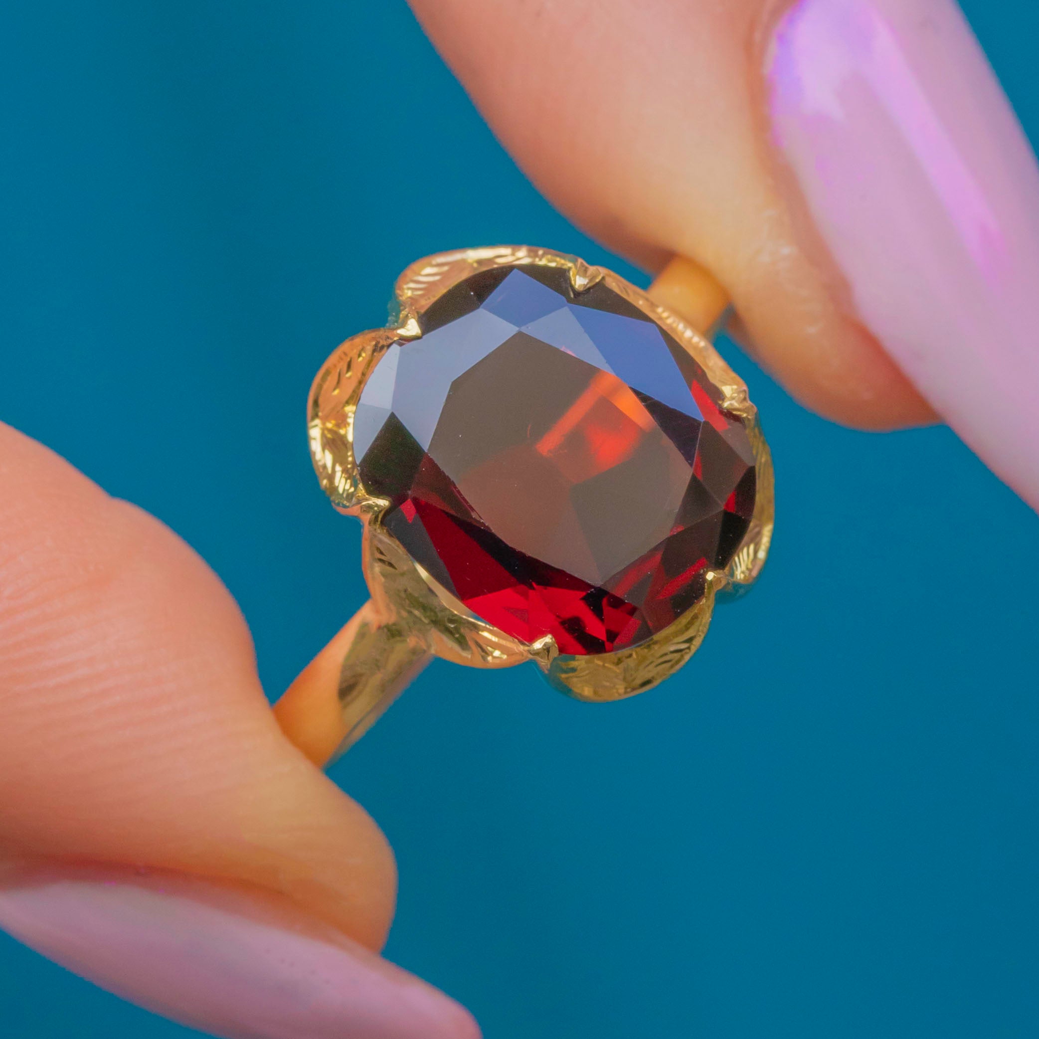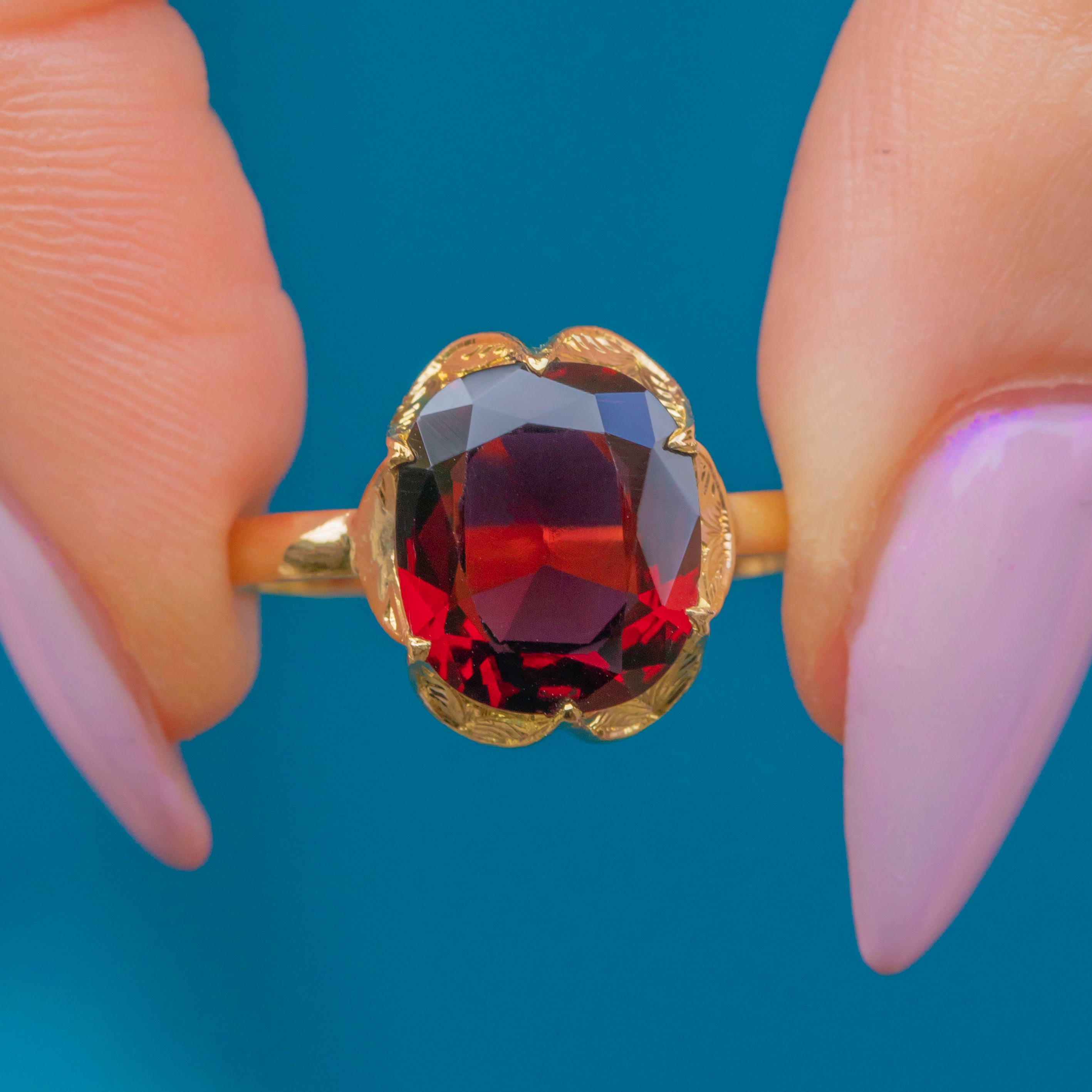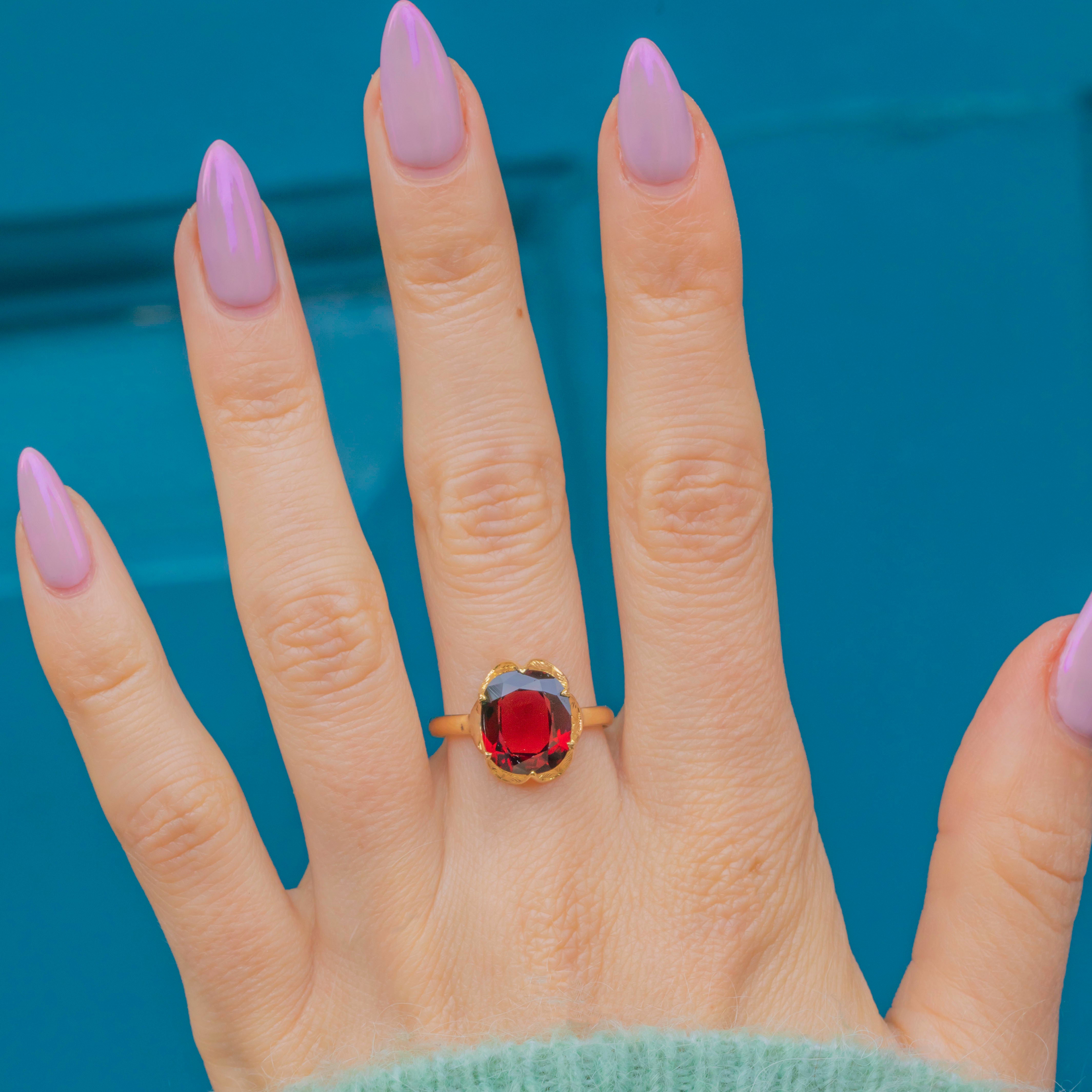 This striking Victorian ring showcases a richly coloured 6.00ct Garnet, glowing with deep wine-red tones that contrast beautifully against its buttery 18ct Gold setting. The gemstone is held within an ornate buttercup-style mount, its softly scalloped petals lending a romantic and feminine silhouette.