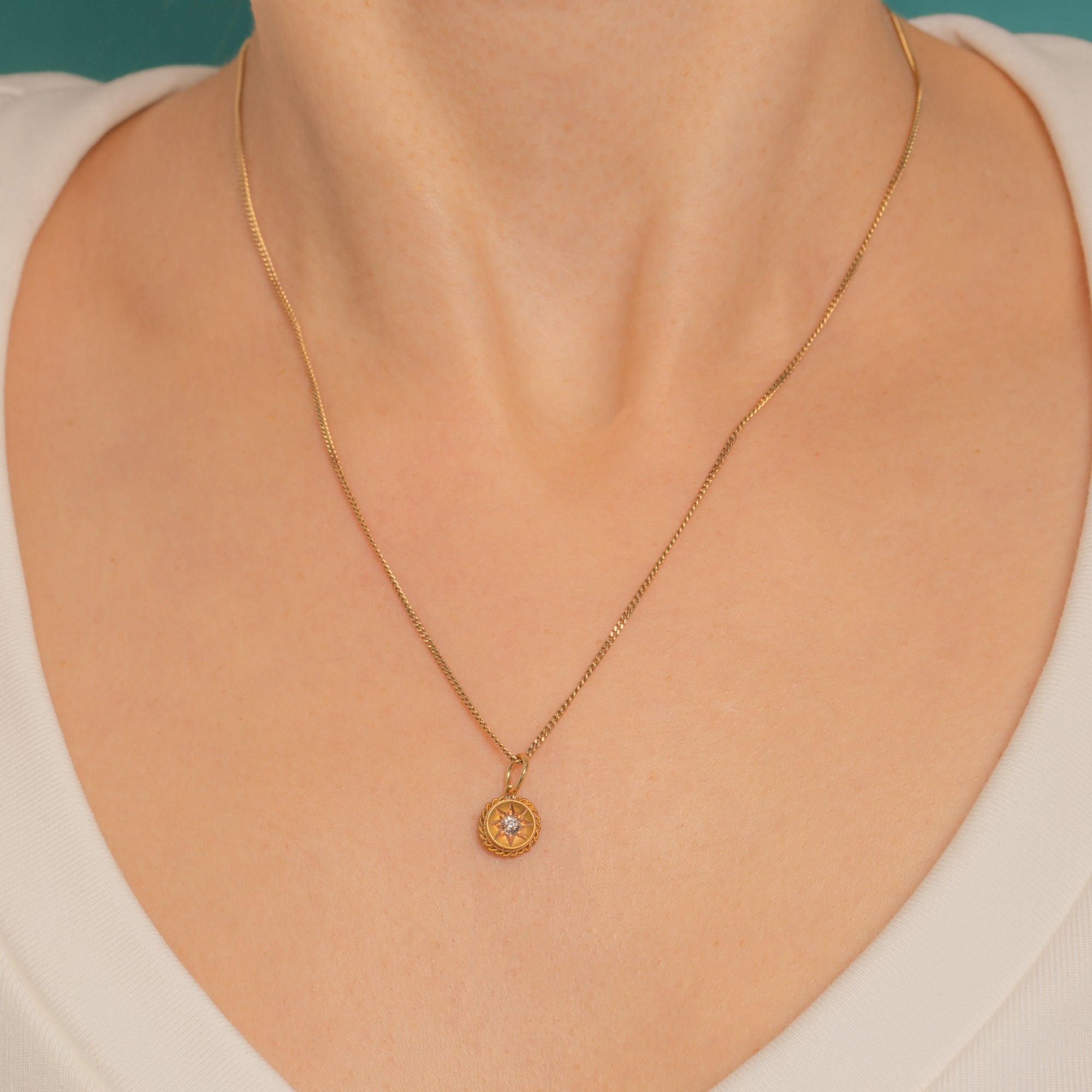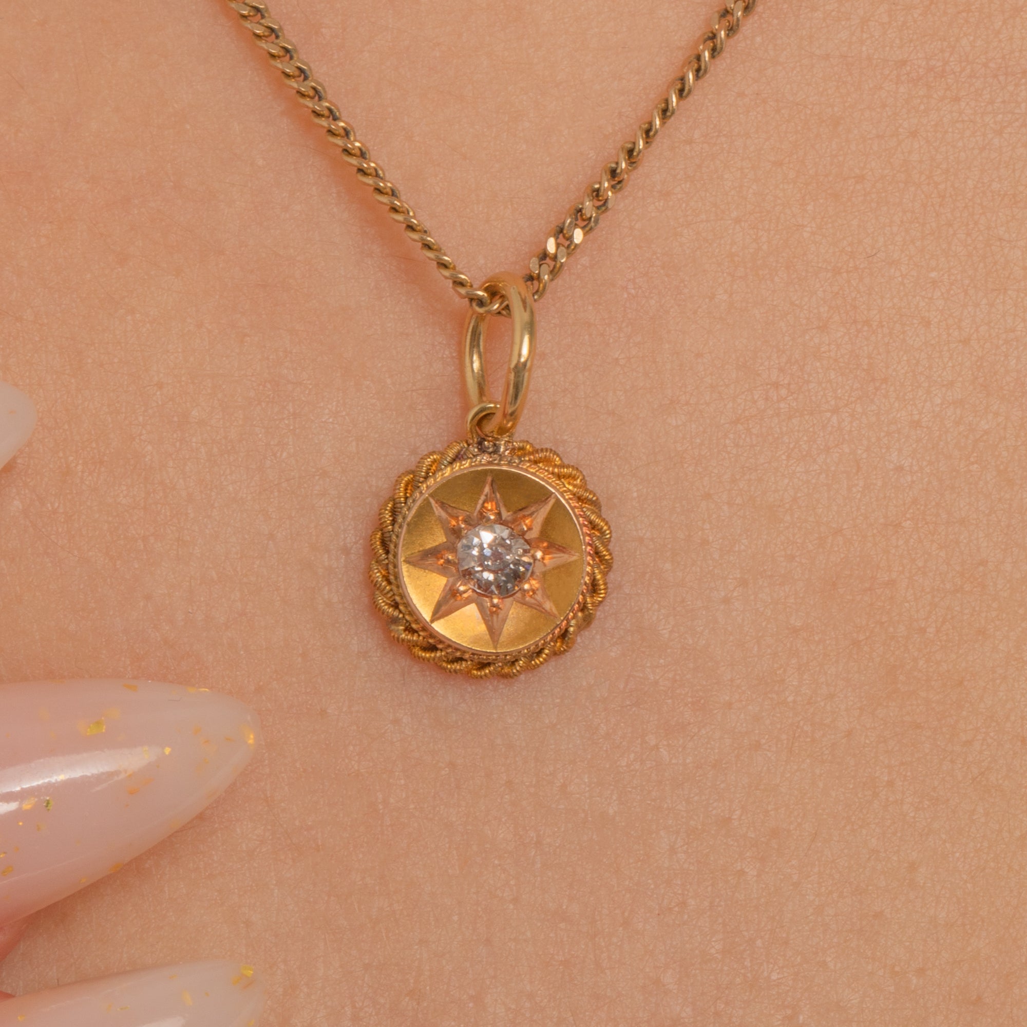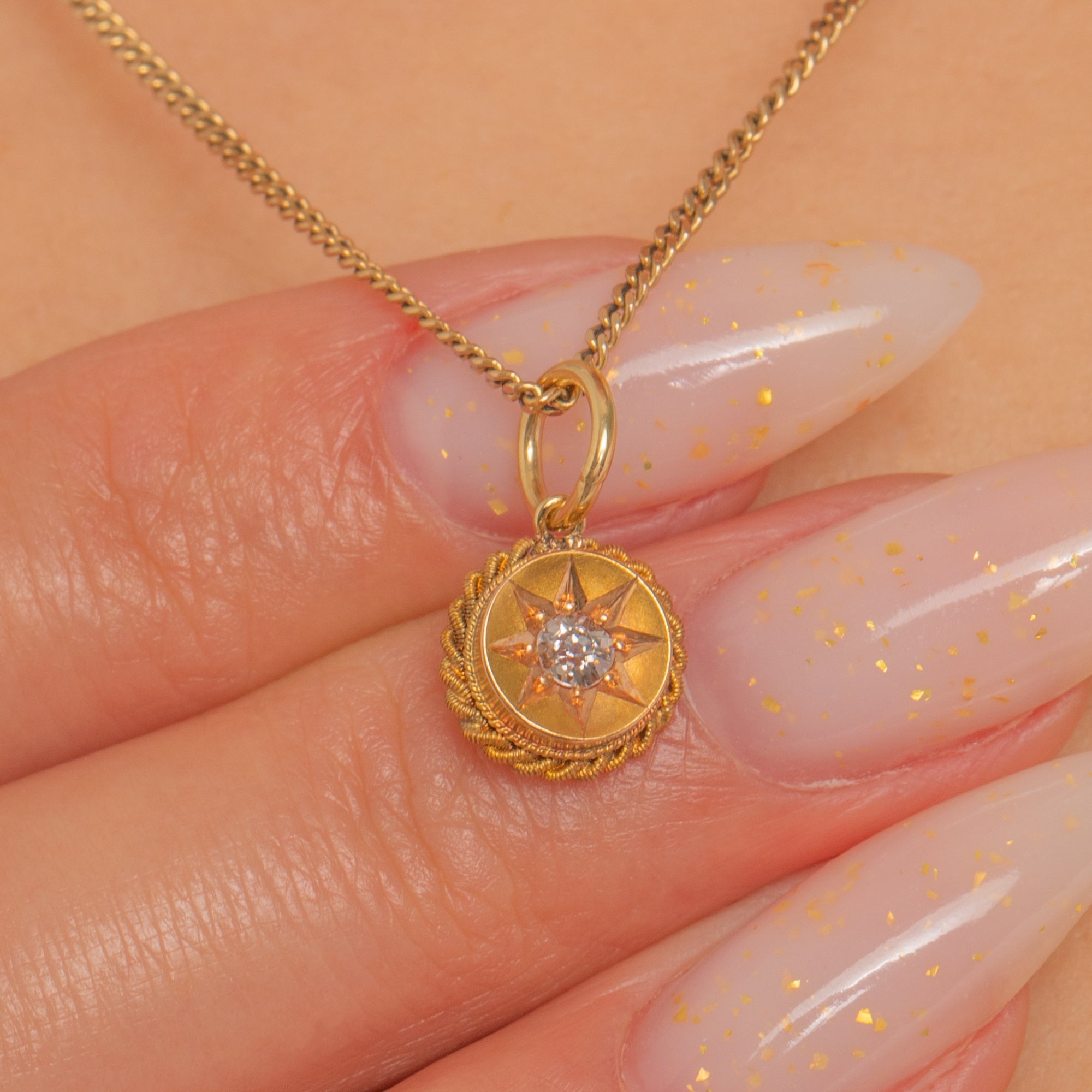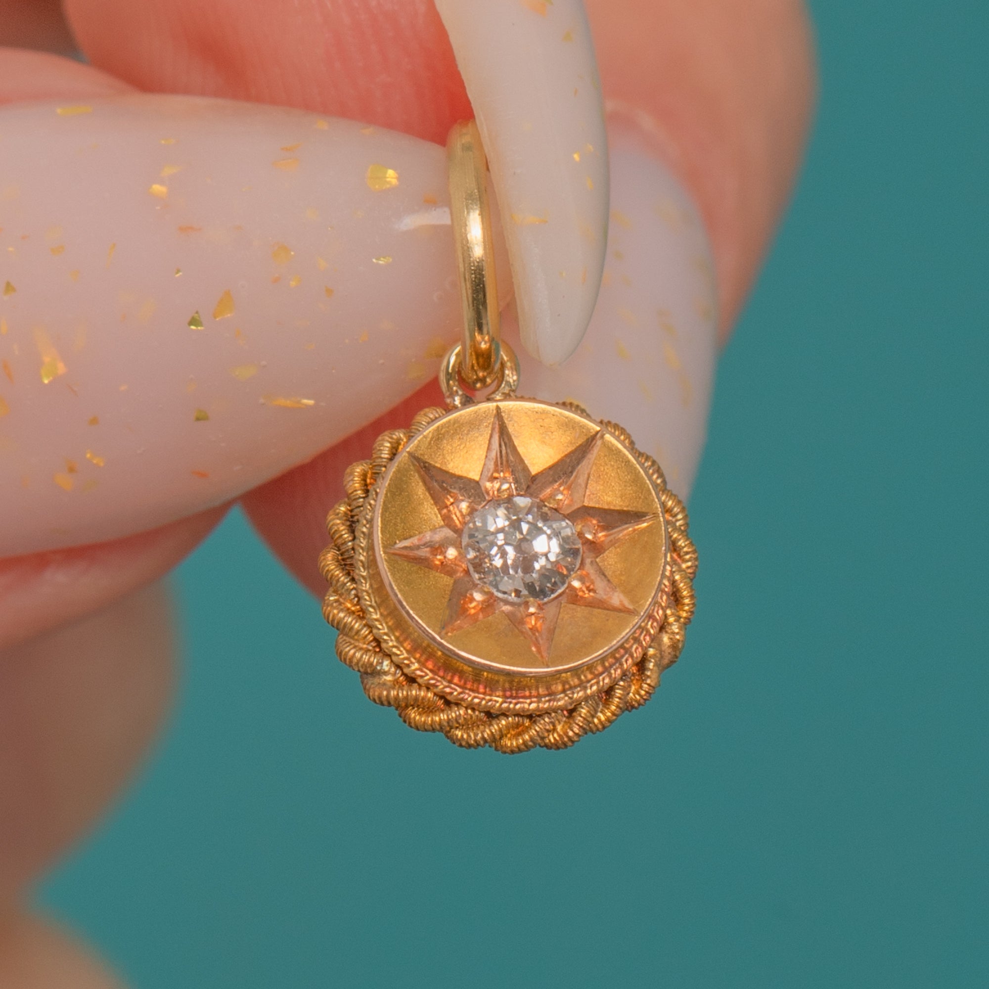 A dainty Victorian treasure in radiant 18ct Gold, this petite round charm is engraved with an eight-point star and set to the centre with a glinting Old Mine Cut Diamond. An applied twisted-rope border frame the star beautifully, creating that much-loved celestial look of the era.