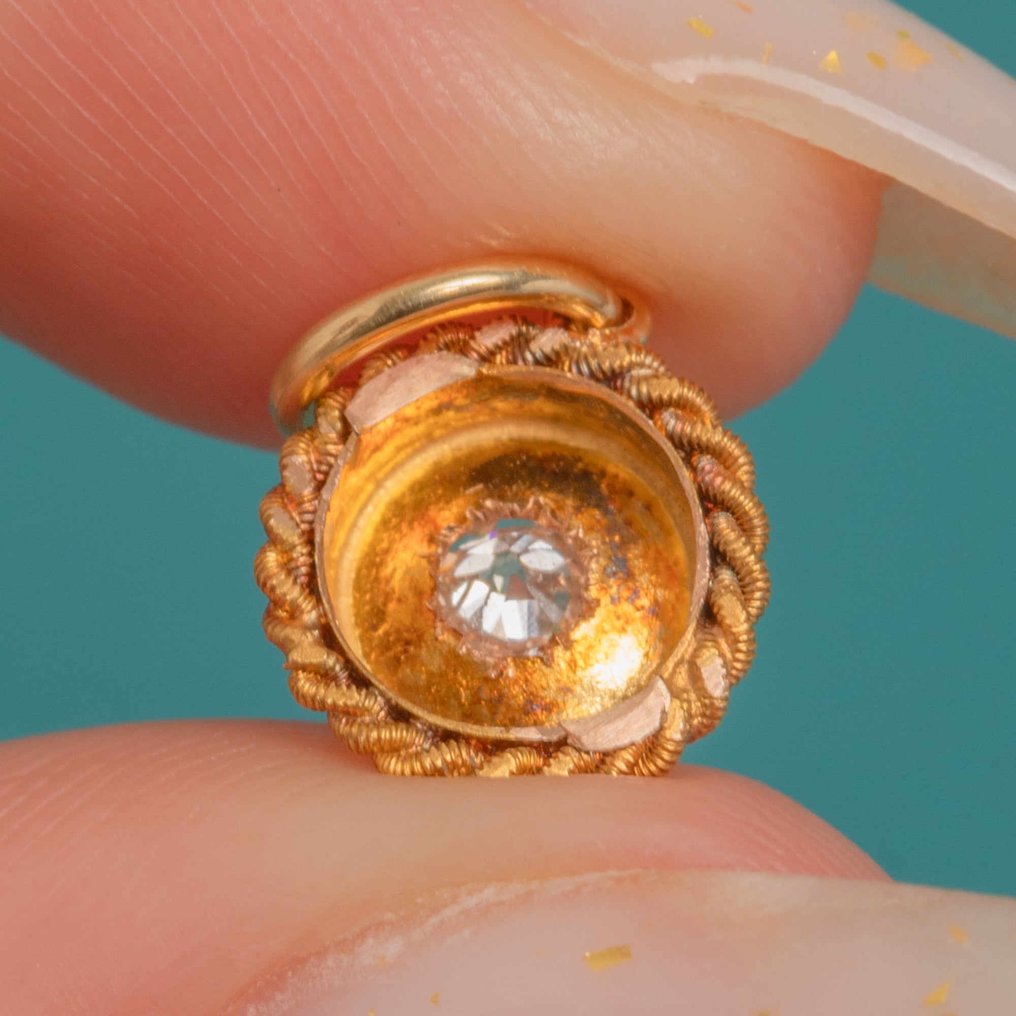 MATERIALS: Tests as 18ct Gold, Old Mine Cut Diamond (0.03ct).