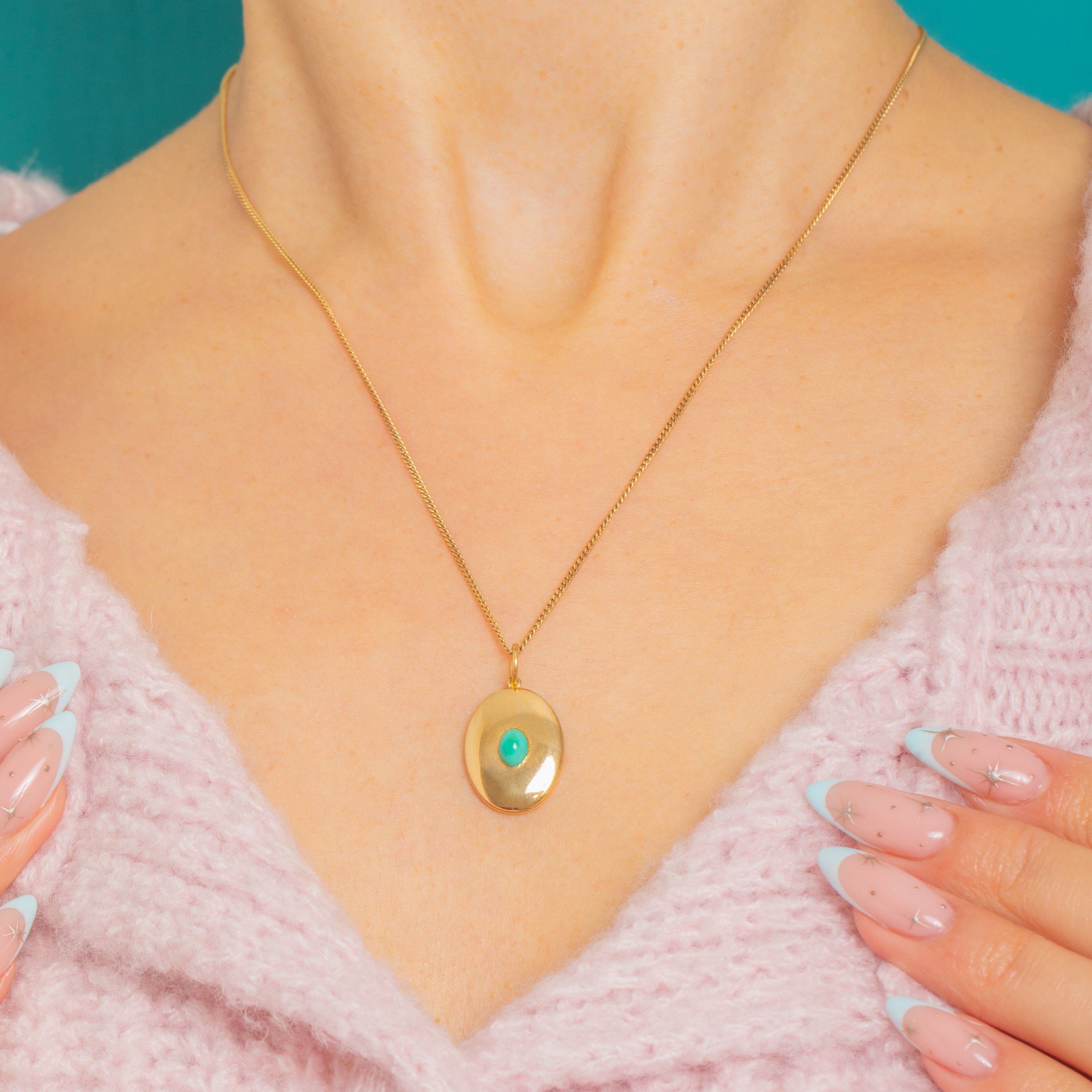 A refined Victorian disc charm in rich 18ct Gold, set with a single Turquoise cabochon at its heart. The domed oval plaque and smooth flush setting create a serene “bullseye” focus, letting the blue‑green Turquoise glow against the high‑polish Gold.