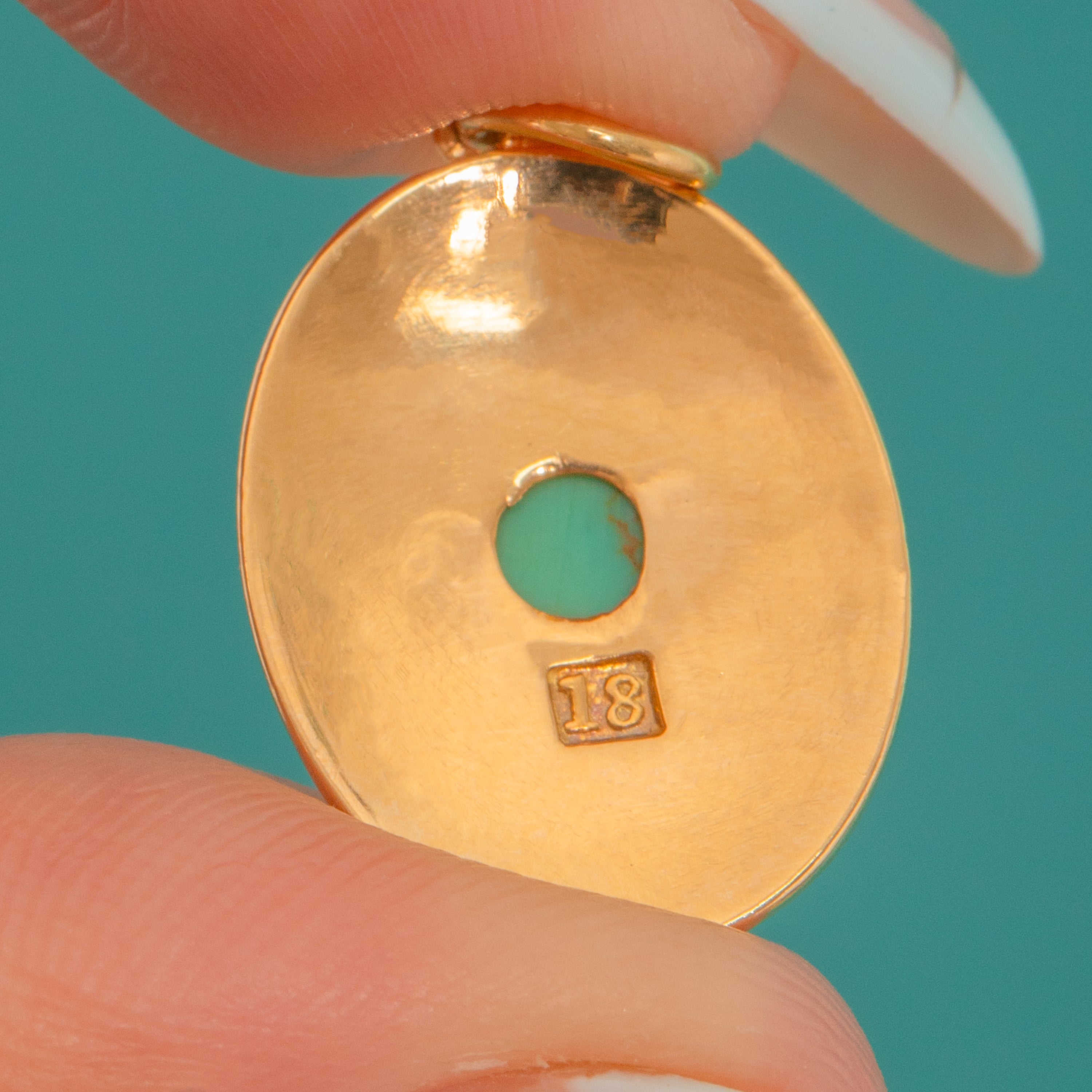 VERY GOOD: The Turquoise cabochon is intact with no obvious chips or cracks, presenting cleanly in the setting. The 18ct Gold shows a bright polish with light surface hairlines from wear; the hasp and jump ring are secure. Overall well cared for with gentle age-appropriate wear visible under close inspection.