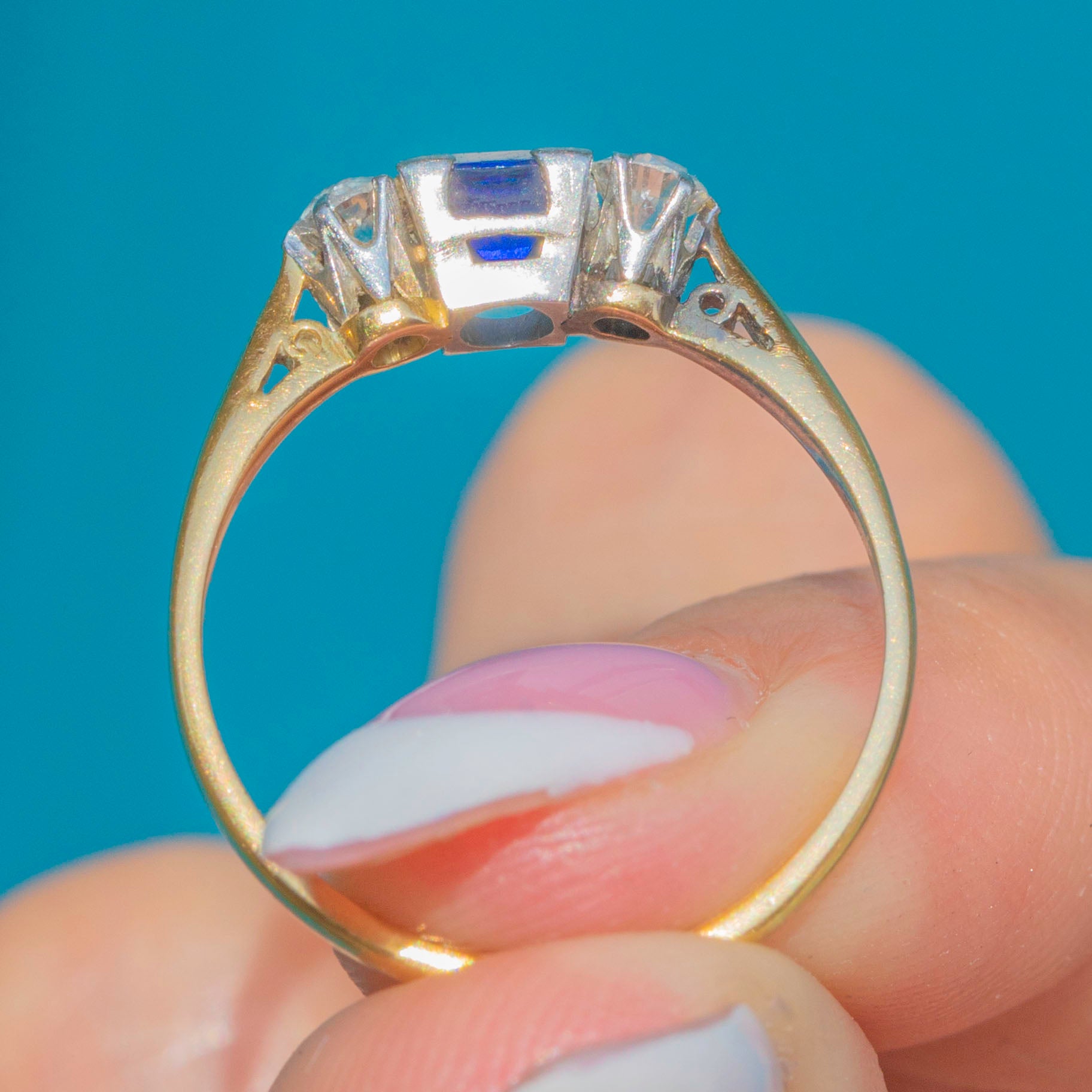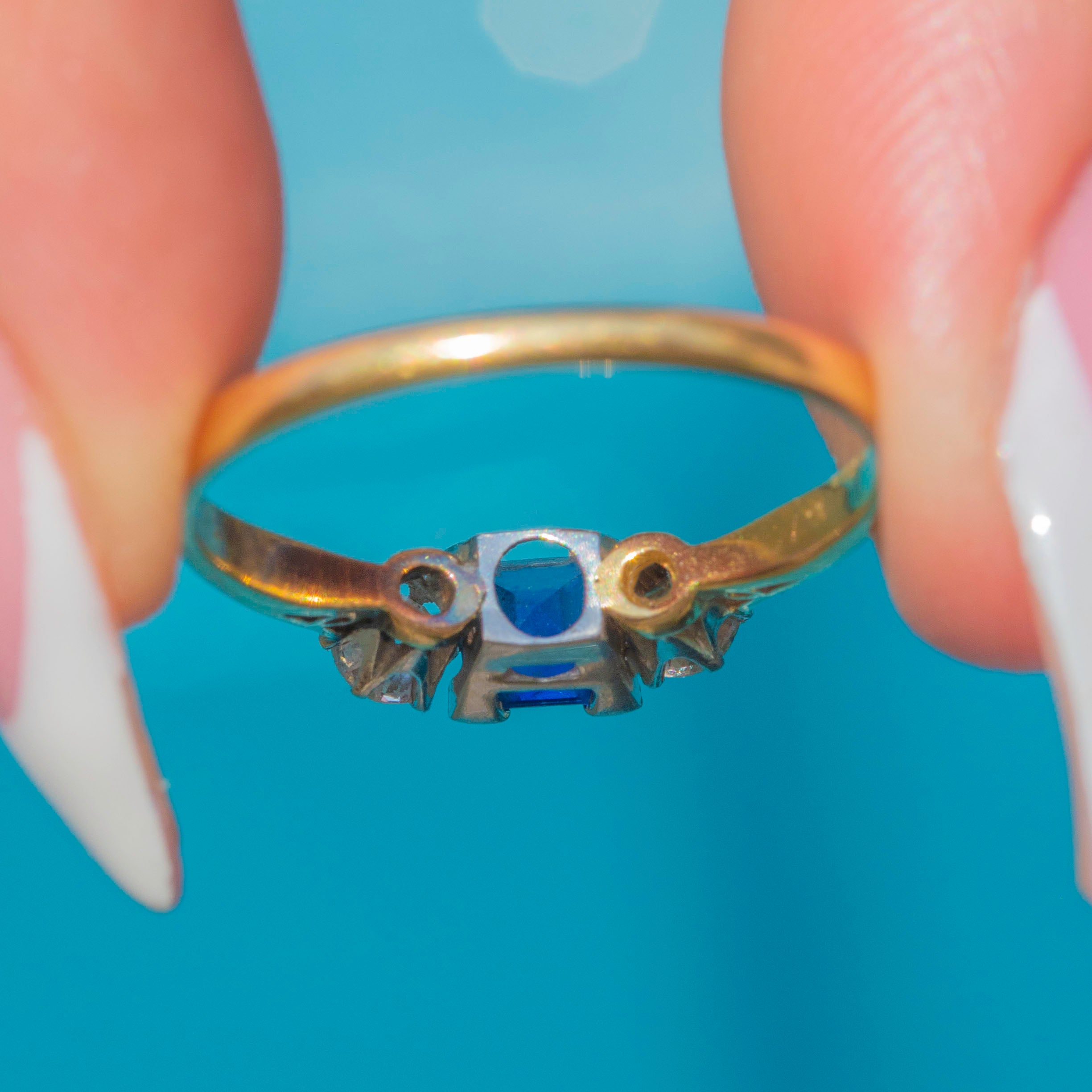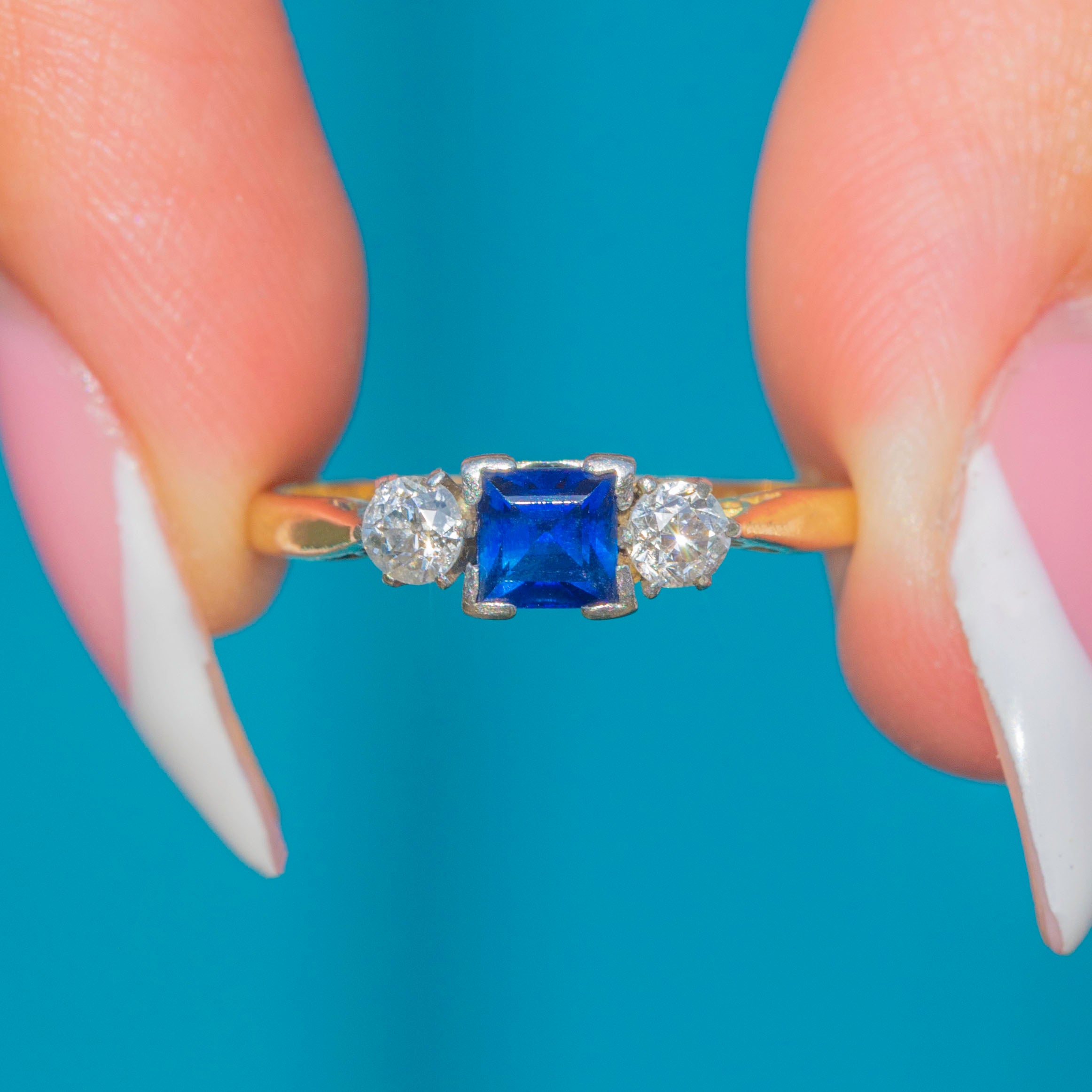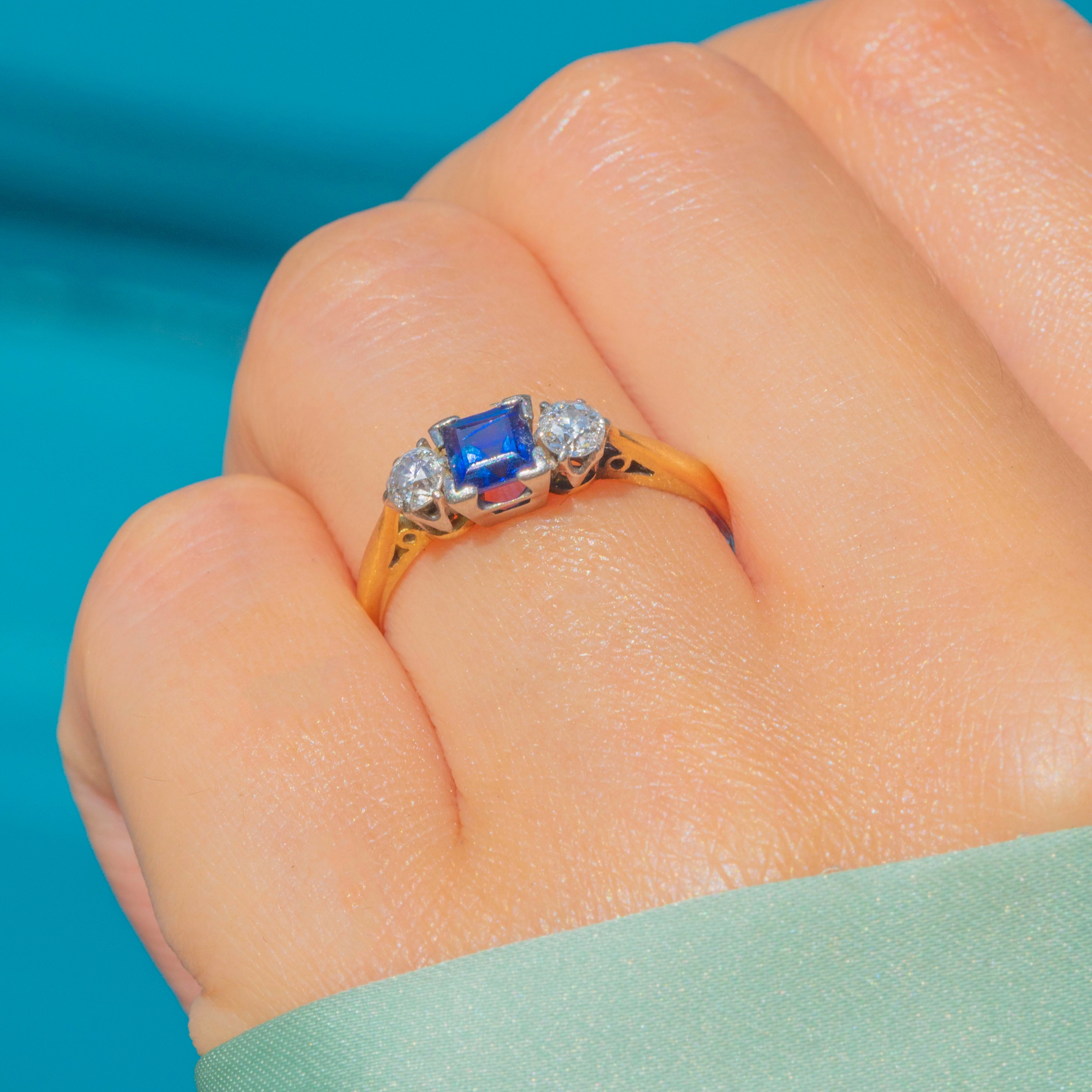 This charming Art Deco 18ct Gold trilogy ring is set with a vivid square-cut Sapphire flanked by two sparkling round brilliant-cut Diamonds.