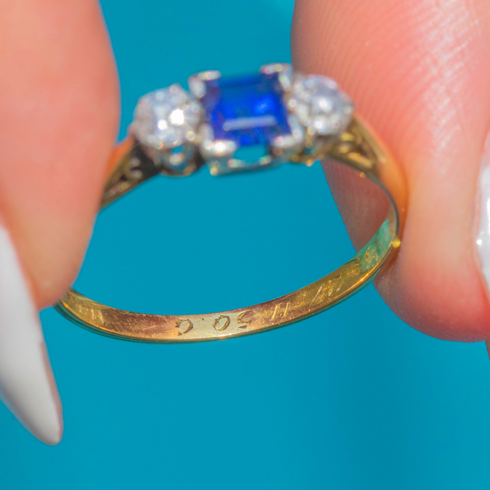 MATERIALS: Tests as 18ct Gold, Sapphire, Diamond