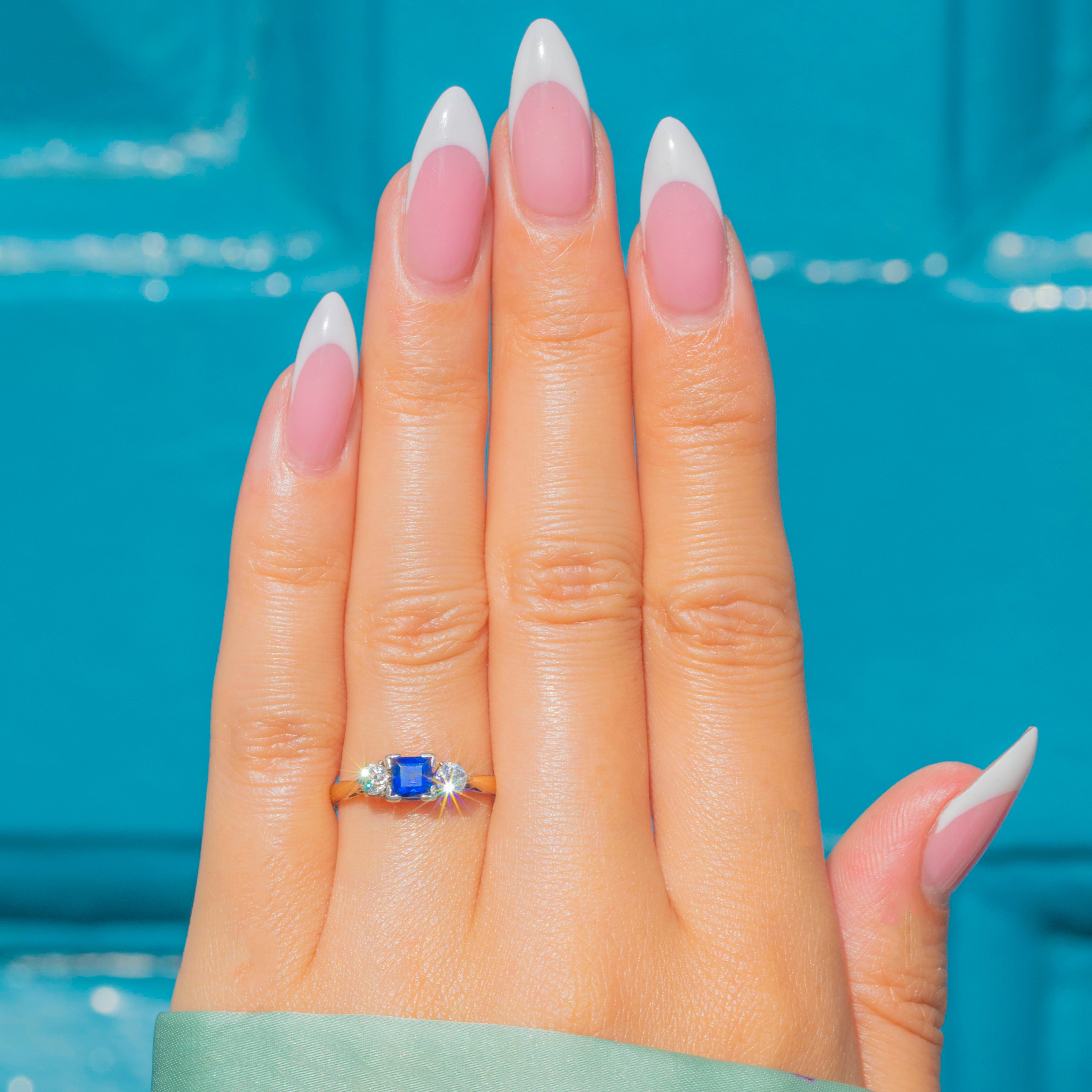 EXCELLENT: This ring is in excellent condition, with no chips, scratches, or abrasions to any of the gemstones. The Diamonds are bright and lively, and the Sapphire retains its rich, vibrant colour and clarity. The band and settings are secure and smooth, showing minimal signs of wear and presenting beautifully overall.
