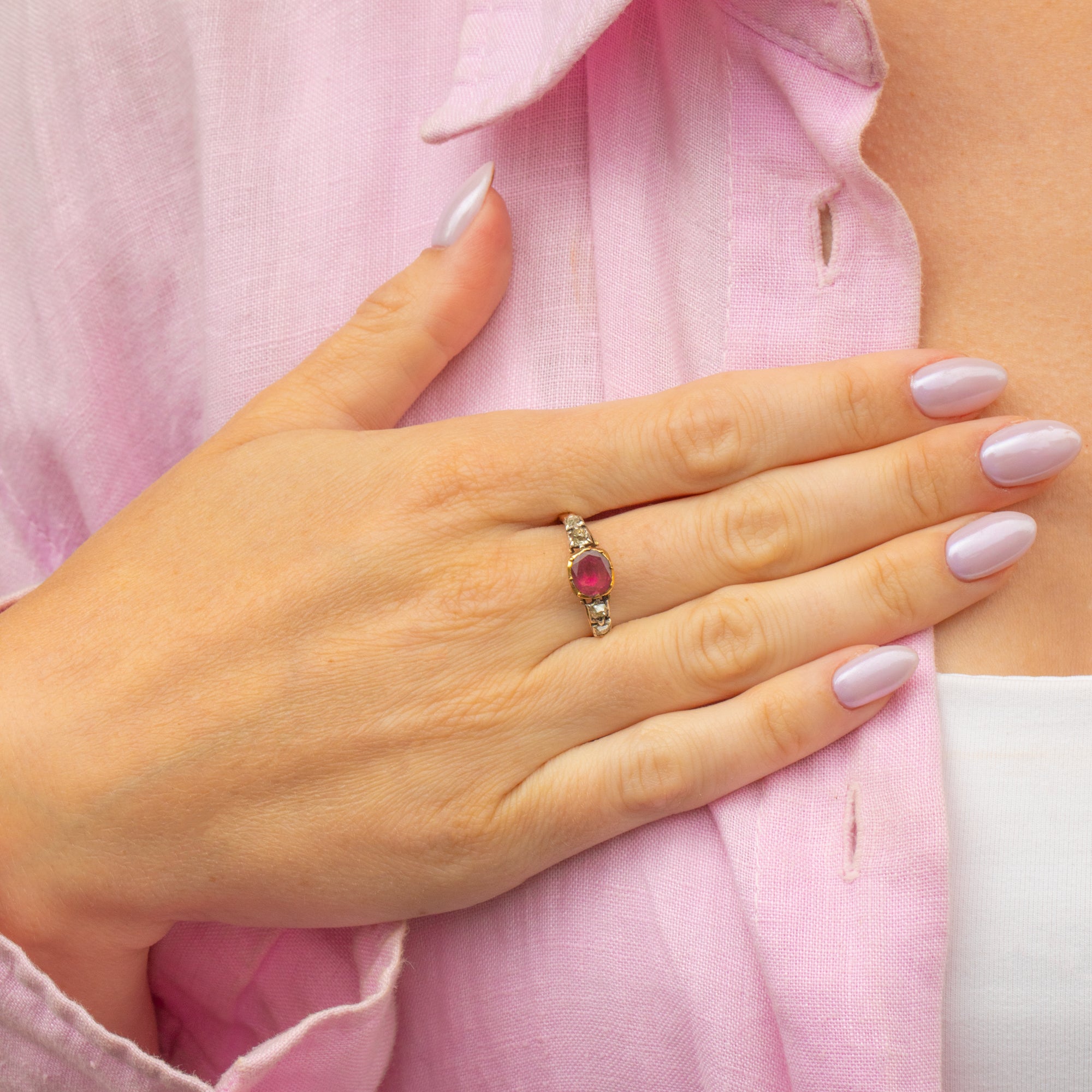 The Garnet has a delicious berry red hue, hugged by a sparkling selection of table-cut and old-mine-cut Diamonds. The piece has piecrust settings, c-curl flourishes and a ridged closed dome back that are so typical of the time, her beauty is timeless! This rare Georgian delight is sure to be added straight to your basket.