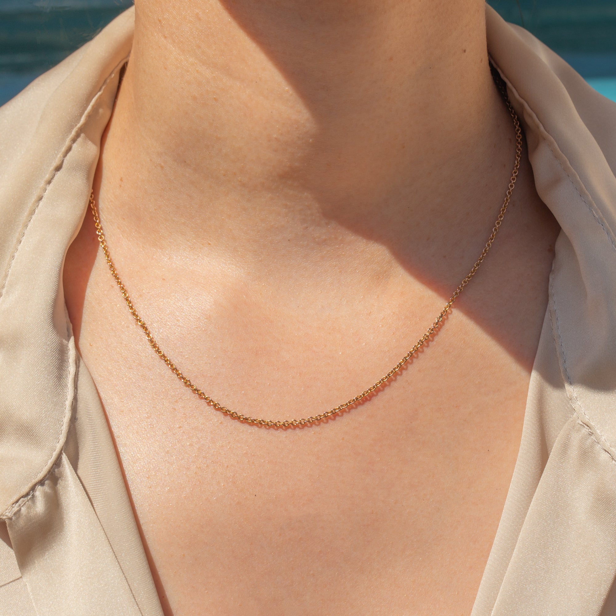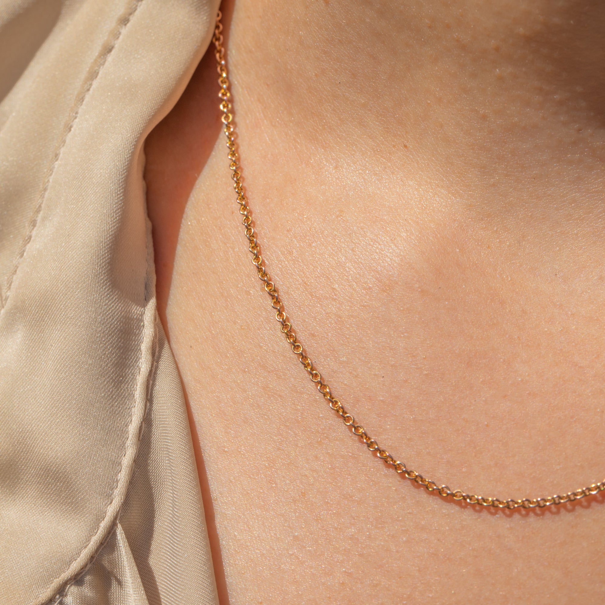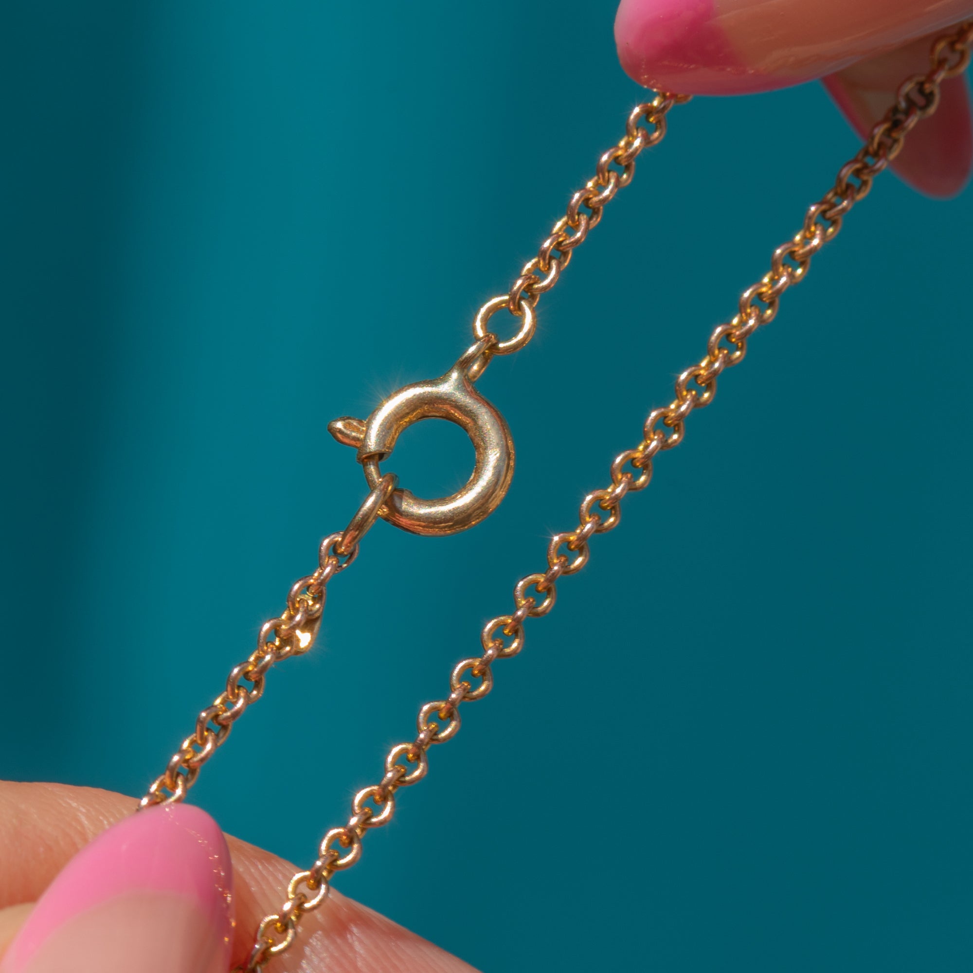 EXCELLENT: This antique 9ct Gold tagged skinny pendant chain is in wonderful condition. Each of her links is uniform and secure, and her bolt-ring is in perfect working order. With little else to note, she's a must-have!