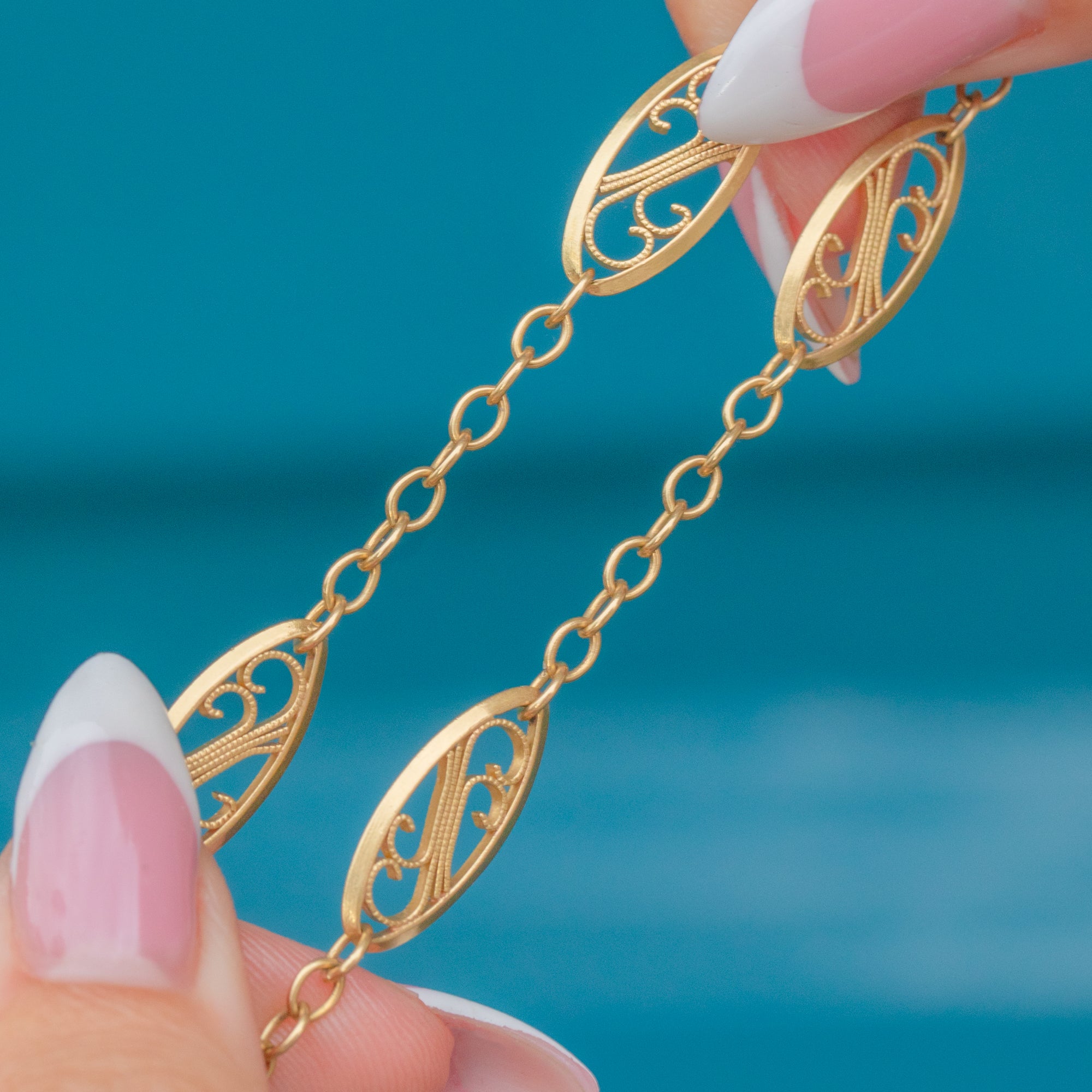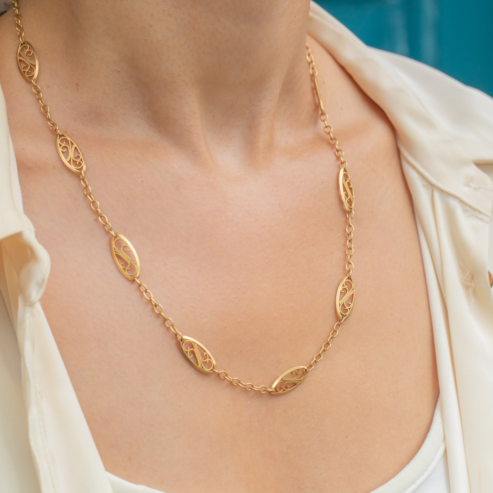 This French Belle Époque chain is all about elegant movement: fancy marquise links with delicate filigree details, wrought in rich 18ct Gold. The elongated silhouettes catch the light beautifully and sit fluidly against the skin for a refined, unmistakably antique look.