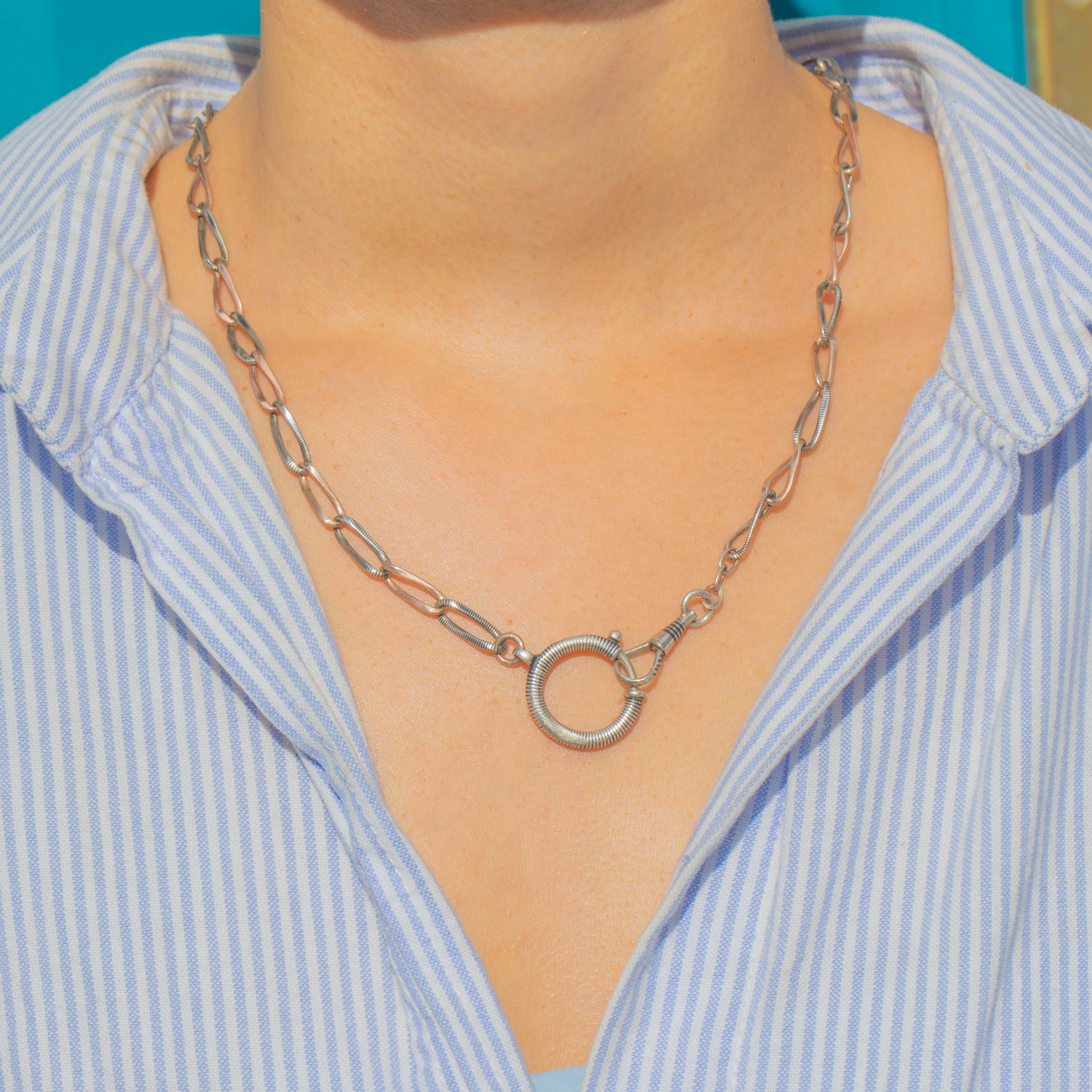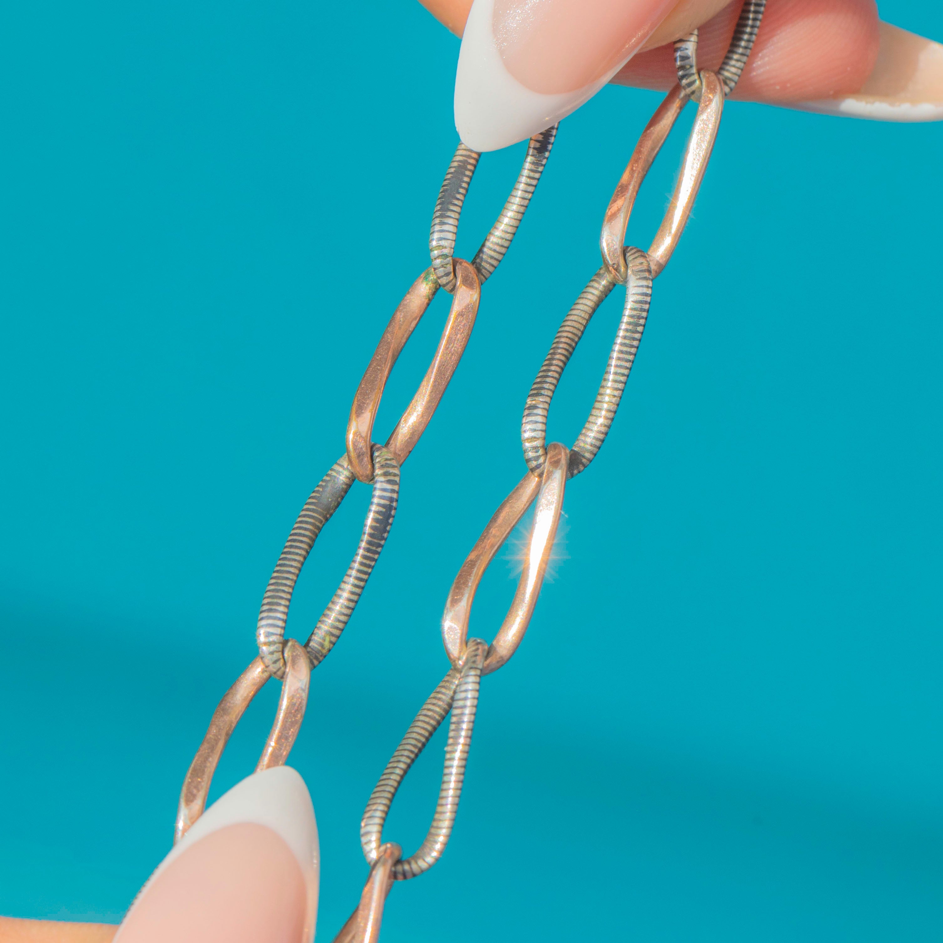 This antique Victorian necklace is crafted in Silver and decorated with striking black Niello. The elongated oval links are detailed with fine ridged engravings, giving the chain depth and texture, while the contrasting black Niello lends a bold, graphic appeal. Completing the necklace is a large 20mm bolt-ring clasp, both practical and stylish, ideal for attaching a pendant or locket.