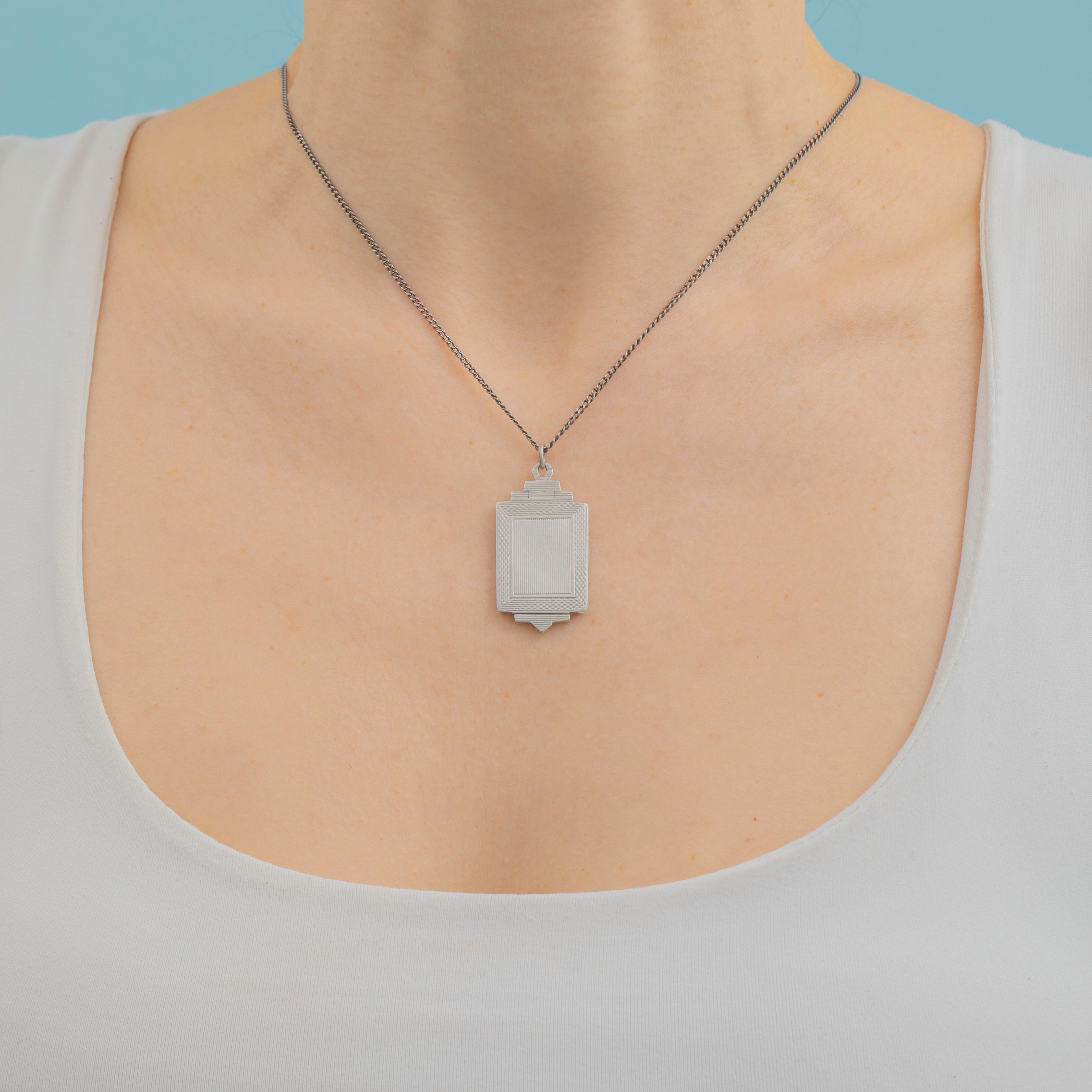 This striking Art Deco silver engraved rectangular locket beautifully captures the elegance of its era. Boasting finely engraved lines within a bold geometric design, this Art Deco locket perfectly captures the craftsmanship of the early 20th century.
