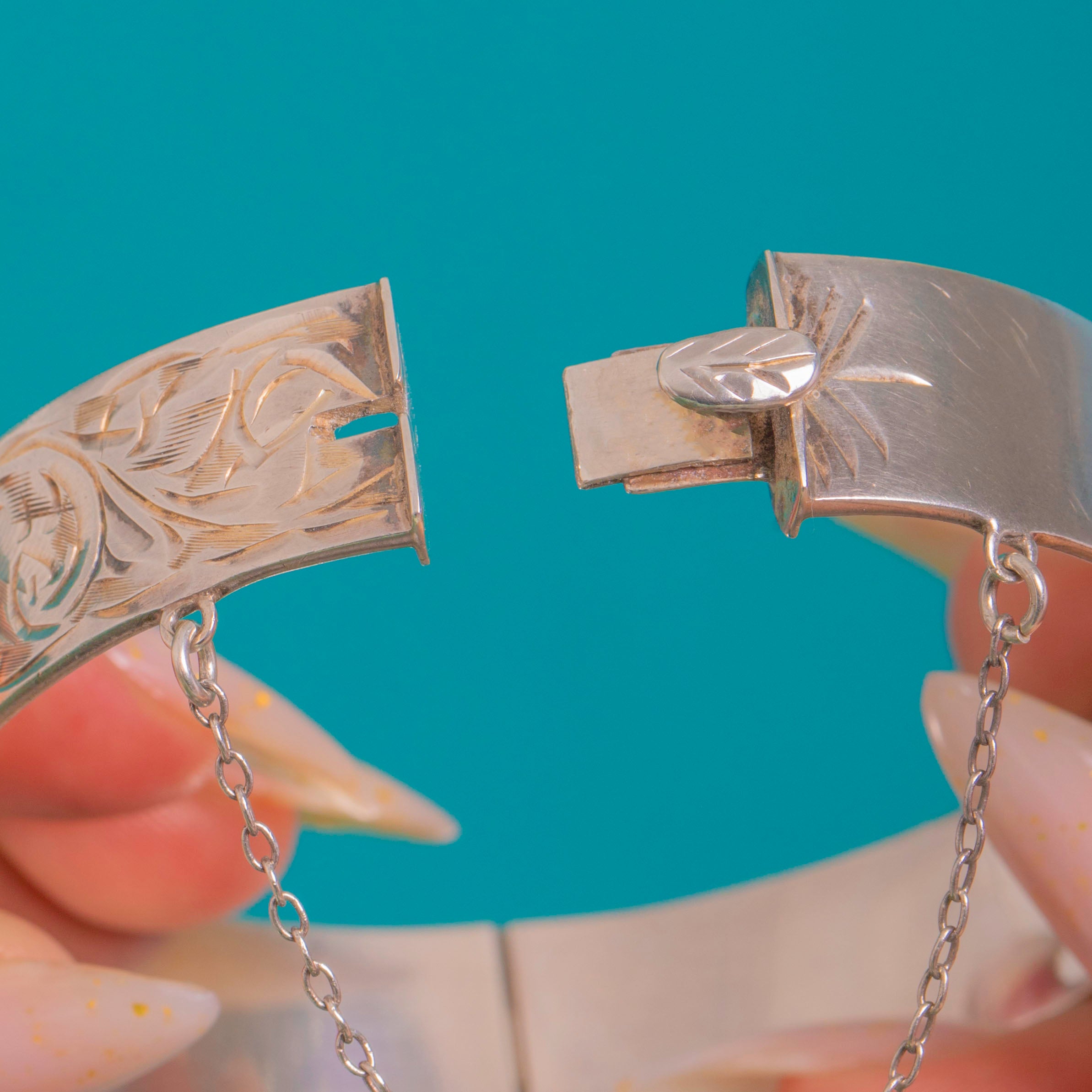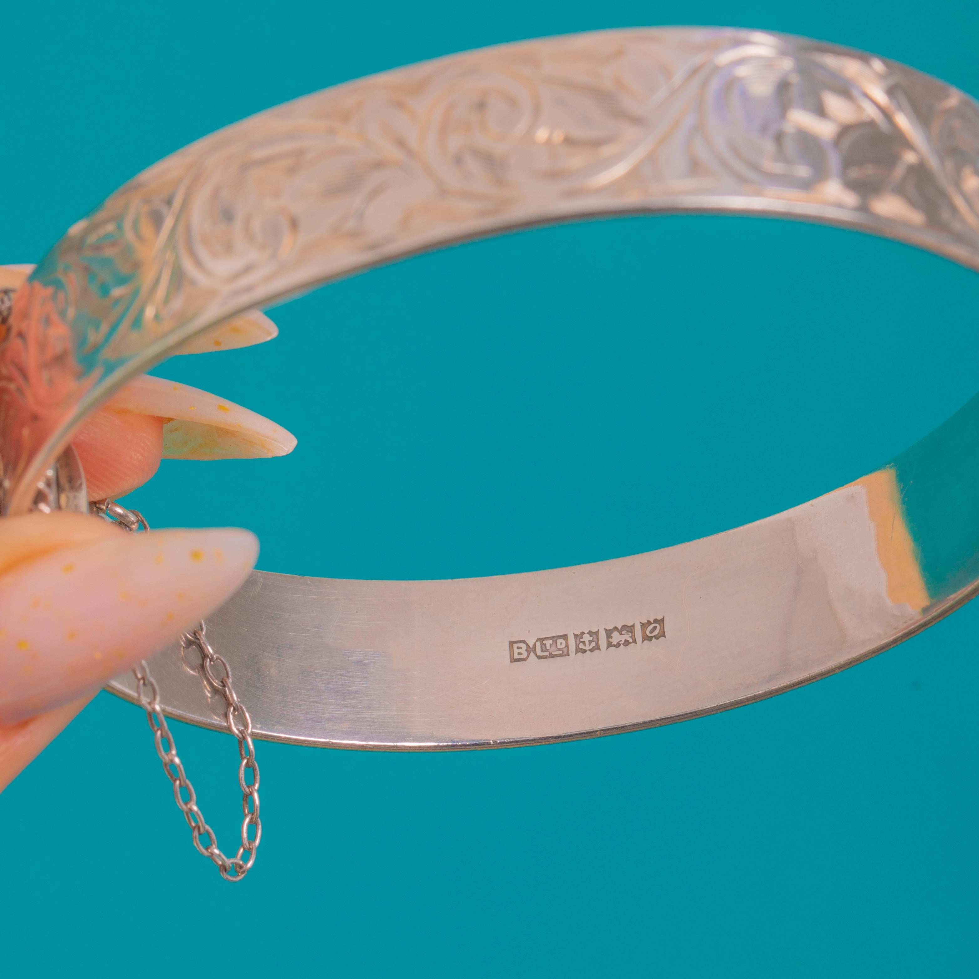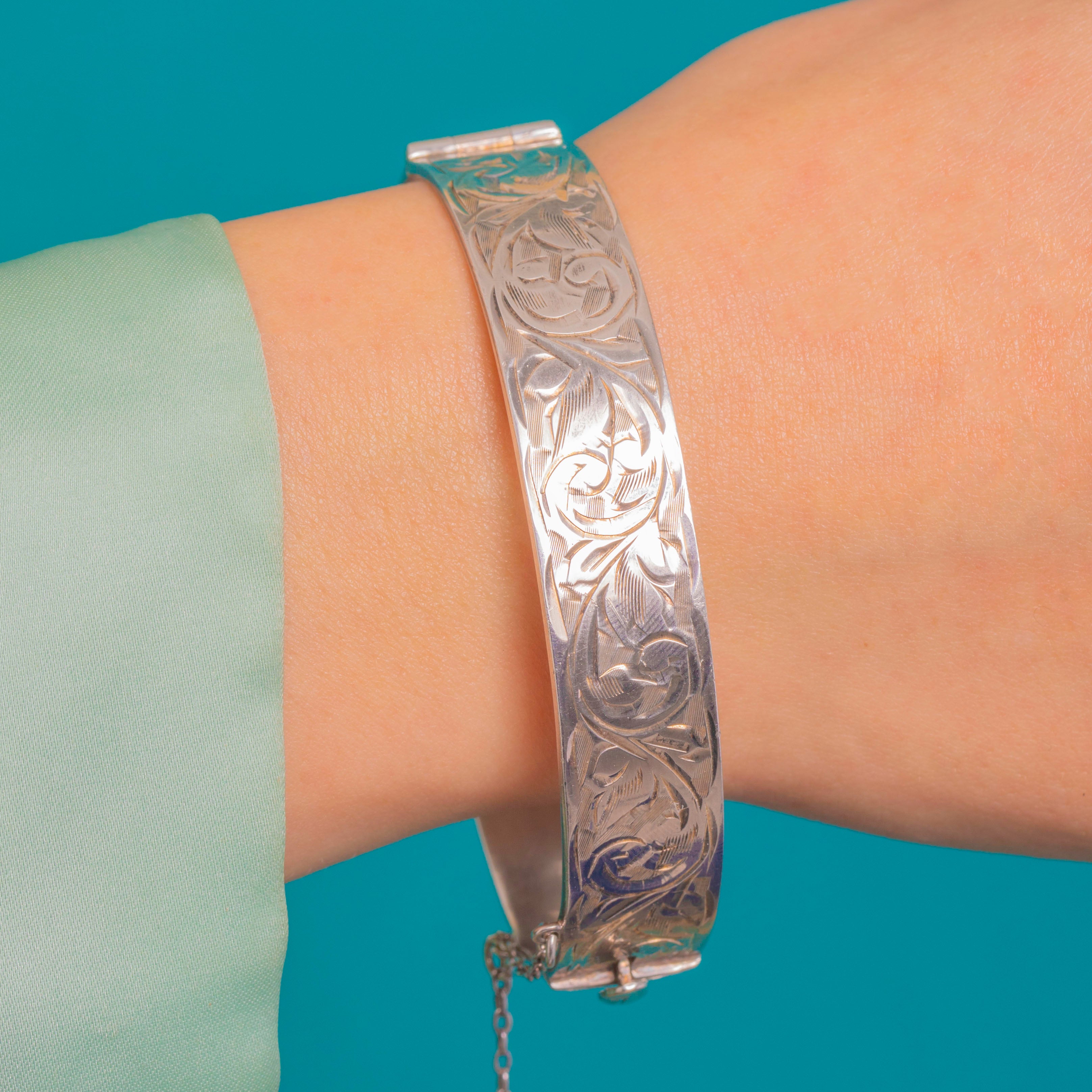 Elegantly engraved and wonderfully wearable, this 1960s Sterling Silver hinged bangle showcases crisp bright-cut foliate and scroll arabesques that shimmer against its polished ground. The decoration is sharp and refined, framed by smooth edges for a sleek, timeless silhouette.